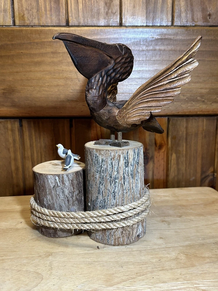 This beautiful wooden sculpture features a pelican standing on a pedestal with two seagulls perched nearby, all meticulously hand-carved. The attention to detail in the carvings is truly remarkable, and the piece would make a stunning addition to any collection of decorative collectibles or sculptures and figurines. The brand of the sculpture is Wooden, and it boasts a number of impressive features including intricate carvings and a lifelike depiction of the subject, a seagull. The piece measures 10.5 inches in height and 9 inches in width, making it a substantial and eye-catching addition to any space.