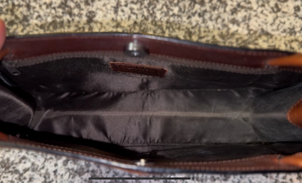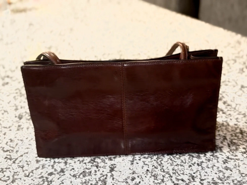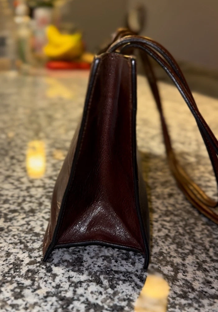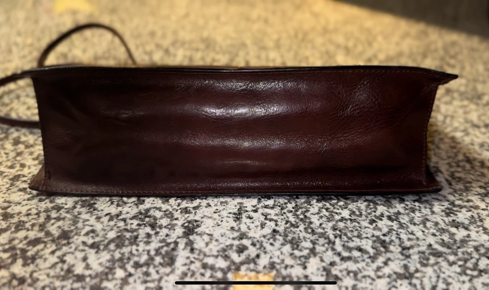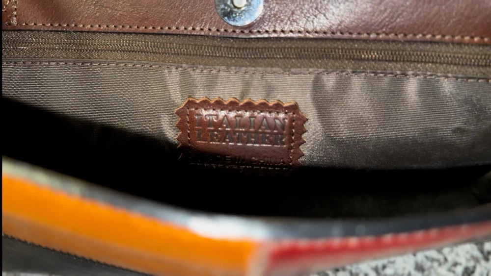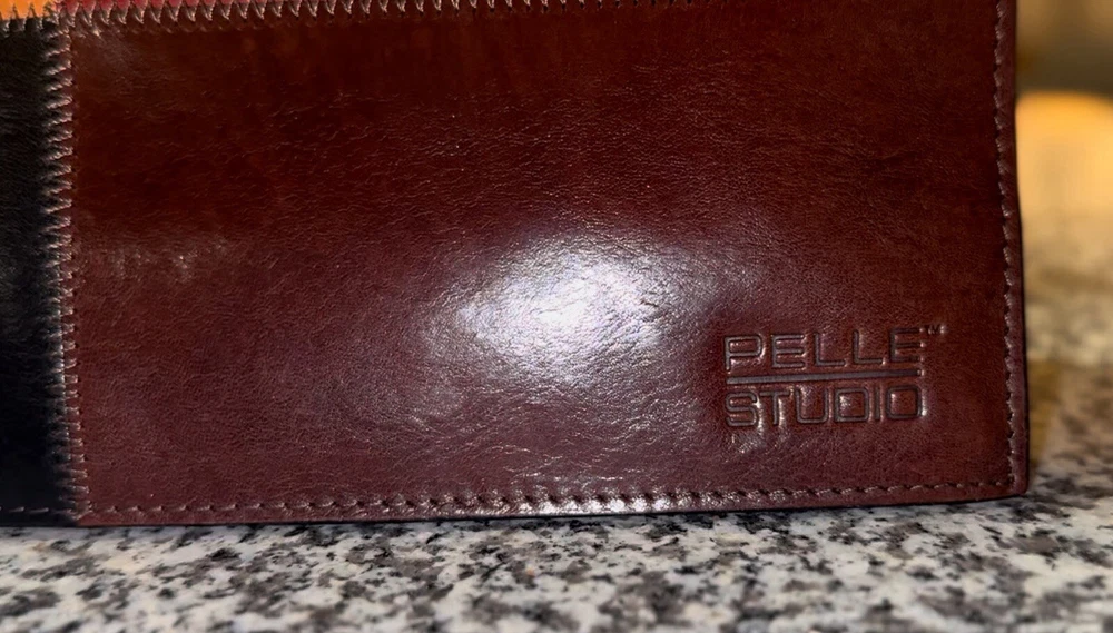 This Pelle Studio vintage leather shoulder bag is a one-of-a-kind accessory that will elevate any outfit. The bag features a colorful colorblock pattern and a rectangular shape with a snap closure. The bag is small in size, measuring 11 inches in width, 11.5 inches in height, and 4.5 inches in depth, making it perfect for carrying your essentials. The bag has a brown leather shoulder strap that complements the overall exterior color. The hardware is also brown in color, adding to the bag's unique aesthetic. The bag's interior is lined with brown canvas and features a variety of compartments to store your belongings. This Pelle Studio bag is a perfect addition to any vintage lover's collection.