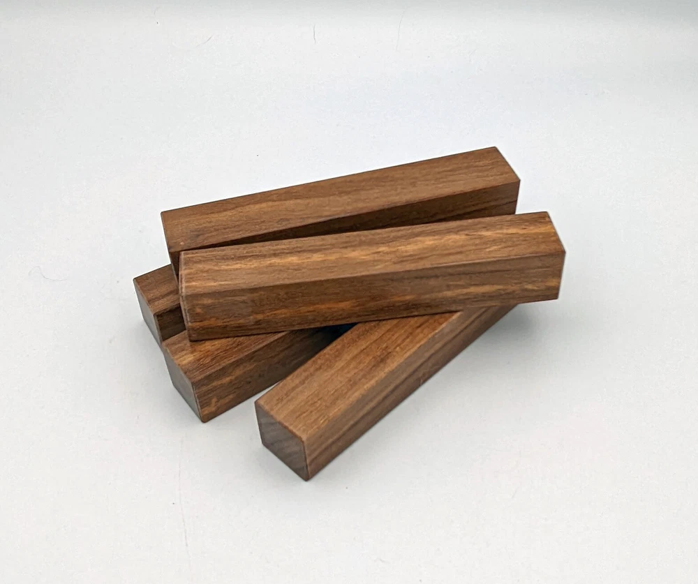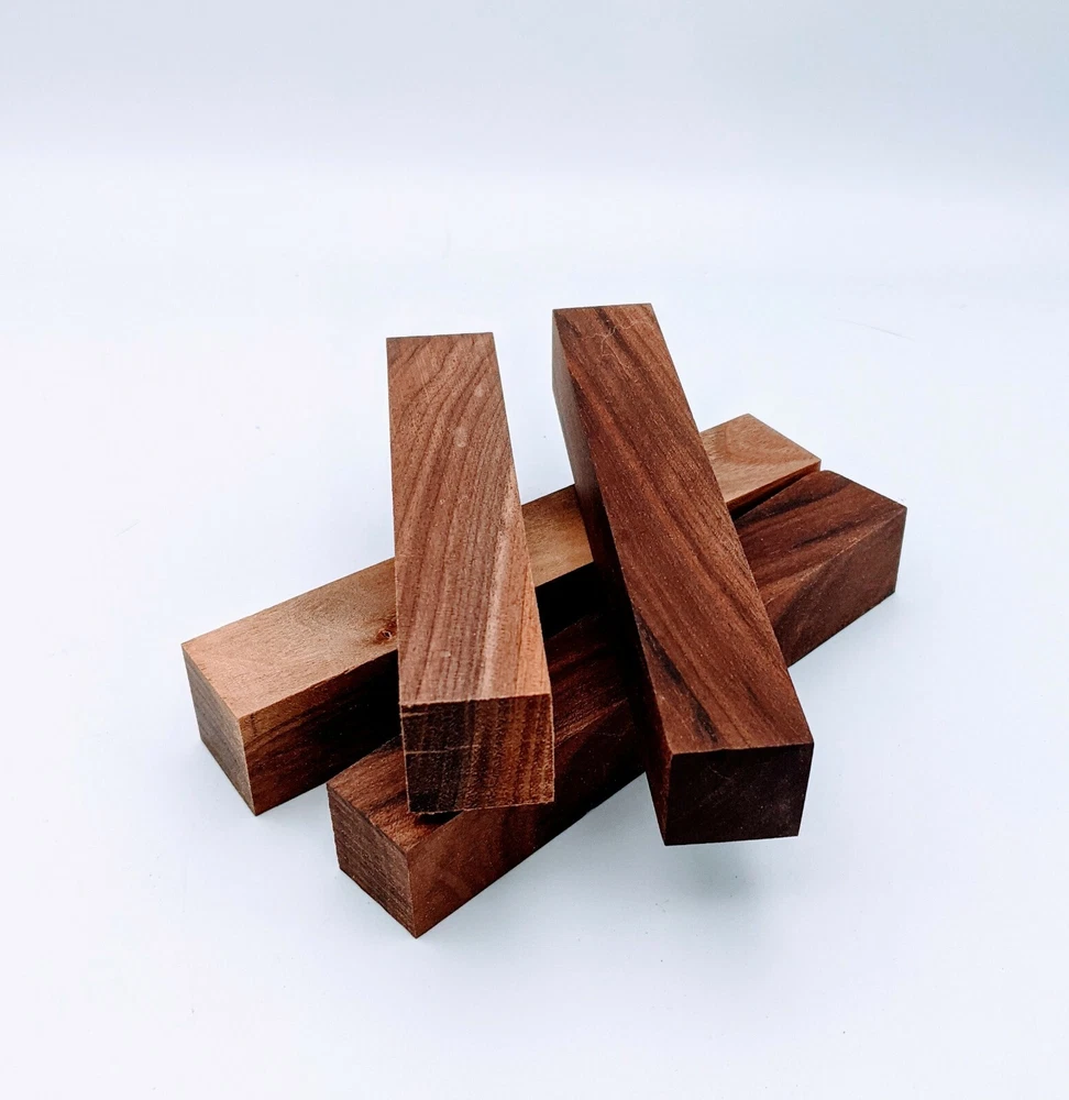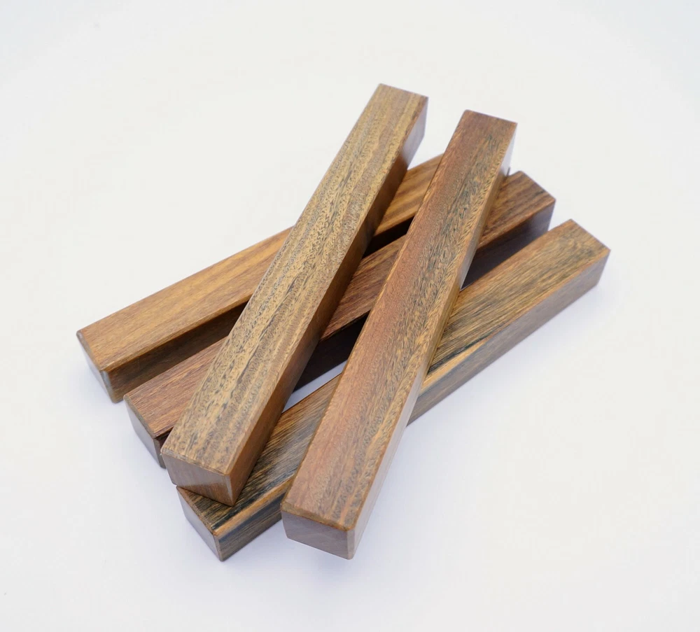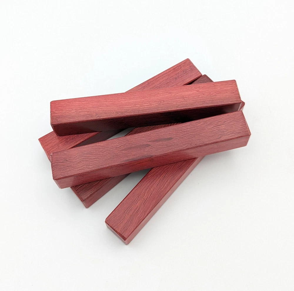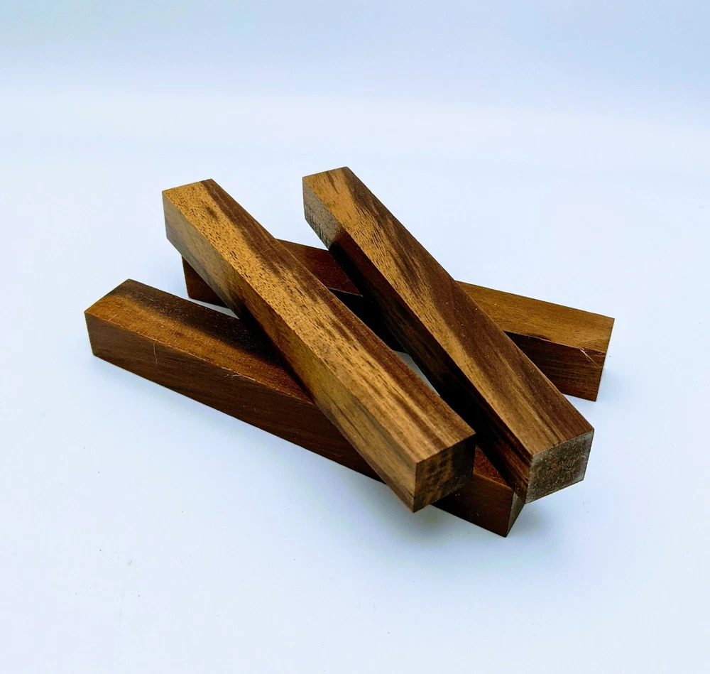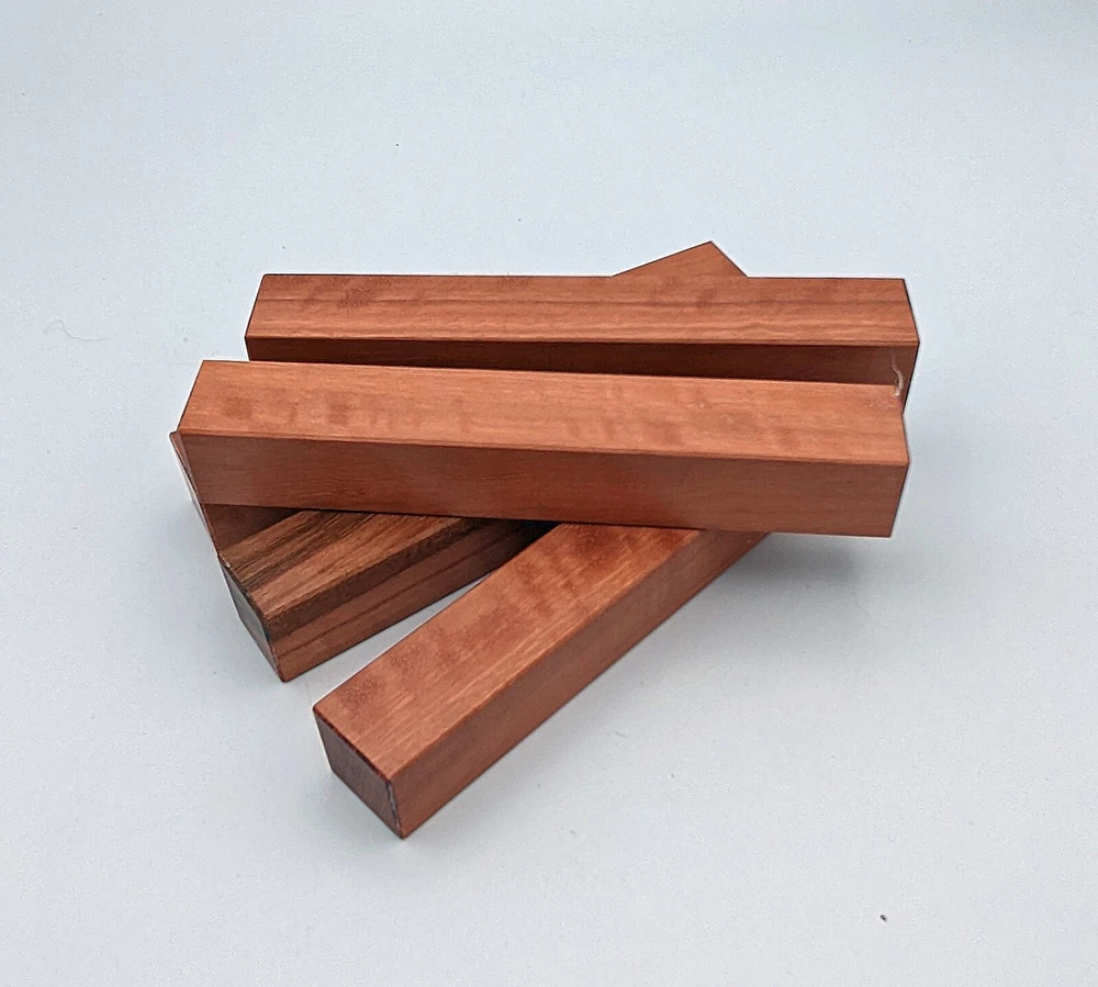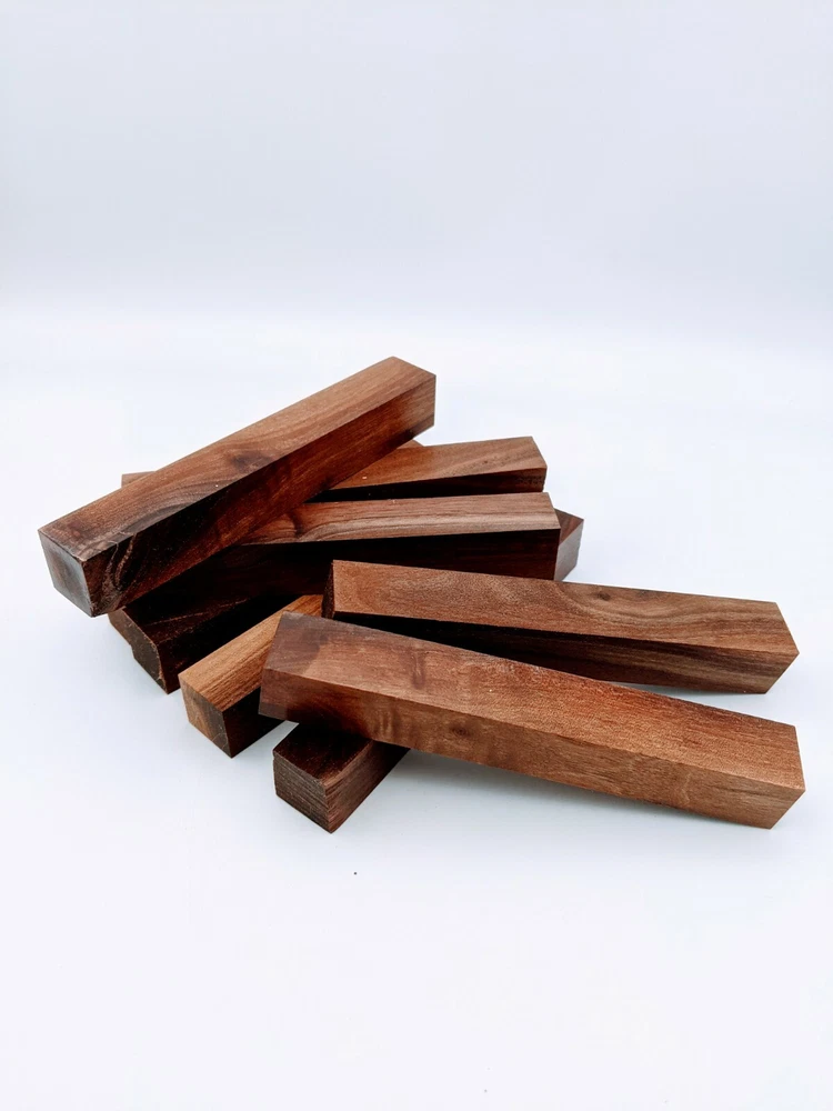 Choose the species from the drop-down. Why long blanks? Think about it. How much waste do you generally have using a single 5" blank for a single pen? When turning pens, I almost always cut the blanks 10" so that I can get 3 pens from a single blank. I'm now offering them to you! Price is for a single blank. Shipping starts at $4.99. The photos are from stock I cut, sanded to 320, then buffed with the Beall system. The blanks in the photos are for reference only. The items for sale are generally from the same stock. Measurements are approximate and may vary by +/- 1/8" Some blanks may contain inclusions and voids. Since I cut these myself, other sizes are available. Please message me if you desire another size or shape. If you would like to consider a bulk purchase, please contact me. Here is a list of our available species: Argentine Lignum Vitae: Extremely dense and durable, perfect for crafting high-end, long-lasting pen blanks. Ash - Black: Strong grain pattern, offers a bold and striking appearance for pen blanks. Ash - French: Tight grain with a subtle appearance, great for creating classic and elegant pens. Ash - White: Light color with fine texture, ideal for a clean and polished pen finish. Beli: Distinctive striping, adds visual interest and an exotic look to pen blanks. Bhilwara: Dense and durable with rich hues, suitable for creating long-lasting and visually appealing pens. Birch - African Bog: Dark, aged wood, creates a unique, antique feel for pens with a touch of history. Birch, Caramelized: Warm tones and smooth texture, perfect for crafting elegant and refined pens. Birch - Curly: Beautiful figuring adds dynamic visual movement, making pen blanks stand out. Bloodwood: Deep red color, offers a dramatic and luxurious look for striking pen blanks. Bocote: Eye-catching grain patterns, ideal for creating stunning and exotic pen designs. Boxwood - Castello: Fine-grained and pale, perfect for intricate and detailed pen work. Brazilian Blackheart (Pau Santo): Rich, dark tones, ideal for creating sophisticated and sleek pen blanks. Brazilian Tigerwood: Bold striping, adds a wild and exotic appearance to pen blanks. Brownheart: Smooth texture with a warm hue, perfect for creating understated and elegant pens. Bubinga: Reddish-brown with fine figuring, adds a touch of luxury to pen designs. Bubinga - Figured: Highly figured, making for eye-catching and intricate pen blanks. Camel Thorn: Dense and hard, offers durability with a striking red hue, perfect for long-lasting pens. Canarywood: Bright yellow with red streaks, creates vibrant and lively pen blanks. Catalpa: Light and easy to work with, great for beginners and natural finishes in pen crafting. Cerejeira: Fine texture with a golden hue, offers a classic and refined look for pen blanks. Cerejeira - Crotchwood: Intricate crotch figuring, ideal for creating unique and eye-catching pens. Ceylon Satinwood: Golden sheen with a fine texture, perfect for high-end and luxurious pens. Chakte Viga (Paela): Bright orange with fine grain, creates bold and distinctive pen blanks. Cherry: Warm red tones, classic and popular choice for crafting all types of pens. Cherry - Figured: Dynamic figuring enhances the traditional look, adding depth to cherry wood pens. Cocobolo: Rich color with striking patterns, ideal for crafting luxurious and durable pens. Crepe Myrtle (Pyinma): Fine grain with a warm hue, perfect for detailed and smooth pen work. Crepe Myrtle (Pyinma) - XG: Extra-figured, offers enhanced visual depth and complexity to pens. Ebiara (Red Zebrawood): Striped appearance, perfect for creating exotic and vibrant pen blanks. Ebony, Bolivian (Coffeewood): Dark and dense, ideal for sleek, sophisticated pen designs. Ebony - Brazilian (Gombeira): Deep black color with a smooth texture, excellent for premium pen blanks. Elm: Attractive grain and medium hardness, perfect for creating classic and durable pens. Etimoe: Reddish-brown with a tight grain, adds subtle elegance and richness to pen blanks. Granadillo: Reddish-brown with a fine texture, excellent for detailed and durable pen designs. Granadillo - Figured: Enhanced figuring adds visual interest and depth to Granadillo pen blanks. Hackberry: Light-colored with subtle grain, ideal for custom finishes and versatile pen designs. Hackberry - Spalted: Unique spalting patterns, creates stunning and one-of-a-kind pen blanks. Hickory (reclaimed): Strong and durable with a rustic appearance, perfect for crafting rugged pens. Holly: Bright white, perfect for creating contrasting or detailed work in pens. Imbuia: Rich, dark wood with a pleasant aroma, ideal for creating elegant and luxurious pens. Ipe: Extremely dense and durable, great for crafting heavy-use and long-lasting pens. Ironwood - Moluccan: Incredibly hard with a deep brown color, perfect for creating durable and long-lasting pens. Itauba: Golden-brown with a smooth texture, ideal for creating warm and elegant pen blanks. Jarrah: Reddish with a rich grain, great for classic and refined pen designs. Jatoba (Brazilian Cherry): Extremely hard with a deep red hue, perfect for high-durability and striking pen blanks. Kentucky Coffee Tree: Light color with a fine grain, ideal for easy finishing and classic pen designs. Kiaat (Muninga): Attractive golden-brown with interlocking grain, adds character to pen blanks. Koa: Rich color with fine figuring, perfect for creating beautiful, high-end pens. Lacewood: Distinctive flecked grain, ideal for crafting eye-catching and textured pen blanks. Leopardwood: Spotted appearance, perfect for creating unique and striking pen designs. Limba - White: Light-colored wood with a subtle grain, perfect for creating clean and minimalist pens. Locust - Honey: Warm golden hue, ideal for creating pens with a rustic and natural charm. Louro Preto: Dark, rich wood with fine texture, perfect for creating elegant and polished pens. Louro Preto - Figured (wormy): Unique figuring adds character and depth to Louro Pret