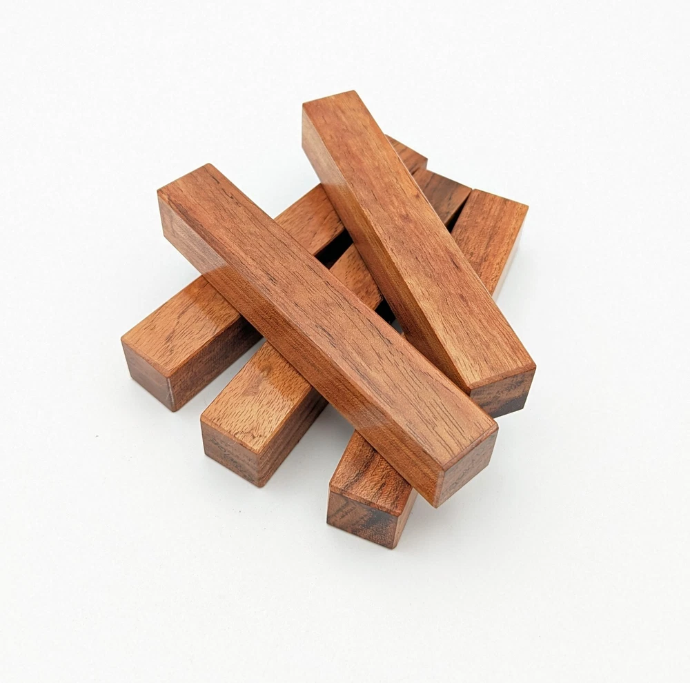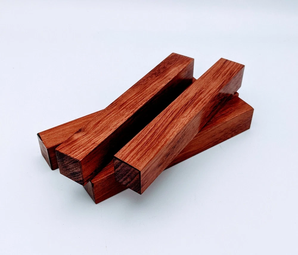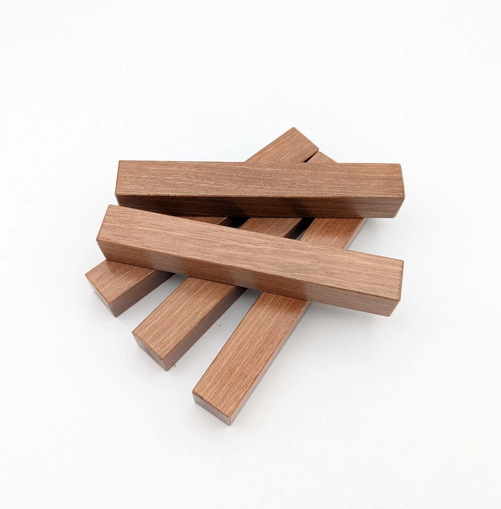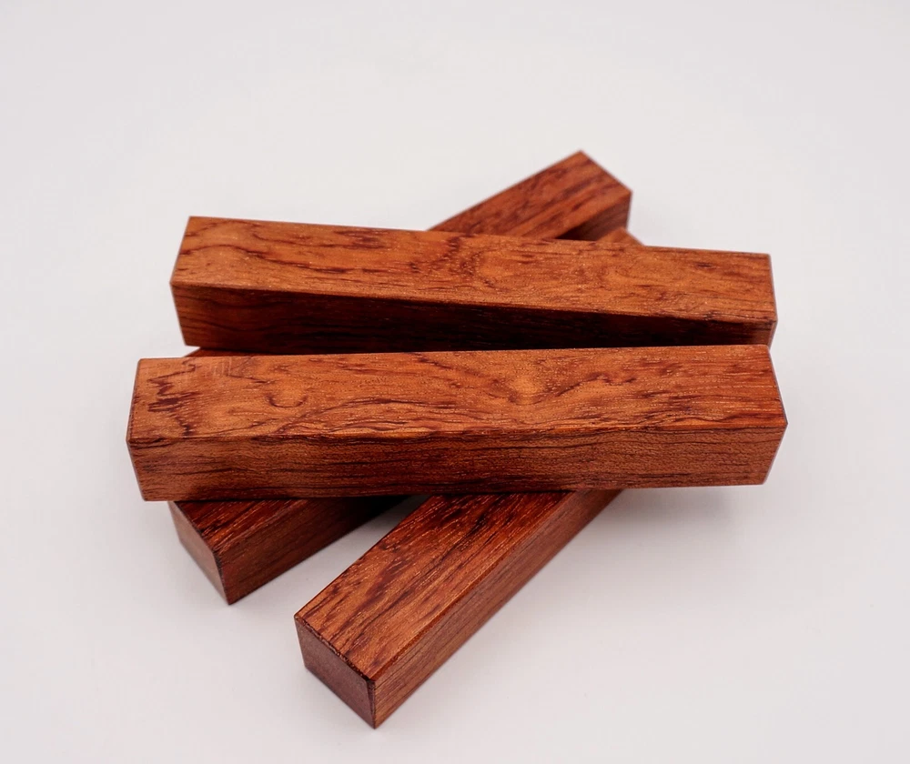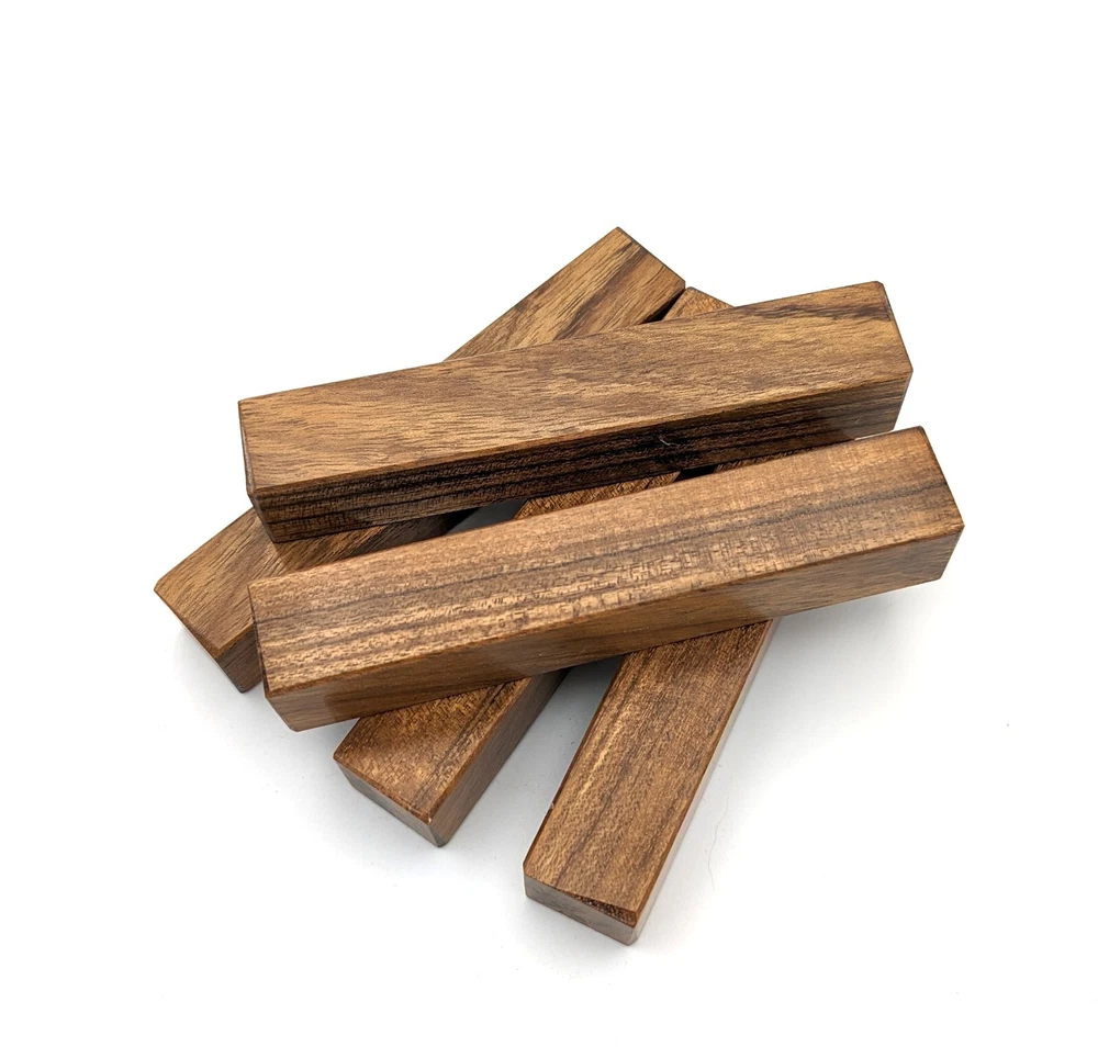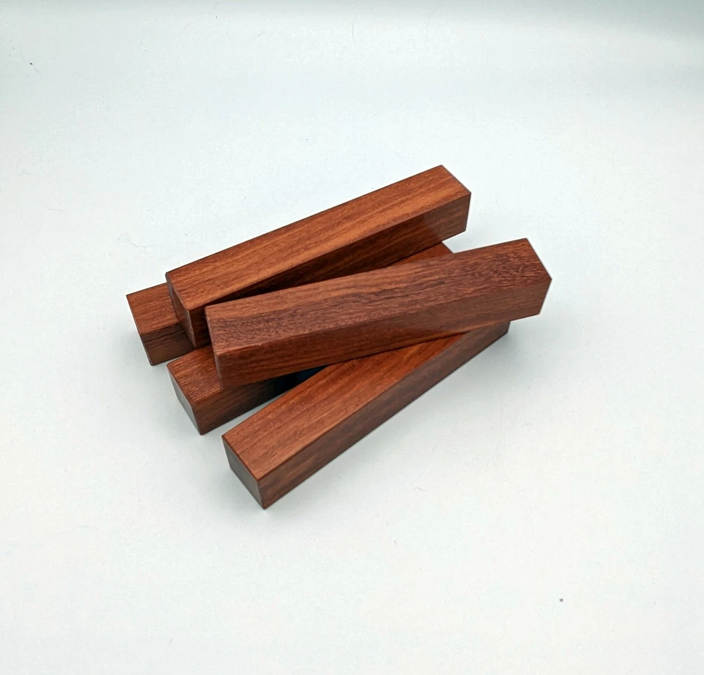 Choose the species from the drop-down. Why long blanks? Think about it. How much waste do you generally have using a single 5" blank for a single pen? When turning pens, I almost always cut the blanks 10" so that I can get 3 pens from a single blank. I'm now offering them to you! Price is for a single blank. Shipping starts at $4.99. The photos are from stock I cut, sanded to 320, then buffed with the Beall system. The blanks in the photos are for reference only. The items for sale are generally from the same stock. Measurements are approximate and may vary by +/- 1/8" Some blanks may contain inclusions and voids. Since I cut these myself, other sizes are available. Please message me if you desire another size or shape. If you would like to consider a bulk purchase, please contact me. Here is a list of our available species: Argentine Lignum Vitae: Extremely dense and durable, perfect for crafting high-end, long-lasting pen blanks. Ash - Black: Strong grain pattern, offers a bold and striking appearance for pen blanks. Ash - French: Tight grain with a subtle appearance, great for creating classic and elegant pens. Ash - White: Light color with fine texture, ideal for a clean and polished pen finish. Beli: Distinctive striping, adds visual interest and an exotic look to pen blanks. Bhilwara: Dense and durable with rich hues, suitable for creating long-lasting and visually appealing pens. Birch - African Bog: Dark, aged wood, creates a unique, antique feel for pens with a touch of history. Birch, Caramelized: Warm tones and smooth texture, perfect for crafting elegant and refined pens. Birch - Curly: Beautiful figuring adds dynamic visual movement, making pen blanks stand out. Bloodwood: Deep red color, offers a dramatic and luxurious look for striking pen blanks. Bocote: Eye-catching grain patterns, ideal for creating stunning and exotic pen designs. Boxwood - Castello: Fine-grained and pale, perfect for intricate and detailed pen work. Brazilian Blackheart (Pau Santo): Rich, dark tones, ideal for creating sophisticated and sleek pen blanks. Brazilian Tigerwood: Bold striping, adds a wild and exotic appearance to pen blanks. Brownheart: Smooth texture with a warm hue, perfect for creating understated and elegant pens. Bubinga: Reddish-brown with fine figuring, adds a touch of luxury to pen designs. Bubinga - Figured: Highly figured, making for eye-catching and intricate pen blanks. Camel Thorn: Dense and hard, offers durability with a striking red hue, perfect for long-lasting pens. Canarywood: Bright yellow with red streaks, creates vibrant and lively pen blanks. Catalpa: Light and easy to work with, great for beginners and natural finishes in pen crafting. Cerejeira: Fine texture with a golden hue, offers a classic and refined look for pen blanks. Cerejeira - Crotchwood: Intricate crotch figuring, ideal for creating unique and eye-catching pens. Ceylon Satinwood: Golden sheen with a fine texture, perfect for high-end and luxurious pens. Chakte Viga (Paela): Bright orange with fine grain, creates bold and distinctive pen blanks. Cherry: Warm red tones, classic and popular choice for crafting all types of pens. Cherry - Figured: Dynamic figuring enhances the traditional look, adding depth to cherry wood pens. Cocobolo: Rich color with striking patterns, ideal for crafting luxurious and durable pens. Crepe Myrtle (Pyinma): Fine grain with a warm hue, perfect for detailed and smooth pen work. Crepe Myrtle (Pyinma) - XG: Extra-figured, offers enhanced visual depth and complexity to pens. Ebiara (Red Zebrawood): Striped appearance, perfect for creating exotic and vibrant pen blanks. Ebony, Bolivian (Coffeewood): Dark and dense, ideal for sleek, sophisticated pen designs. Ebony - Brazilian (Gombeira): Deep black color with a smooth texture, excellent for premium pen blanks. Elm: Attractive grain and medium hardness, perfect for creating classic and durable pens. Etimoe: Reddish-brown with a tight grain, adds subtle elegance and richness to pen blanks. Granadillo: Reddish-brown with a fine texture, excellent for detailed and durable pen designs. Granadillo - Figured: Enhanced figuring adds visual interest and depth to Granadillo pen blanks. Hackberry: Light-colored with subtle grain, ideal for custom finishes and versatile pen designs. Hackberry - Spalted: Unique spalting patterns, creates stunning and one-of-a-kind pen blanks. Hickory (reclaimed): Strong and durable with a rustic appearance, perfect for crafting rugged pens. Holly: Bright white, perfect for creating contrasting or detailed work in pens. Imbuia: Rich, dark wood with a pleasant aroma, ideal for creating elegant and luxurious pens. Ipe: Extremely dense and durable, great for crafting heavy-use and long-lasting pens. Ironwood - Moluccan: Incredibly hard with a deep brown color, perfect for creating durable and long-lasting pens. Itauba: Golden-brown with a smooth texture, ideal for creating warm and elegant pen blanks. Jarrah: Reddish with a rich grain, great for classic and refined pen designs. Jatoba (Brazilian Cherry): Extremely hard with a deep red hue, perfect for high-durability and striking pen blanks. Kentucky Coffee Tree: Light color with a fine grain, ideal for easy finishing and classic pen designs. Kiaat (Muninga): Attractive golden-brown with interlocking grain, adds character to pen blanks. Koa: Rich color with fine figuring, perfect for creating beautiful, high-end pens. Lacewood: Distinctive flecked grain, ideal for crafting eye-catching and textured pen blanks. Leopardwood: Spotted appearance, perfect for creating unique and striking pen designs. Limba - White: Light-colored wood with a subtle grain, perfect for creating clean and minimalist pens. Locust - Honey: Warm golden hue, ideal for creating pens with a rustic and natural charm. Louro Preto: Dark, rich wood with fine texture, perfect for creating elegant and polished pens. Louro Preto - Figured (wormy): Unique figuring adds character and depth to Louro Pret