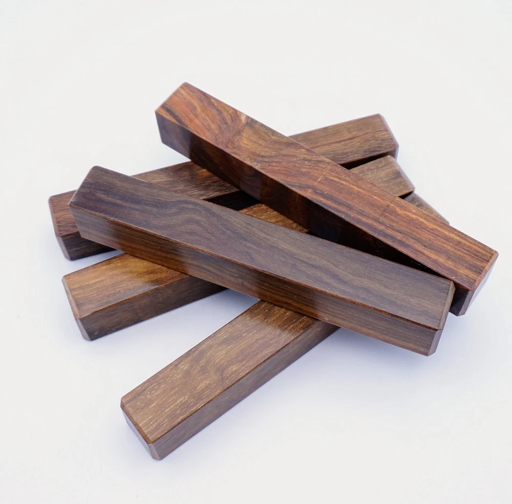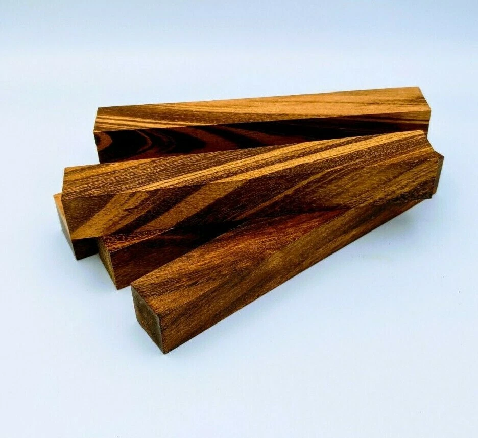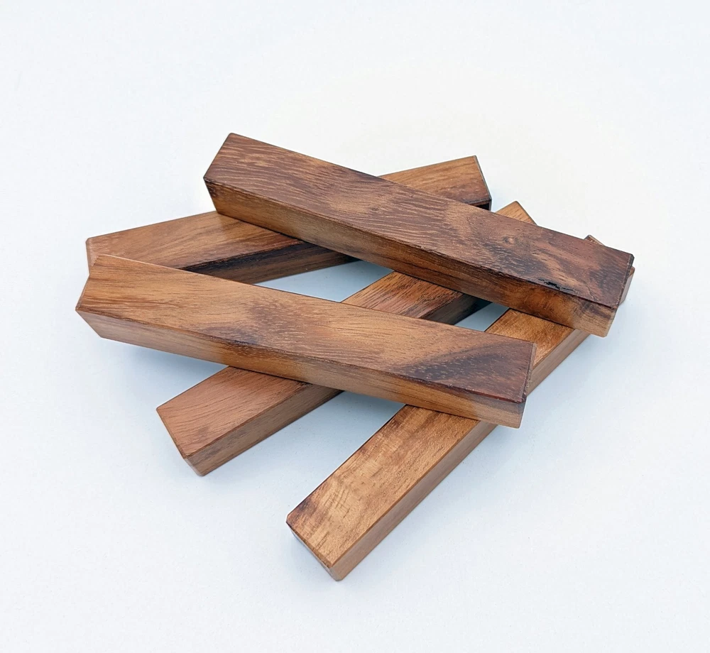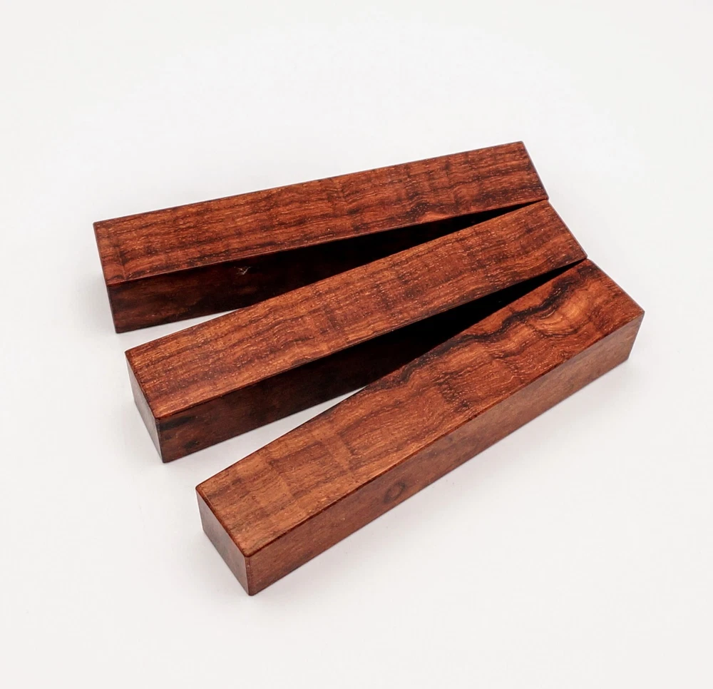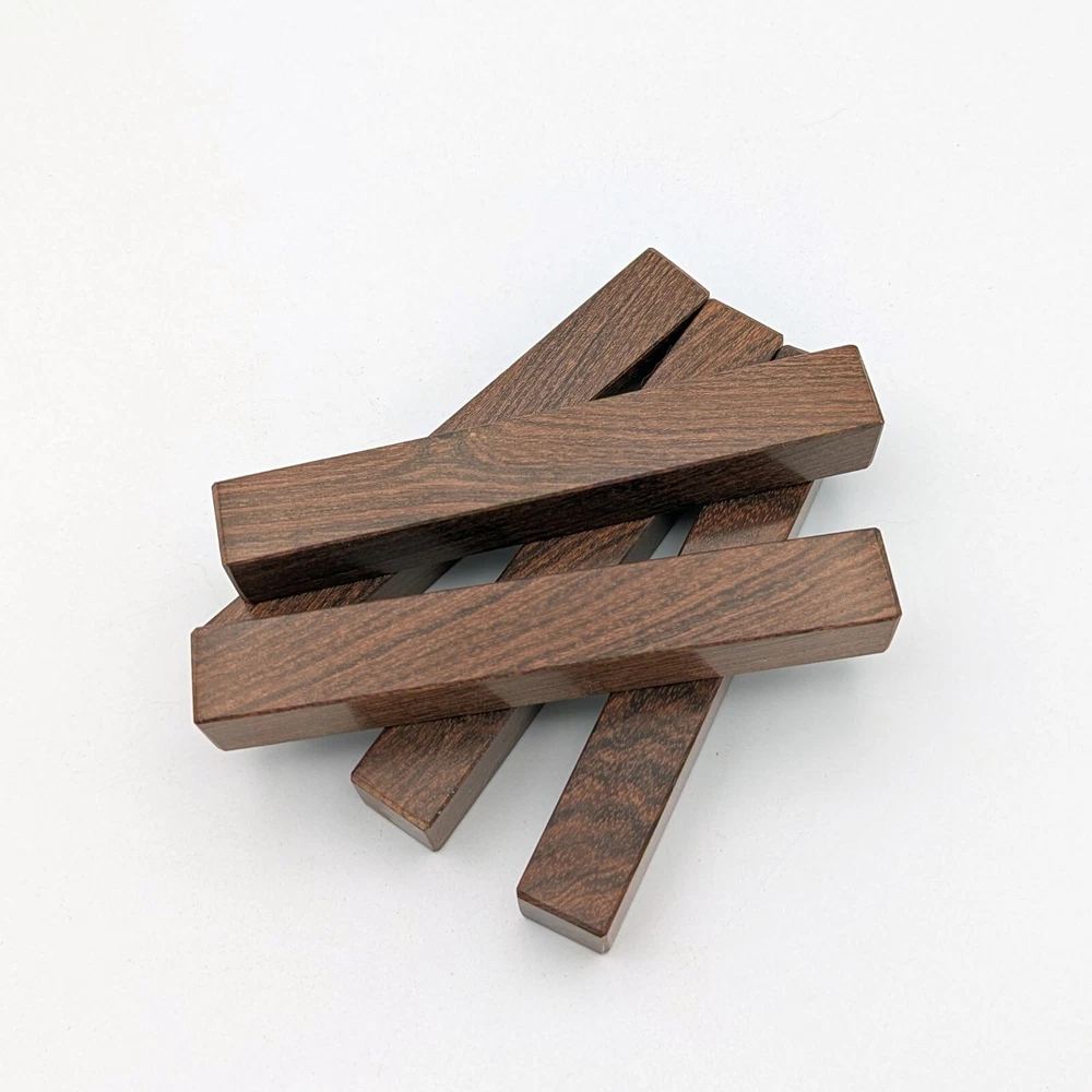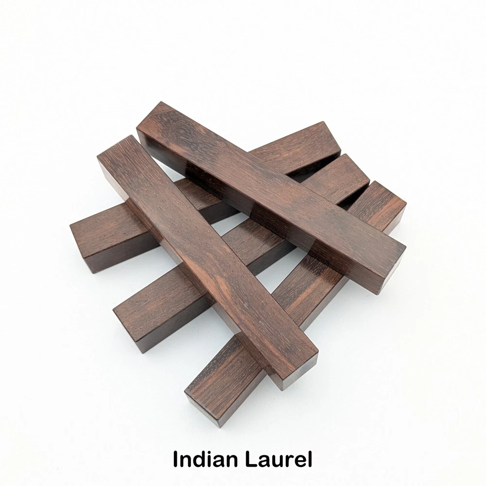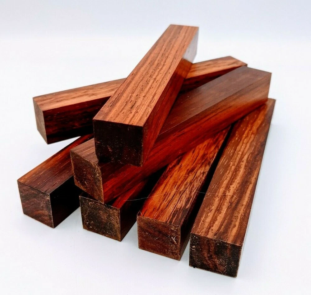 Choose the species from the drop-down. Why long blanks? Think about it. How much waste do you generally have using a single 5" blank for a single pen? When turning pens, I almost always cut the blanks 10" so that I can get 3 pens from a single blank. I'm now offering them to you! Price is for a single blank. Shipping starts at $4.99. The photos are from stock I cut, sanded to 320, then buffed with the Beall system. The blanks in the photos are for reference only. The items for sale are generally from the same stock. Measurements are approximate and may vary by +/- 1/8" Some blanks may contain inclusions and voids. Since I cut these myself, other sizes are available. Please message me if you desire another size or shape. If you would like to consider a bulk purchase, please contact me. Here is a list of our available species: Argentine Lignum Vitae: Extremely dense and durable, perfect for crafting high-end, long-lasting pen blanks. Ash - Black: Strong grain pattern, offers a bold and striking appearance for pen blanks. Ash - French: Tight grain with a subtle appearance, great for creating classic and elegant pens. Ash - White: Light color with fine texture, ideal for a clean and polished pen finish. Beli: Distinctive striping, adds visual interest and an exotic look to pen blanks. Bhilwara: Dense and durable with rich hues, suitable for creating long-lasting and visually appealing pens. Birch - African Bog: Dark, aged wood, creates a unique, antique feel for pens with a touch of history. Birch, Caramelized: Warm tones and smooth texture, perfect for crafting elegant and refined pens. Birch - Curly: Beautiful figuring adds dynamic visual movement, making pen blanks stand out. Bloodwood: Deep red color, offers a dramatic and luxurious look for striking pen blanks. Bocote: Eye-catching grain patterns, ideal for creating stunning and exotic pen designs. Boxwood - Castello: Fine-grained and pale, perfect for intricate and detailed pen work. Brazilian Blackheart (Pau Santo): Rich, dark tones, ideal for creating sophisticated and sleek pen blanks. Brazilian Tigerwood: Bold striping, adds a wild and exotic appearance to pen blanks. Brownheart: Smooth texture with a warm hue, perfect for creating understated and elegant pens. Bubinga: Reddish-brown with fine figuring, adds a touch of luxury to pen designs. Bubinga - Figured: Highly figured, making for eye-catching and intricate pen blanks. Camel Thorn: Dense and hard, offers durability with a striking red hue, perfect for long-lasting pens. Canarywood: Bright yellow with red streaks, creates vibrant and lively pen blanks. Catalpa: Light and easy to work with, great for beginners and natural finishes in pen crafting. Cerejeira: Fine texture with a golden hue, offers a classic and refined look for pen blanks. Cerejeira - Crotchwood: Intricate crotch figuring, ideal for creating unique and eye-catching pens. Ceylon Satinwood: Golden sheen with a fine texture, perfect for high-end and luxurious pens. Chakte Viga (Paela): Bright orange with fine grain, creates bold and distinctive pen blanks. Cherry: Warm red tones, classic and popular choice for crafting all types of pens. Cherry - Figured: Dynamic figuring enhances the traditional look, adding depth to cherry wood pens. Cocobolo: Rich color with striking patterns, ideal for crafting luxurious and durable pens. Crepe Myrtle (Pyinma): Fine grain with a warm hue, perfect for detailed and smooth pen work. Crepe Myrtle (Pyinma) - XG: Extra-figured, offers enhanced visual depth and complexity to pens. Ebiara (Red Zebrawood): Striped appearance, perfect for creating exotic and vibrant pen blanks. Ebony, Bolivian (Coffeewood): Dark and dense, ideal for sleek, sophisticated pen designs. Ebony - Brazilian (Gombeira): Deep black color with a smooth texture, excellent for premium pen blanks. Elm: Attractive grain and medium hardness, perfect for creating classic and durable pens. Etimoe: Reddish-brown with a tight grain, adds subtle elegance and richness to pen blanks. Granadillo: Reddish-brown with a fine texture, excellent for detailed and durable pen designs. Granadillo - Figured: Enhanced figuring adds visual interest and depth to Granadillo pen blanks. Hackberry: Light-colored with subtle grain, ideal for custom finishes and versatile pen designs. Hackberry - Spalted: Unique spalting patterns, creates stunning and one-of-a-kind pen blanks. Hickory (reclaimed): Strong and durable with a rustic appearance, perfect for crafting rugged pens. Holly: Bright white, perfect for creating contrasting or detailed work in pens. Imbuia: Rich, dark wood with a pleasant aroma, ideal for creating elegant and luxurious pens. Ipe: Extremely dense and durable, great for crafting heavy-use and long-lasting pens. Ironwood - Moluccan: Incredibly hard with a deep brown color, perfect for creating durable and long-lasting pens. Itauba: Golden-brown with a smooth texture, ideal for creating warm and elegant pen blanks. Jarrah: Reddish with a rich grain, great for classic and refined pen designs. Jatoba (Brazilian Cherry): Extremely hard with a deep red hue, perfect for high-durability and striking pen blanks. Kentucky Coffee Tree: Light color with a fine grain, ideal for easy finishing and classic pen designs. Kiaat (Muninga): Attractive golden-brown with interlocking grain, adds character to pen blanks. Koa: Rich color with fine figuring, perfect for creating beautiful, high-end pens. Lacewood: Distinctive flecked grain, ideal for crafting eye-catching and textured pen blanks. Leopardwood: Spotted appearance, perfect for creating unique and striking pen designs. Limba - White: Light-colored wood with a subtle grain, perfect for creating clean and minimalist pens. Locust - Honey: Warm golden hue, ideal for creating pens with a rustic and natural charm. Louro Preto: Dark, rich wood with fine texture, perfect for creating elegant and polished pens. Louro Preto - Figured (wormy): Unique figuring adds character and depth to Louro Pret
