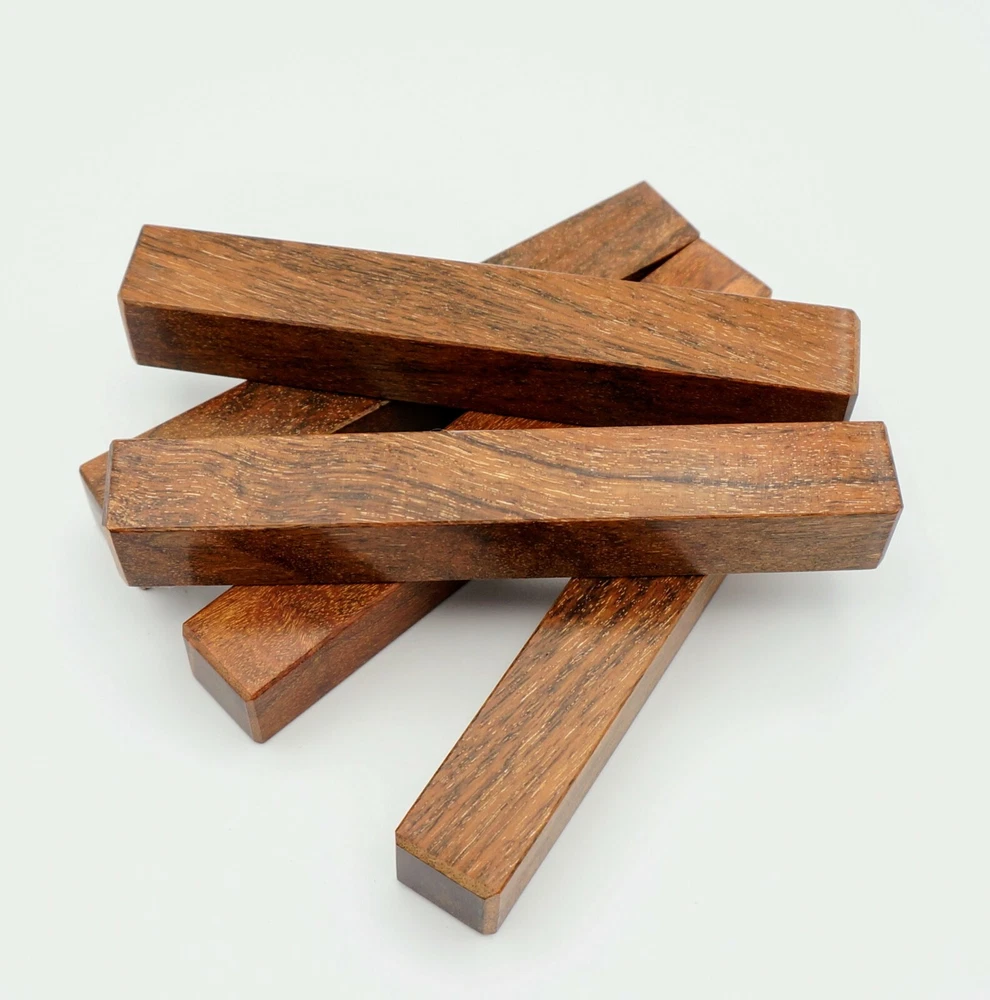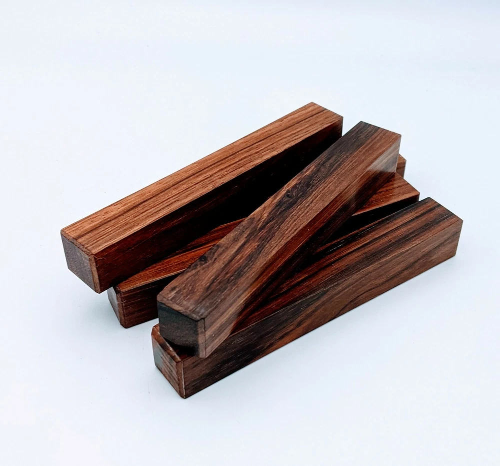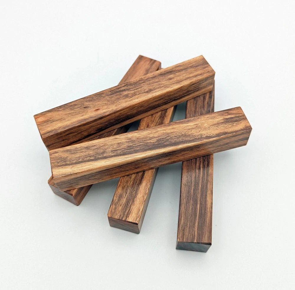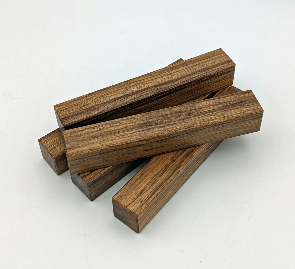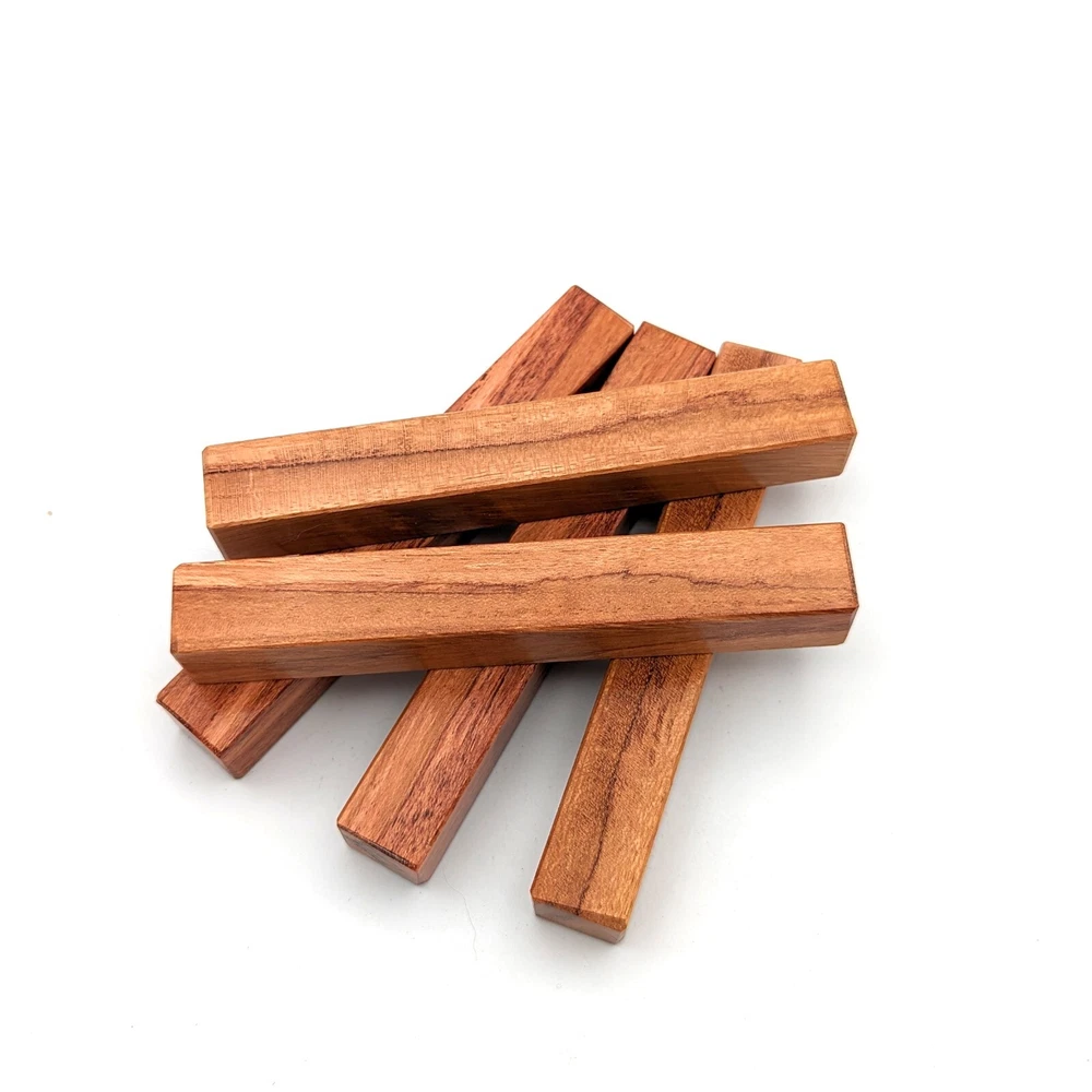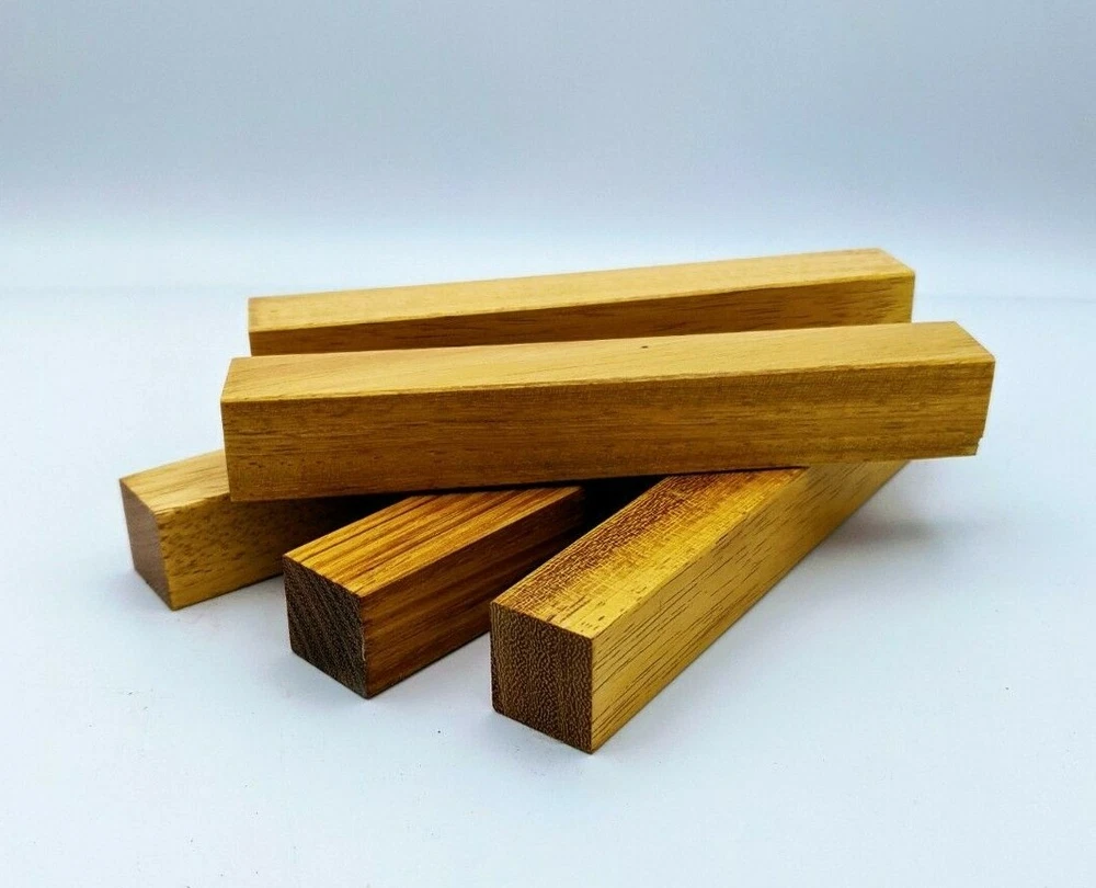 Choose the species from the drop-down. Why long blanks? Think about it. How much waste do you generally have using a single 5" blank for a single pen? When turning pens, I almost always cut the blanks 10" so that I can get 3 pens from a single blank. I'm now offering them to you! Price is for a single blank. Shipping starts at $4.99. The photos are from stock I cut, sanded to 320, then buffed with the Beall system. The blanks in the photos are for reference only. The items for sale are generally from the same stock. Measurements are approximate and may vary by +/- 1/8" Some blanks may contain inclusions and voids. Since I cut these myself, other sizes are available. Please message me if you desire another size or shape. If you would like to consider a bulk purchase, please contact me. Here is a list of our available species: Argentine Lignum Vitae: Extremely dense and durable, perfect for crafting high-end, long-lasting pen blanks. Ash - Black: Strong grain pattern, offers a bold and striking appearance for pen blanks. Ash - French: Tight grain with a subtle appearance, great for creating classic and elegant pens. Ash - White: Light color with fine texture, ideal for a clean and polished pen finish. Beli: Distinctive striping, adds visual interest and an exotic look to pen blanks. Bhilwara: Dense and durable with rich hues, suitable for creating long-lasting and visually appealing pens. Birch - African Bog: Dark, aged wood, creates a unique, antique feel for pens with a touch of history. Birch, Caramelized: Warm tones and smooth texture, perfect for crafting elegant and refined pens. Birch - Curly: Beautiful figuring adds dynamic visual movement, making pen blanks stand out. Bloodwood: Deep red color, offers a dramatic and luxurious look for striking pen blanks. Bocote: Eye-catching grain patterns, ideal for creating stunning and exotic pen designs. Boxwood - Castello: Fine-grained and pale, perfect for intricate and detailed pen work. Brazilian Blackheart (Pau Santo): Rich, dark tones, ideal for creating sophisticated and sleek pen blanks. Brazilian Tigerwood: Bold striping, adds a wild and exotic appearance to pen blanks. Brownheart: Smooth texture with a warm hue, perfect for creating understated and elegant pens. Bubinga: Reddish-brown with fine figuring, adds a touch of luxury to pen designs. Bubinga - Figured: Highly figured, making for eye-catching and intricate pen blanks. Camel Thorn: Dense and hard, offers durability with a striking red hue, perfect for long-lasting pens. Canarywood: Bright yellow with red streaks, creates vibrant and lively pen blanks. Catalpa: Light and easy to work with, great for beginners and natural finishes in pen crafting. Cerejeira: Fine texture with a golden hue, offers a classic and refined look for pen blanks. Cerejeira - Crotchwood: Intricate crotch figuring, ideal for creating unique and eye-catching pens. Ceylon Satinwood: Golden sheen with a fine texture, perfect for high-end and luxurious pens. Chakte Viga (Paela): Bright orange with fine grain, creates bold and distinctive pen blanks. Cherry: Warm red tones, classic and popular choice for crafting all types of pens. Cherry - Figured: Dynamic figuring enhances the traditional look, adding depth to cherry wood pens. Cocobolo: Rich color with striking patterns, ideal for crafting luxurious and durable pens. Crepe Myrtle (Pyinma): Fine grain with a warm hue, perfect for detailed and smooth pen work. Crepe Myrtle (Pyinma) - XG: Extra-figured, offers enhanced visual depth and complexity to pens. Ebiara (Red Zebrawood): Striped appearance, perfect for creating exotic and vibrant pen blanks. Ebony, Bolivian (Coffeewood): Dark and dense, ideal for sleek, sophisticated pen designs. Ebony - Brazilian (Gombeira): Deep black color with a smooth texture, excellent for premium pen blanks. Elm: Attractive grain and medium hardness, perfect for creating classic and durable pens. Etimoe: Reddish-brown with a tight grain, adds subtle elegance and richness to pen blanks. Granadillo: Reddish-brown with a fine texture, excellent for detailed and durable pen designs. Granadillo - Figured: Enhanced figuring adds visual interest and depth to Granadillo pen blanks. Hackberry: Light-colored with subtle grain, ideal for custom finishes and versatile pen designs. Hackberry - Spalted: Unique spalting patterns, creates stunning and one-of-a-kind pen blanks. Hickory (reclaimed): Strong and durable with a rustic appearance, perfect for crafting rugged pens. Holly: Bright white, perfect for creating contrasting or detailed work in pens. Imbuia: Rich, dark wood with a pleasant aroma, ideal for creating elegant and luxurious pens. Ipe: Extremely dense and durable, great for crafting heavy-use and long-lasting pens. Ironwood - Moluccan: Incredibly hard with a deep brown color, perfect for creating durable and long-lasting pens. Itauba: Golden-brown with a smooth texture, ideal for creating warm and elegant pen blanks. Jarrah: Reddish with a rich grain, great for classic and refined pen designs. Jatoba (Brazilian Cherry): Extremely hard with a deep red hue, perfect for high-durability and striking pen blanks. Kentucky Coffee Tree: Light color with a fine grain, ideal for easy finishing and classic pen designs. Kiaat (Muninga): Attractive golden-brown with interlocking grain, adds character to pen blanks. Koa: Rich color with fine figuring, perfect for creating beautiful, high-end pens. Lacewood: Distinctive flecked grain, ideal for crafting eye-catching and textured pen blanks. Leopardwood: Spotted appearance, perfect for creating unique and striking pen designs. Limba - White: Light-colored wood with a subtle grain, perfect for creating clean and minimalist pens. Locust - Honey: Warm golden hue, ideal for creating pens with a rustic and natural charm. Louro Preto: Dark, rich wood with fine texture, perfect for creating elegant and polished pens. Louro Preto - Figured (wormy): Unique figuring adds character and depth to Louro Pret