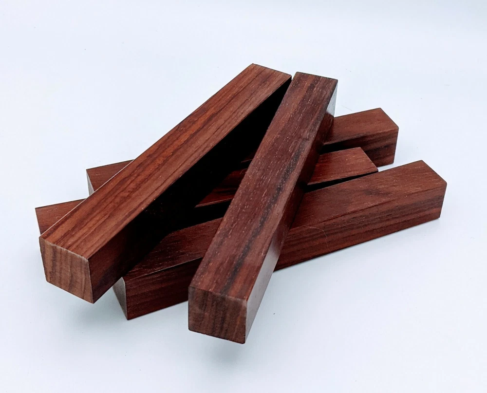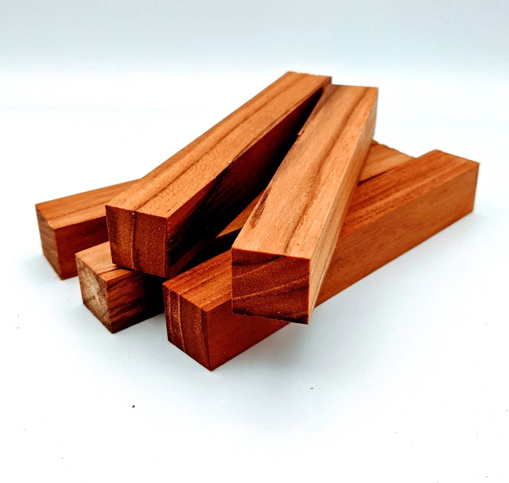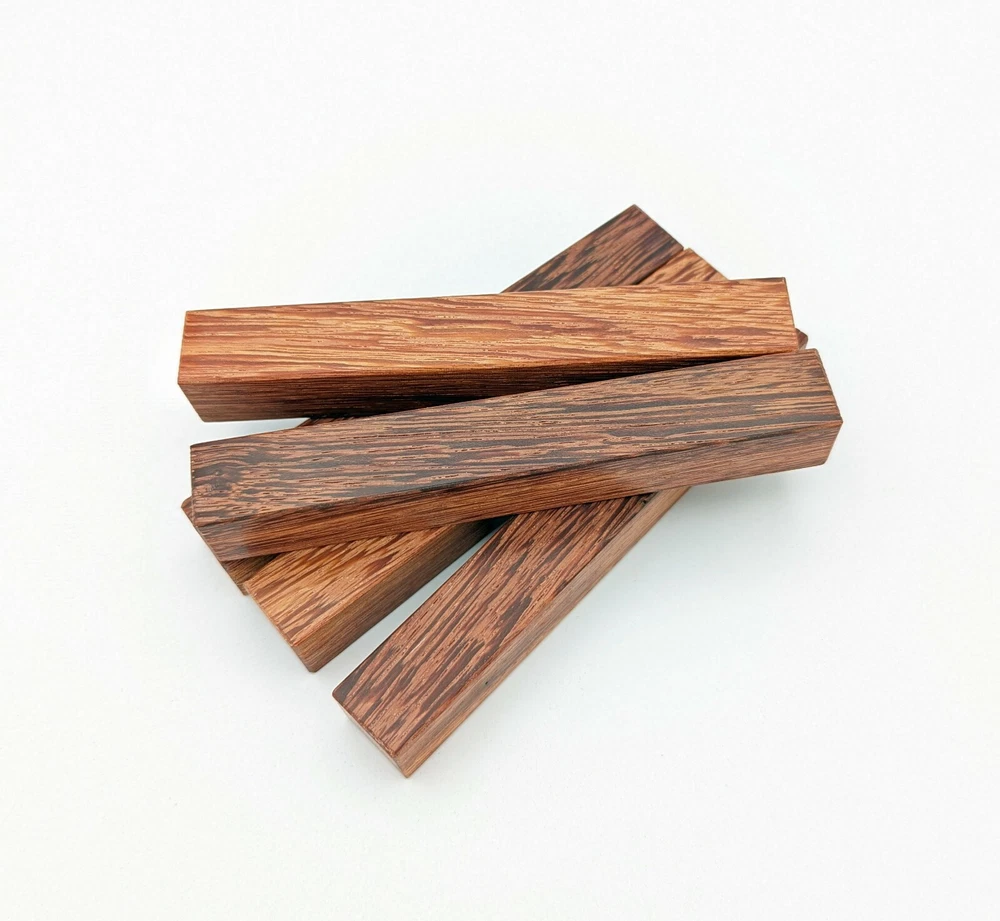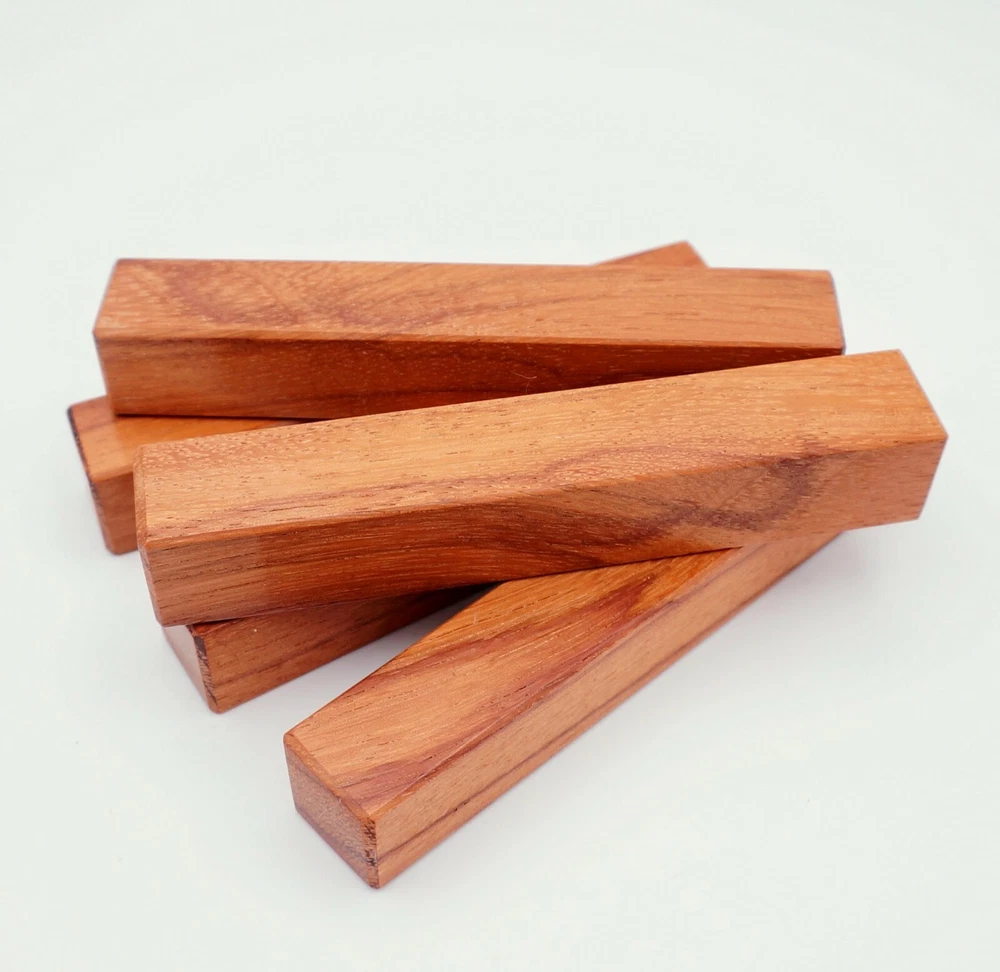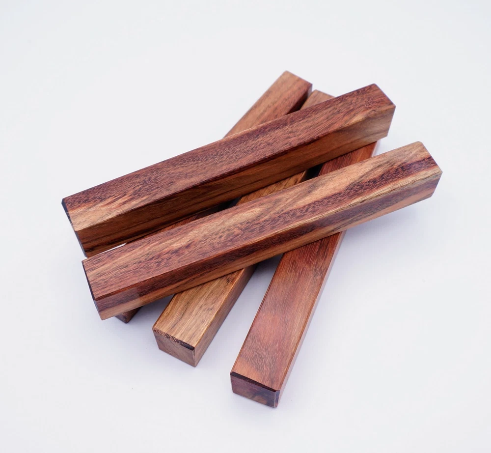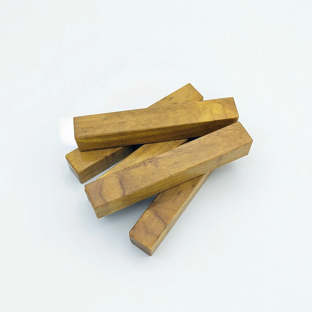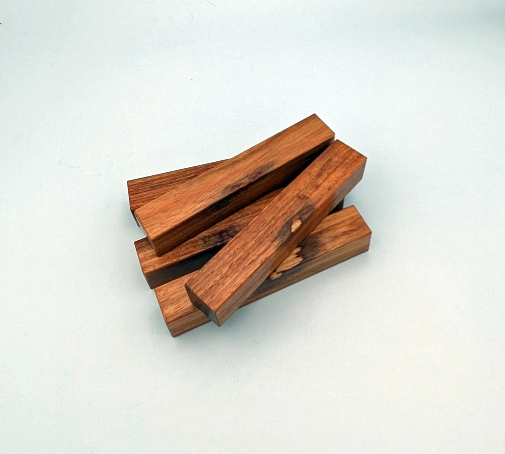 Choose the species from the drop-down. Why long blanks? Think about it. How much waste do you generally have using a single 5" blank for a single pen? When turning pens, I almost always cut the blanks 10" so that I can get 3 pens from a single blank. I'm now offering them to you! Price is for a single blank. Shipping starts at $4.99. The photos are from stock I cut, sanded to 320, then buffed with the Beall system. The blanks in the photos are for reference only. The items for sale are generally from the same stock. Measurements are approximate and may vary by +/- 1/8" Some blanks may contain inclusions and voids. Since I cut these myself, other sizes are available. Please message me if you desire another size or shape. If you would like to consider a bulk purchase, please contact me. Here is a list of our available species: Argentine Lignum Vitae: Extremely dense and durable, perfect for crafting high-end, long-lasting pen blanks. Ash - Black: Strong grain pattern, offers a bold and striking appearance for pen blanks. Ash - French: Tight grain with a subtle appearance, great for creating classic and elegant pens. Ash - White: Light color with fine texture, ideal for a clean and polished pen finish. Beli: Distinctive striping, adds visual interest and an exotic look to pen blanks. Bhilwara: Dense and durable with rich hues, suitable for creating long-lasting and visually appealing pens. Birch - African Bog: Dark, aged wood, creates a unique, antique feel for pens with a touch of history. Birch, Caramelized: Warm tones and smooth texture, perfect for crafting elegant and refined pens. Birch - Curly: Beautiful figuring adds dynamic visual movement, making pen blanks stand out. Bloodwood: Deep red color, offers a dramatic and luxurious look for striking pen blanks. Bocote: Eye-catching grain patterns, ideal for creating stunning and exotic pen designs. Boxwood - Castello: Fine-grained and pale, perfect for intricate and detailed pen work. Brazilian Blackheart (Pau Santo): Rich, dark tones, ideal for creating sophisticated and sleek pen blanks. Brazilian Tigerwood: Bold striping, adds a wild and exotic appearance to pen blanks. Brownheart: Smooth texture with a warm hue, perfect for creating understated and elegant pens. Bubinga: Reddish-brown with fine figuring, adds a touch of luxury to pen designs. Bubinga - Figured: Highly figured, making for eye-catching and intricate pen blanks. Camel Thorn: Dense and hard, offers durability with a striking red hue, perfect for long-lasting pens. Canarywood: Bright yellow with red streaks, creates vibrant and lively pen blanks. Catalpa: Light and easy to work with, great for beginners and natural finishes in pen crafting. Cerejeira: Fine texture with a golden hue, offers a classic and refined look for pen blanks. Cerejeira - Crotchwood: Intricate crotch figuring, ideal for creating unique and eye-catching pens. Ceylon Satinwood: Golden sheen with a fine texture, perfect for high-end and luxurious pens. Chakte Viga (Paela): Bright orange with fine grain, creates bold and distinctive pen blanks. Cherry: Warm red tones, classic and popular choice for crafting all types of pens. Cherry - Figured: Dynamic figuring enhances the traditional look, adding depth to cherry wood pens. Cocobolo: Rich color with striking patterns, ideal for crafting luxurious and durable pens. Crepe Myrtle (Pyinma): Fine grain with a warm hue, perfect for detailed and smooth pen work. Crepe Myrtle (Pyinma) - XG: Extra-figured, offers enhanced visual depth and complexity to pens. Ebiara (Red Zebrawood): Striped appearance, perfect for creating exotic and vibrant pen blanks. Ebony, Bolivian (Coffeewood): Dark and dense, ideal for sleek, sophisticated pen designs. Ebony - Brazilian (Gombeira): Deep black color with a smooth texture, excellent for premium pen blanks. Elm: Attractive grain and medium hardness, perfect for creating classic and durable pens. Etimoe: Reddish-brown with a tight grain, adds subtle elegance and richness to pen blanks. Granadillo: Reddish-brown with a fine texture, excellent for detailed and durable pen designs. Granadillo - Figured: Enhanced figuring adds visual interest and depth to Granadillo pen blanks. Hackberry: Light-colored with subtle grain, ideal for custom finishes and versatile pen designs. Hackberry - Spalted: Unique spalting patterns, creates stunning and one-of-a-kind pen blanks. Hickory (reclaimed): Strong and durable with a rustic appearance, perfect for crafting rugged pens. Holly: Bright white, perfect for creating contrasting or detailed work in pens. Imbuia: Rich, dark wood with a pleasant aroma, ideal for creating elegant and luxurious pens. Ipe: Extremely dense and durable, great for crafting heavy-use and long-lasting pens. Ironwood - Moluccan: Incredibly hard with a deep brown color, perfect for creating durable and long-lasting pens. Itauba: Golden-brown with a smooth texture, ideal for creating warm and elegant pen blanks. Jarrah: Reddish with a rich grain, great for classic and refined pen designs. Jatoba (Brazilian Cherry): Extremely hard with a deep red hue, perfect for high-durability and striking pen blanks. Kentucky Coffee Tree: Light color with a fine grain, ideal for easy finishing and classic pen designs. Kiaat (Muninga): Attractive golden-brown with interlocking grain, adds character to pen blanks. Koa: Rich color with fine figuring, perfect for creating beautiful, high-end pens. Lacewood: Distinctive flecked grain, ideal for crafting eye-catching and textured pen blanks. Leopardwood: Spotted appearance, perfect for creating unique and striking pen designs. Limba - White: Light-colored wood with a subtle grain, perfect for creating clean and minimalist pens. Locust - Honey: Warm golden hue, ideal for creating pens with a rustic and natural charm. Louro Preto: Dark, rich wood with fine texture, perfect for creating elegant and polished pens. Louro Preto - Figured (wormy): Unique figuring adds character and depth to Louro Pret