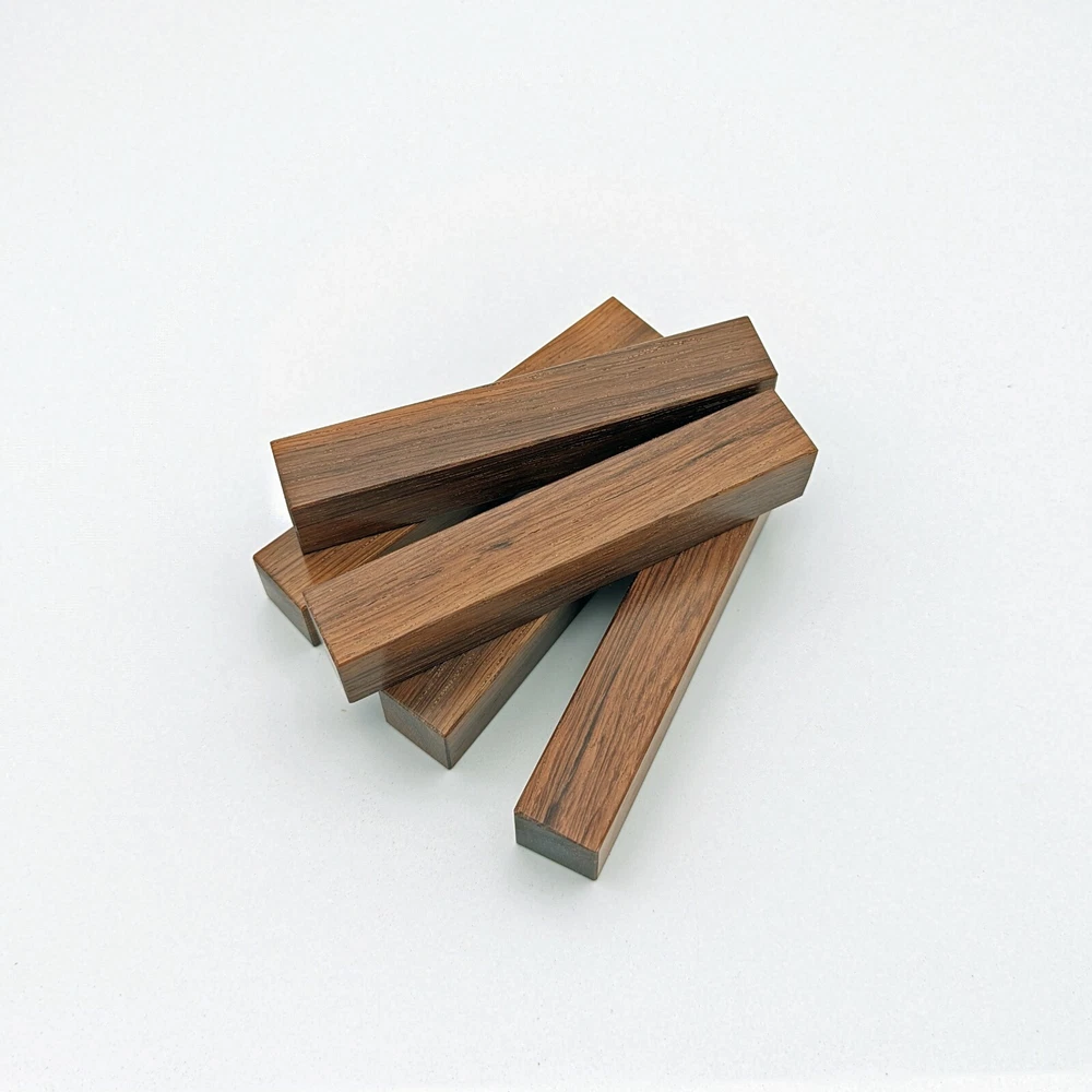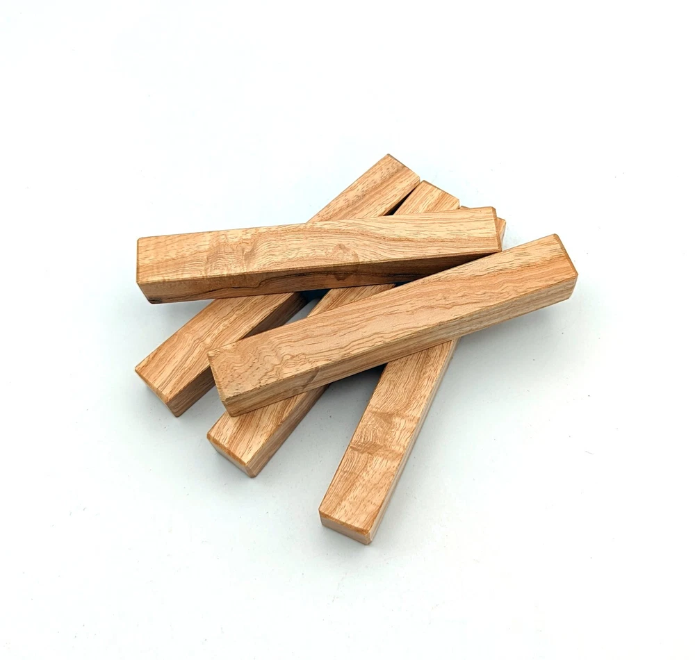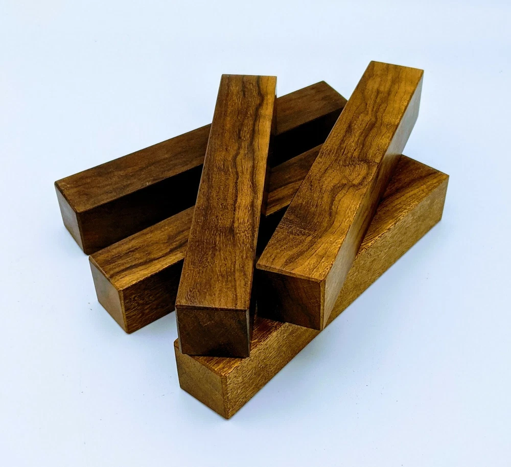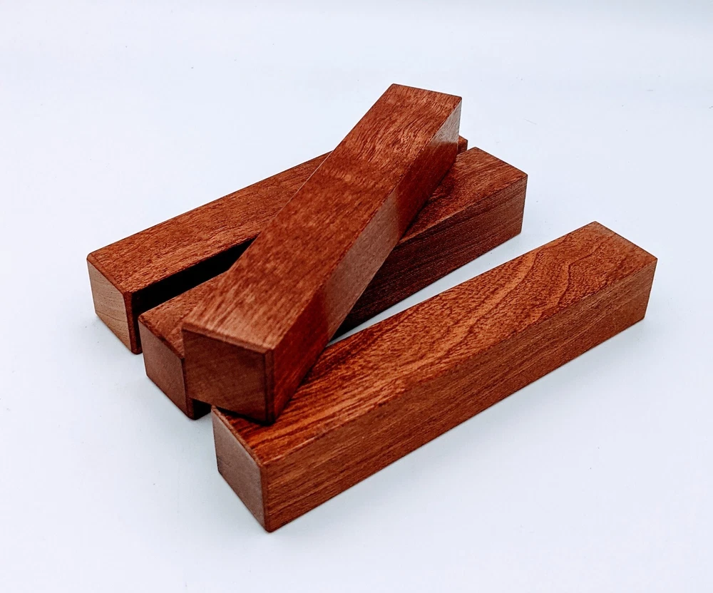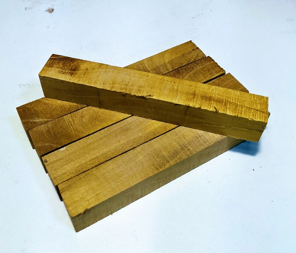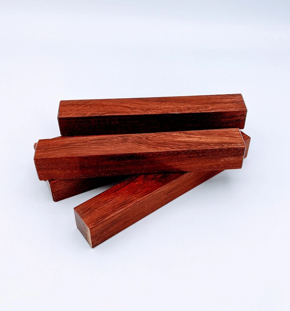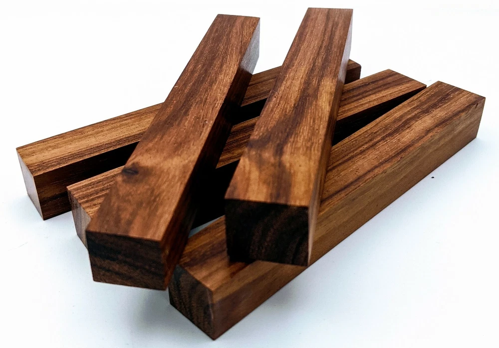 Choose the species from the drop-down. Why long blanks? Think about it. How much waste do you generally have using a single 5" blank for a single pen? When turning pens, I almost always cut the blanks 10" so that I can get 3 pens from a single blank. I'm now offering them to you! Price is for a single blank. Shipping starts at $4.99. The photos are from stock I cut, sanded to 320, then buffed with the Beall system. The blanks in the photos are for reference only. The items for sale are generally from the same stock. Measurements are approximate and may vary by +/- 1/8" Some blanks may contain inclusions and voids. Since I cut these myself, other sizes are available. Please message me if you desire another size or shape. If you would like to consider a bulk purchase, please contact me. Here is a list of our available species: Argentine Lignum Vitae: Extremely dense and durable, perfect for crafting high-end, long-lasting pen blanks. Ash - Black: Strong grain pattern, offers a bold and striking appearance for pen blanks. Ash - French: Tight grain with a subtle appearance, great for creating classic and elegant pens. Ash - White: Light color with fine texture, ideal for a clean and polished pen finish. Beli: Distinctive striping, adds visual interest and an exotic look to pen blanks. Bhilwara: Dense and durable with rich hues, suitable for creating long-lasting and visually appealing pens. Birch - African Bog: Dark, aged wood, creates a unique, antique feel for pens with a touch of history. Birch, Caramelized: Warm tones and smooth texture, perfect for crafting elegant and refined pens. Birch - Curly: Beautiful figuring adds dynamic visual movement, making pen blanks stand out. Bloodwood: Deep red color, offers a dramatic and luxurious look for striking pen blanks. Bocote: Eye-catching grain patterns, ideal for creating stunning and exotic pen designs. Boxwood - Castello: Fine-grained and pale, perfect for intricate and detailed pen work. Brazilian Blackheart (Pau Santo): Rich, dark tones, ideal for creating sophisticated and sleek pen blanks. Brazilian Tigerwood: Bold striping, adds a wild and exotic appearance to pen blanks. Brownheart: Smooth texture with a warm hue, perfect for creating understated and elegant pens. Bubinga: Reddish-brown with fine figuring, adds a touch of luxury to pen designs. Bubinga - Figured: Highly figured, making for eye-catching and intricate pen blanks. Camel Thorn: Dense and hard, offers durability with a striking red hue, perfect for long-lasting pens. Canarywood: Bright yellow with red streaks, creates vibrant and lively pen blanks. Catalpa: Light and easy to work with, great for beginners and natural finishes in pen crafting. Cerejeira: Fine texture with a golden hue, offers a classic and refined look for pen blanks. Cerejeira - Crotchwood: Intricate crotch figuring, ideal for creating unique and eye-catching pens. Ceylon Satinwood: Golden sheen with a fine texture, perfect for high-end and luxurious pens. Chakte Viga (Paela): Bright orange with fine grain, creates bold and distinctive pen blanks. Cherry: Warm red tones, classic and popular choice for crafting all types of pens. Cherry - Figured: Dynamic figuring enhances the traditional look, adding depth to cherry wood pens. Cocobolo: Rich color with striking patterns, ideal for crafting luxurious and durable pens. Crepe Myrtle (Pyinma): Fine grain with a warm hue, perfect for detailed and smooth pen work. Crepe Myrtle (Pyinma) - XG: Extra-figured, offers enhanced visual depth and complexity to pens. Ebiara (Red Zebrawood): Striped appearance, perfect for creating exotic and vibrant pen blanks. Ebony, Bolivian (Coffeewood): Dark and dense, ideal for sleek, sophisticated pen designs. Ebony - Brazilian (Gombeira): Deep black color with a smooth texture, excellent for premium pen blanks. Elm: Attractive grain and medium hardness, perfect for creating classic and durable pens. Etimoe: Reddish-brown with a tight grain, adds subtle elegance and richness to pen blanks. Granadillo: Reddish-brown with a fine texture, excellent for detailed and durable pen designs. Granadillo - Figured: Enhanced figuring adds visual interest and depth to Granadillo pen blanks. Hackberry: Light-colored with subtle grain, ideal for custom finishes and versatile pen designs. Hackberry - Spalted: Unique spalting patterns, creates stunning and one-of-a-kind pen blanks. Hickory (reclaimed): Strong and durable with a rustic appearance, perfect for crafting rugged pens. Holly: Bright white, perfect for creating contrasting or detailed work in pens. Imbuia: Rich, dark wood with a pleasant aroma, ideal for creating elegant and luxurious pens. Ipe: Extremely dense and durable, great for crafting heavy-use and long-lasting pens. Ironwood - Moluccan: Incredibly hard with a deep brown color, perfect for creating durable and long-lasting pens. Itauba: Golden-brown with a smooth texture, ideal for creating warm and elegant pen blanks. Jarrah: Reddish with a rich grain, great for classic and refined pen designs. Jatoba (Brazilian Cherry): Extremely hard with a deep red hue, perfect for high-durability and striking pen blanks. Kentucky Coffee Tree: Light color with a fine grain, ideal for easy finishing and classic pen designs. Kiaat (Muninga): Attractive golden-brown with interlocking grain, adds character to pen blanks. Koa: Rich color with fine figuring, perfect for creating beautiful, high-end pens. Lacewood: Distinctive flecked grain, ideal for crafting eye-catching and textured pen blanks. Leopardwood: Spotted appearance, perfect for creating unique and striking pen designs. Limba - White: Light-colored wood with a subtle grain, perfect for creating clean and minimalist pens. Locust - Honey: Warm golden hue, ideal for creating pens with a rustic and natural charm. Louro Preto: Dark, rich wood with fine texture, perfect for creating elegant and polished pens. Louro Preto - Figured (wormy): Unique figuring adds character and depth to Louro Pret