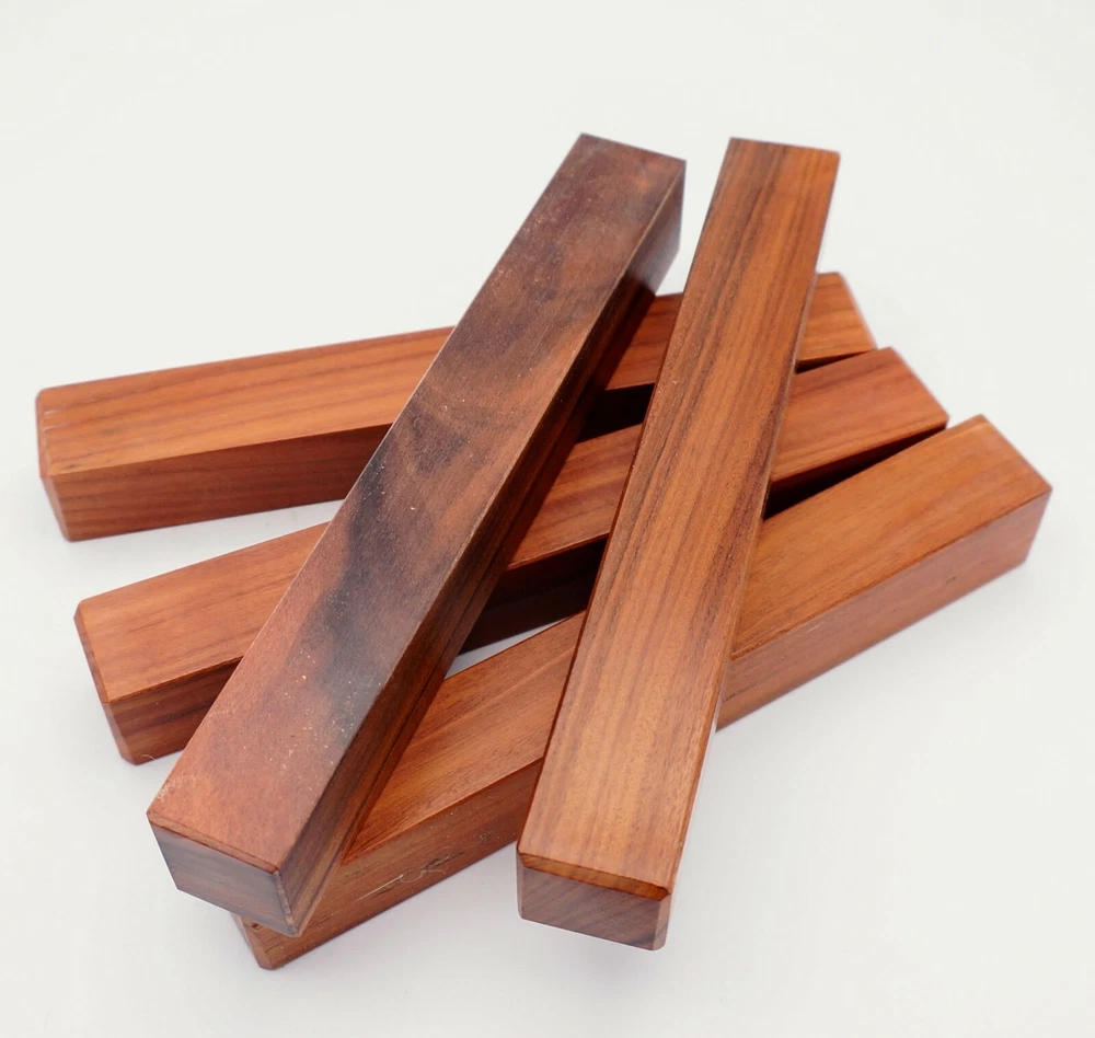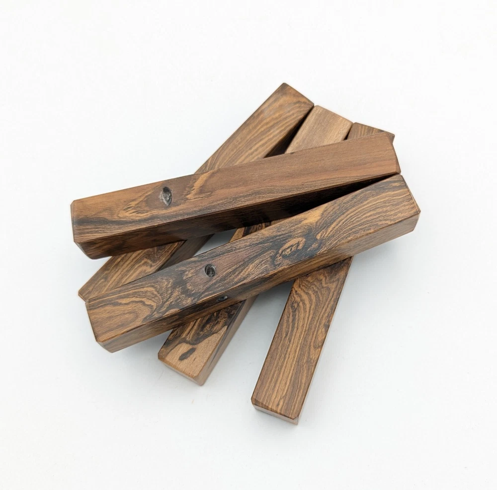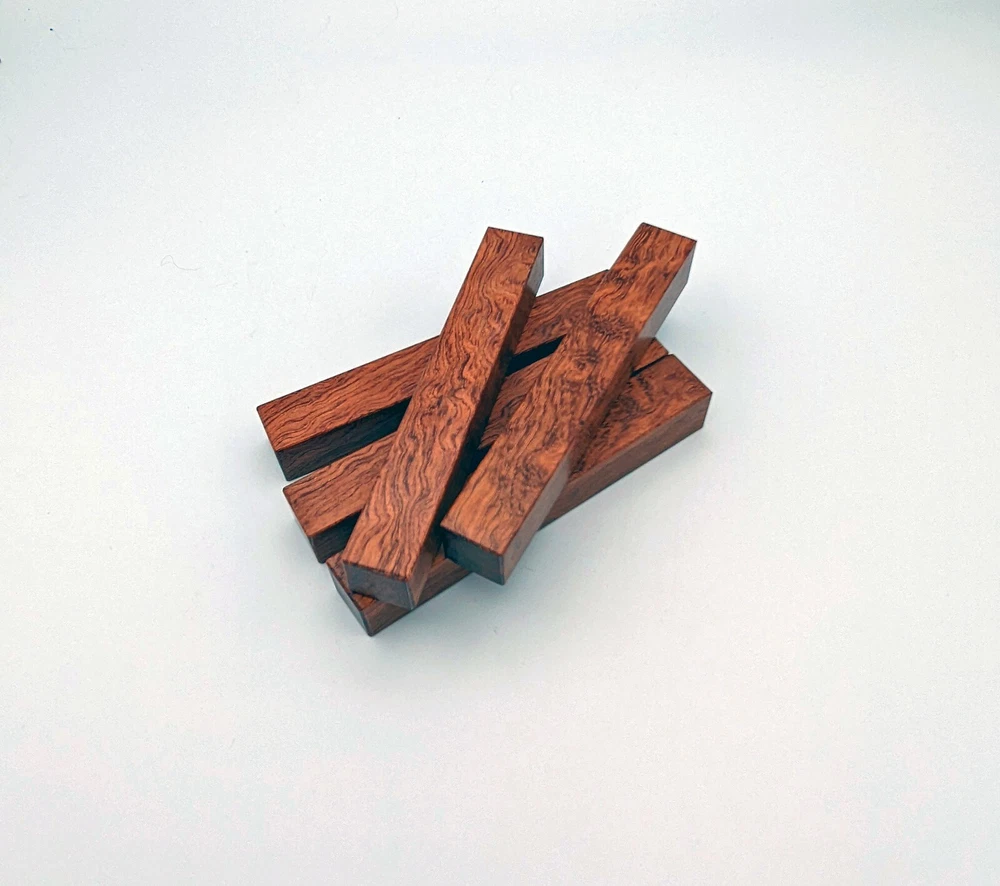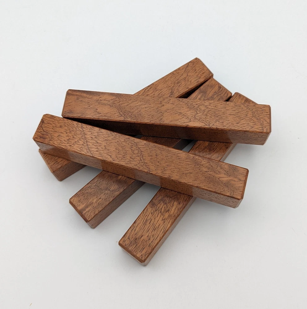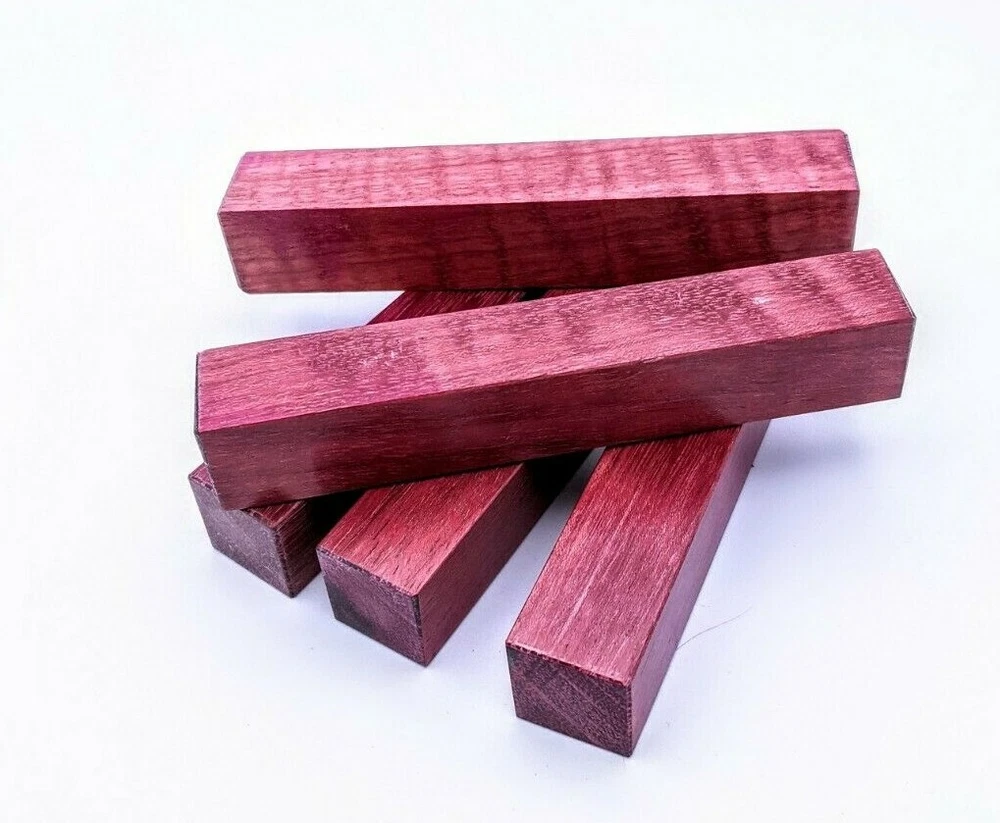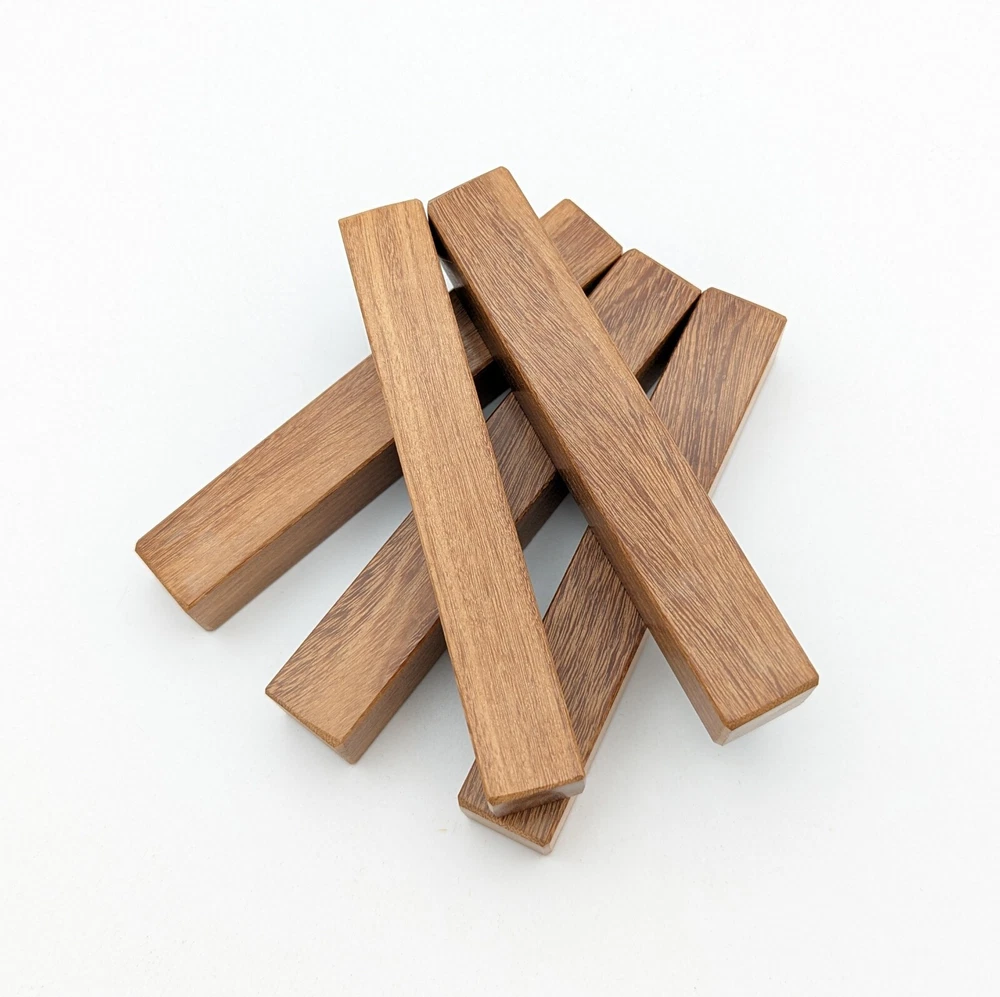Choose the species from the drop-down. Why long blanks? Think about it. How much waste do you generally have using a single 5" blank for a single pen? When turning pens, I almost always cut the blanks 10" so that I can get 3 pens from a single blank. I'm now offering them to you! Price is for a single blank. Shipping starts at $4.99. The photos are from stock I cut, sanded to 320, then buffed with the Beall system. The blanks in the photos are for reference only. The items for sale are generally from the same stock. Measurements are approximate and may vary by +/- 1/8" Some blanks may contain inclusions and voids. Since I cut these myself, other sizes are available. Please message me if you desire another size or shape. If you would like to consider a bulk purchase, please contact me. Here is a list of our available species: Argentine Lignum Vitae: Extremely dense and durable, perfect for crafting high-end, long-lasting pen blanks. Ash - Black: Strong grain pattern, offers a bold and striking appearance for pen blanks. Ash - French: Tight grain with a subtle appearance, great for creating classic and elegant pens. Ash - White: Light color with fine texture, ideal for a clean and polished pen finish. Beli: Distinctive striping, adds visual interest and an exotic look to pen blanks. Bhilwara: Dense and durable with rich hues, suitable for creating long-lasting and visually appealing pens. Birch - African Bog: Dark, aged wood, creates a unique, antique feel for pens with a touch of history. Birch, Caramelized: Warm tones and smooth texture, perfect for crafting elegant and refined pens. Birch - Curly: Beautiful figuring adds dynamic visual movement, making pen blanks stand out. Bloodwood: Deep red color, offers a dramatic and luxurious look for striking pen blanks. Bocote: Eye-catching grain patterns, ideal for creating stunning and exotic pen designs. Boxwood - Castello: Fine-grained and pale, perfect for intricate and detailed pen work. Brazilian Blackheart (Pau Santo): Rich, dark tones, ideal for creating sophisticated and sleek pen blanks. Brazilian Tigerwood: Bold striping, adds a wild and exotic appearance to pen blanks. Brownheart: Smooth texture with a warm hue, perfect for creating understated and elegant pens. Bubinga: Reddish-brown with fine figuring, adds a touch of luxury to pen designs. Bubinga - Figured: Highly figured, making for eye-catching and intricate pen blanks. Camel Thorn: Dense and hard, offers durability with a striking red hue, perfect for long-lasting pens. Canarywood: Bright yellow with red streaks, creates vibrant and lively pen blanks. Catalpa: Light and easy to work with, great for beginners and natural finishes in pen crafting. Cerejeira: Fine texture with a golden hue, offers a classic and refined look for pen blanks. Cerejeira - Crotchwood: Intricate crotch figuring, ideal for creating unique and eye-catching pens. Ceylon Satinwood: Golden sheen with a fine texture, perfect for high-end and luxurious pens. Chakte Viga (Paela): Bright orange with fine grain, creates bold and distinctive pen blanks. Cherry: Warm red tones, classic and popular choice for crafting all types of pens. Cherry - Figured: Dynamic figuring enhances the traditional look, adding depth to cherry wood pens. Cocobolo: Rich color with striking patterns, ideal for crafting luxurious and durable pens. Crepe Myrtle (Pyinma): Fine grain with a warm hue, perfect for detailed and smooth pen work. Crepe Myrtle (Pyinma) - XG: Extra-figured, offers enhanced visual depth and complexity to pens. Ebiara (Red Zebrawood): Striped appearance, perfect for creating exotic and vibrant pen blanks. Ebony, Bolivian (Coffeewood): Dark and dense, ideal for sleek, sophisticated pen designs. Ebony - Brazilian (Gombeira): Deep black color with a smooth texture, excellent for premium pen blanks. Elm: Attractive grain and medium hardness, perfect for creating classic and durable pens. Etimoe: Reddish-brown with a tight grain, adds subtle elegance and richness to pen blanks. Granadillo: Reddish-brown with a fine texture, excellent for detailed and durable pen designs. Granadillo - Figured: Enhanced figuring adds visual interest and depth to Granadillo pen blanks. Hackberry: Light-colored with subtle grain, ideal for custom finishes and versatile pen designs. Hackberry - Spalted: Unique spalting patterns, creates stunning and one-of-a-kind pen blanks. Hickory (reclaimed): Strong and durable with a rustic appearance, perfect for crafting rugged pens. Holly: Bright white, perfect for creating contrasting or detailed work in pens. Imbuia: Rich, dark wood with a pleasant aroma, ideal for creating elegant and luxurious pens. Ipe: Extremely dense and durable, great for crafting heavy-use and long-lasting pens. Ironwood - Moluccan: Incredibly hard with a deep brown color, perfect for creating durable and long-lasting pens. Itauba: Golden-brown with a smooth texture, ideal for creating warm and elegant pen blanks. Jarrah: Reddish with a rich grain, great for classic and refined pen designs. Jatoba (Brazilian Cherry): Extremely hard with a deep red hue, perfect for high-durability and striking pen blanks. Kentucky Coffee Tree: Light color with a fine grain, ideal for easy finishing and classic pen designs. Kiaat (Muninga): Attractive golden-brown with interlocking grain, adds character to pen blanks. Koa: Rich color with fine figuring, perfect for creating beautiful, high-end pens. Lacewood: Distinctive flecked grain, ideal for crafting eye-catching and textured pen blanks. Leopardwood: Spotted appearance, perfect for creating unique and striking pen designs. Limba - White: Light-colored wood with a subtle grain, perfect for creating clean and minimalist pens. Locust - Honey: Warm golden hue, ideal for creating pens with a rustic and natural charm. Louro Preto: Dark, rich wood with fine texture, perfect for creating elegant and polished pens. Louro Preto - Figured (wormy): Unique figuring adds character and depth to Louro Pret