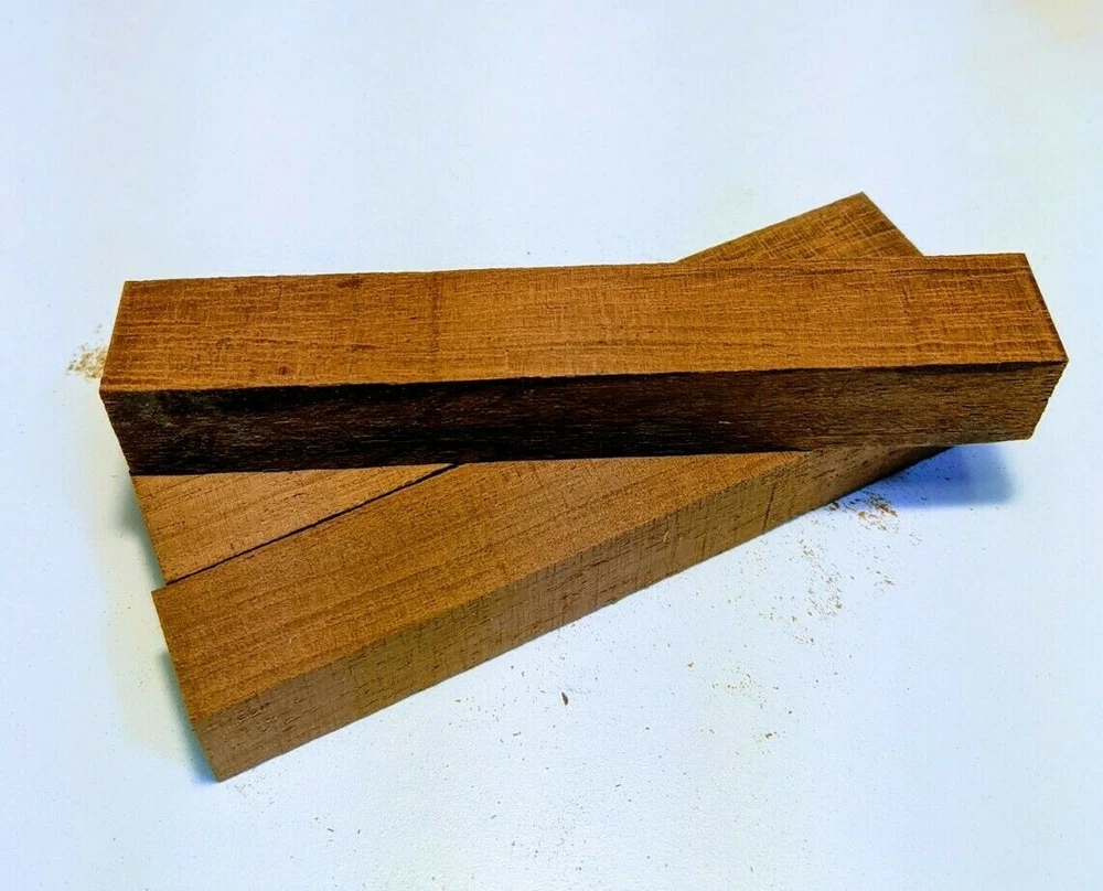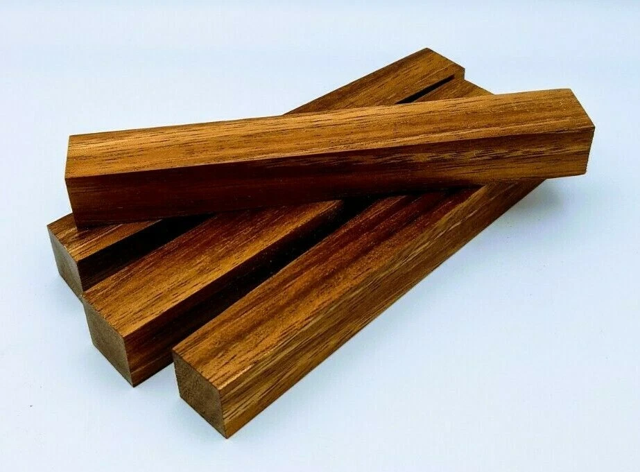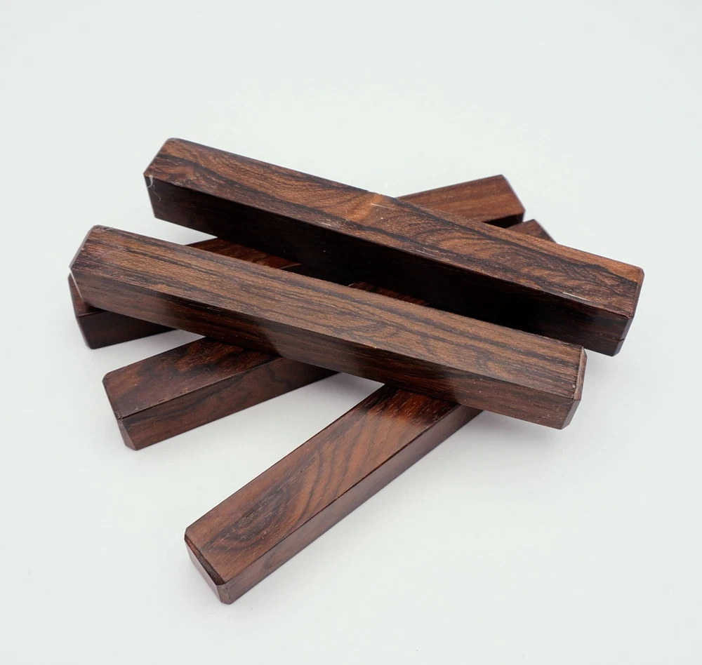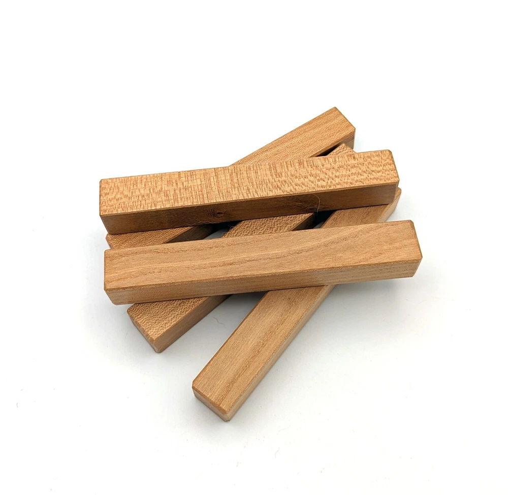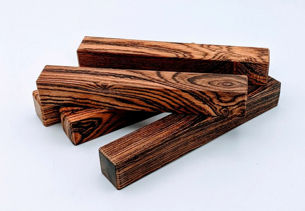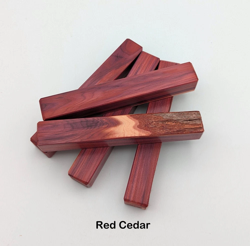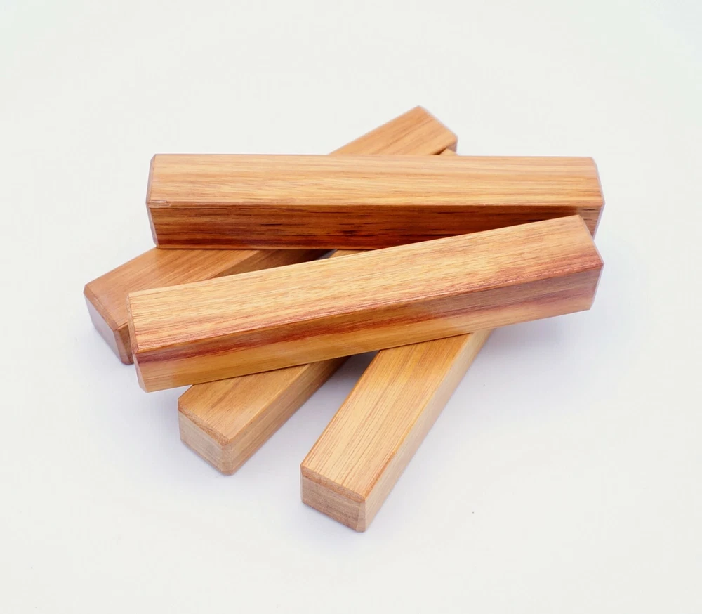 Choose the species from the drop-down. Why long blanks? Think about it. How much waste do you generally have using a single 5" blank for a single pen? When turning pens, I almost always cut the blanks 10" so that I can get 3 pens from a single blank. I'm now offering them to you! Price is for a single blank. Shipping starts at $4.99. The photos are from stock I cut, sanded to 320, then buffed with the Beall system. The blanks in the photos are for reference only. The items for sale are generally from the same stock. Measurements are approximate and may vary by +/- 1/8" Some blanks may contain inclusions and voids. Since I cut these myself, other sizes are available. Please message me if you desire another size or shape. If you would like to consider a bulk purchase, please contact me. Here is a list of our available species: Argentine Lignum Vitae: Extremely dense and durable, perfect for crafting high-end, long-lasting pen blanks. Ash - Black: Strong grain pattern, offers a bold and striking appearance for pen blanks. Ash - French: Tight grain with a subtle appearance, great for creating classic and elegant pens. Ash - White: Light color with fine texture, ideal for a clean and polished pen finish. Beli: Distinctive striping, adds visual interest and an exotic look to pen blanks. Bhilwara: Dense and durable with rich hues, suitable for creating long-lasting and visually appealing pens. Birch - African Bog: Dark, aged wood, creates a unique, antique feel for pens with a touch of history. Birch, Caramelized: Warm tones and smooth texture, perfect for crafting elegant and refined pens. Birch - Curly: Beautiful figuring adds dynamic visual movement, making pen blanks stand out. Bloodwood: Deep red color, offers a dramatic and luxurious look for striking pen blanks. Bocote: Eye-catching grain patterns, ideal for creating stunning and exotic pen designs. Boxwood - Castello: Fine-grained and pale, perfect for intricate and detailed pen work. Brazilian Blackheart (Pau Santo): Rich, dark tones, ideal for creating sophisticated and sleek pen blanks. Brazilian Tigerwood: Bold striping, adds a wild and exotic appearance to pen blanks. Brownheart: Smooth texture with a warm hue, perfect for creating understated and elegant pens. Bubinga: Reddish-brown with fine figuring, adds a touch of luxury to pen designs. Bubinga - Figured: Highly figured, making for eye-catching and intricate pen blanks. Camel Thorn: Dense and hard, offers durability with a striking red hue, perfect for long-lasting pens. Canarywood: Bright yellow with red streaks, creates vibrant and lively pen blanks. Catalpa: Light and easy to work with, great for beginners and natural finishes in pen crafting. Cerejeira: Fine texture with a golden hue, offers a classic and refined look for pen blanks. Cerejeira - Crotchwood: Intricate crotch figuring, ideal for creating unique and eye-catching pens. Ceylon Satinwood: Golden sheen with a fine texture, perfect for high-end and luxurious pens. Chakte Viga (Paela): Bright orange with fine grain, creates bold and distinctive pen blanks. Cherry: Warm red tones, classic and popular choice for crafting all types of pens. Cherry - Figured: Dynamic figuring enhances the traditional look, adding depth to cherry wood pens. Cocobolo: Rich color with striking patterns, ideal for crafting luxurious and durable pens. Crepe Myrtle (Pyinma): Fine grain with a warm hue, perfect for detailed and smooth pen work. Crepe Myrtle (Pyinma) - XG: Extra-figured, offers enhanced visual depth and complexity to pens. Ebiara (Red Zebrawood): Striped appearance, perfect for creating exotic and vibrant pen blanks. Ebony, Bolivian (Coffeewood): Dark and dense, ideal for sleek, sophisticated pen designs. Ebony - Brazilian (Gombeira): Deep black color with a smooth texture, excellent for premium pen blanks. Elm: Attractive grain and medium hardness, perfect for creating classic and durable pens. Etimoe: Reddish-brown with a tight grain, adds subtle elegance and richness to pen blanks. Granadillo: Reddish-brown with a fine texture, excellent for detailed and durable pen designs. Granadillo - Figured: Enhanced figuring adds visual interest and depth to Granadillo pen blanks. Hackberry: Light-colored with subtle grain, ideal for custom finishes and versatile pen designs. Hackberry - Spalted: Unique spalting patterns, creates stunning and one-of-a-kind pen blanks. Hickory (reclaimed): Strong and durable with a rustic appearance, perfect for crafting rugged pens. Holly: Bright white, perfect for creating contrasting or detailed work in pens. Imbuia: Rich, dark wood with a pleasant aroma, ideal for creating elegant and luxurious pens. Ipe: Extremely dense and durable, great for crafting heavy-use and long-lasting pens. Ironwood - Moluccan: Incredibly hard with a deep brown color, perfect for creating durable and long-lasting pens. Itauba: Golden-brown with a smooth texture, ideal for creating warm and elegant pen blanks. Jarrah: Reddish with a rich grain, great for classic and refined pen designs. Jatoba (Brazilian Cherry): Extremely hard with a deep red hue, perfect for high-durability and striking pen blanks. Kentucky Coffee Tree: Light color with a fine grain, ideal for easy finishing and classic pen designs. Kiaat (Muninga): Attractive golden-brown with interlocking grain, adds character to pen blanks. Koa: Rich color with fine figuring, perfect for creating beautiful, high-end pens. Lacewood: Distinctive flecked grain, ideal for crafting eye-catching and textured pen blanks. Leopardwood: Spotted appearance, perfect for creating unique and striking pen designs. Limba - White: Light-colored wood with a subtle grain, perfect for creating clean and minimalist pens. Locust - Honey: Warm golden hue, ideal for creating pens with a rustic and natural charm. Louro Preto: Dark, rich wood with fine texture, perfect for creating elegant and polished pens. Louro Preto - Figured (wormy): Unique figuring adds character and depth to Louro Pret