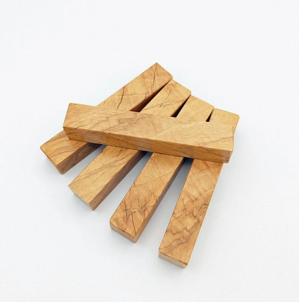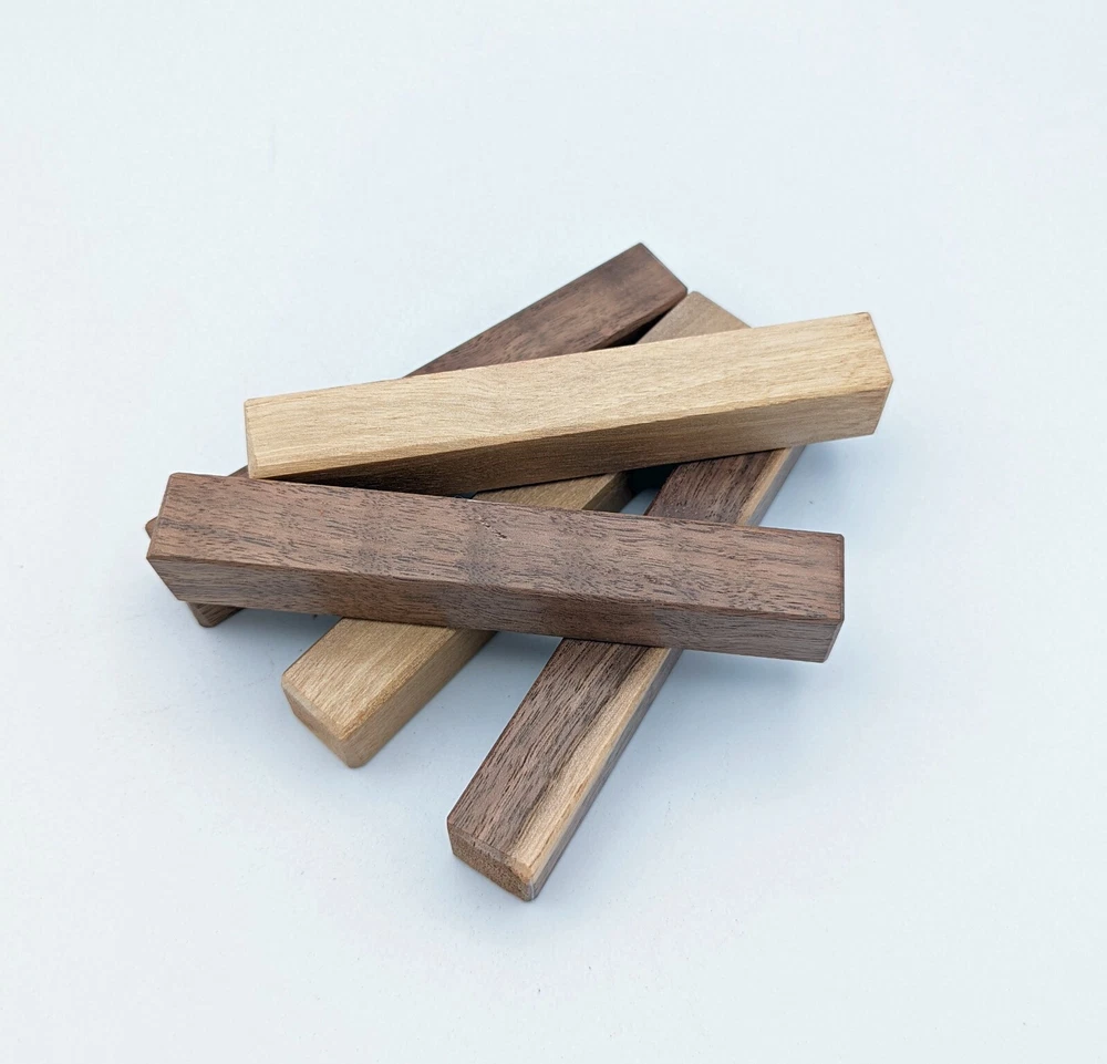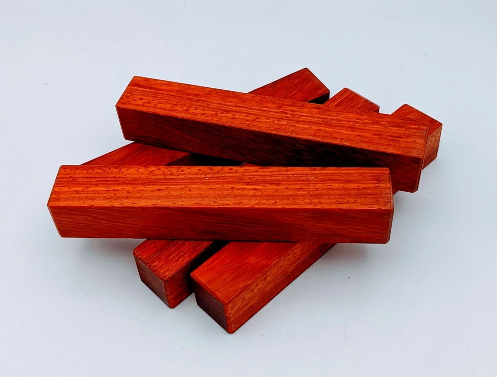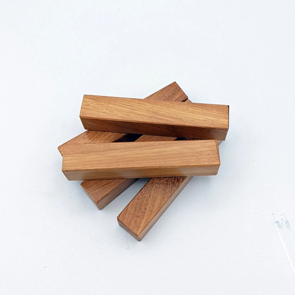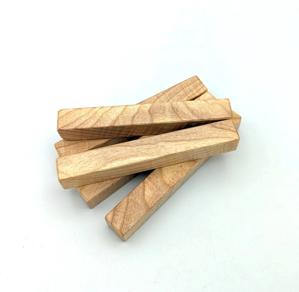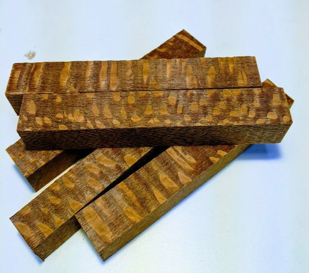 Choose the species from the drop-down. Why long blanks? Think about it. How much waste do you generally have using a single 5" blank for a single pen? When turning pens, I almost always cut the blanks 10" so that I can get 3 pens from a single blank. I'm now offering them to you! Price is for a single blank. Shipping starts at $4.99. The photos are from stock I cut, sanded to 320, then buffed with the Beall system. The blanks in the photos are for reference only. The items for sale are generally from the same stock. Measurements are approximate and may vary by +/- 1/8" Some blanks may contain inclusions and voids. Since I cut these myself, other sizes are available. Please message me if you desire another size or shape. If you would like to consider a bulk purchase, please contact me. Here is a list of our available species: Argentine Lignum Vitae: Extremely dense and durable, perfect for crafting high-end, long-lasting pen blanks. Ash - Black: Strong grain pattern, offers a bold and striking appearance for pen blanks. Ash - French: Tight grain with a subtle appearance, great for creating classic and elegant pens. Ash - White: Light color with fine texture, ideal for a clean and polished pen finish. Beli: Distinctive striping, adds visual interest and an exotic look to pen blanks. Bhilwara: Dense and durable with rich hues, suitable for creating long-lasting and visually appealing pens. Birch - African Bog: Dark, aged wood, creates a unique, antique feel for pens with a touch of history. Birch, Caramelized: Warm tones and smooth texture, perfect for crafting elegant and refined pens. Birch - Curly: Beautiful figuring adds dynamic visual movement, making pen blanks stand out. Bloodwood: Deep red color, offers a dramatic and luxurious look for striking pen blanks. Bocote: Eye-catching grain patterns, ideal for creating stunning and exotic pen designs. Boxwood - Castello: Fine-grained and pale, perfect for intricate and detailed pen work. Brazilian Blackheart (Pau Santo): Rich, dark tones, ideal for creating sophisticated and sleek pen blanks. Brazilian Tigerwood: Bold striping, adds a wild and exotic appearance to pen blanks. Brownheart: Smooth texture with a warm hue, perfect for creating understated and elegant pens. Bubinga: Reddish-brown with fine figuring, adds a touch of luxury to pen designs. Bubinga - Figured: Highly figured, making for eye-catching and intricate pen blanks. Camel Thorn: Dense and hard, offers durability with a striking red hue, perfect for long-lasting pens. Canarywood: Bright yellow with red streaks, creates vibrant and lively pen blanks. Catalpa: Light and easy to work with, great for beginners and natural finishes in pen crafting. Cerejeira: Fine texture with a golden hue, offers a classic and refined look for pen blanks. Cerejeira - Crotchwood: Intricate crotch figuring, ideal for creating unique and eye-catching pens. Ceylon Satinwood: Golden sheen with a fine texture, perfect for high-end and luxurious pens. Chakte Viga (Paela): Bright orange with fine grain, creates bold and distinctive pen blanks. Cherry: Warm red tones, classic and popular choice for crafting all types of pens. Cherry - Figured: Dynamic figuring enhances the traditional look, adding depth to cherry wood pens. Cocobolo: Rich color with striking patterns, ideal for crafting luxurious and durable pens. Crepe Myrtle (Pyinma): Fine grain with a warm hue, perfect for detailed and smooth pen work. Crepe Myrtle (Pyinma) - XG: Extra-figured, offers enhanced visual depth and complexity to pens. Ebiara (Red Zebrawood): Striped appearance, perfect for creating exotic and vibrant pen blanks. Ebony, Bolivian (Coffeewood): Dark and dense, ideal for sleek, sophisticated pen designs. Ebony - Brazilian (Gombeira): Deep black color with a smooth texture, excellent for premium pen blanks. Elm: Attractive grain and medium hardness, perfect for creating classic and durable pens. Etimoe: Reddish-brown with a tight grain, adds subtle elegance and richness to pen blanks. Granadillo: Reddish-brown with a fine texture, excellent for detailed and durable pen designs. Granadillo - Figured: Enhanced figuring adds visual interest and depth to Granadillo pen blanks. Hackberry: Light-colored with subtle grain, ideal for custom finishes and versatile pen designs. Hackberry - Spalted: Unique spalting patterns, creates stunning and one-of-a-kind pen blanks. Hickory (reclaimed): Strong and durable with a rustic appearance, perfect for crafting rugged pens. Holly: Bright white, perfect for creating contrasting or detailed work in pens. Imbuia: Rich, dark wood with a pleasant aroma, ideal for creating elegant and luxurious pens. Ipe: Extremely dense and durable, great for crafting heavy-use and long-lasting pens. Ironwood - Moluccan: Incredibly hard with a deep brown color, perfect for creating durable and long-lasting pens. Itauba: Golden-brown with a smooth texture, ideal for creating warm and elegant pen blanks. Jarrah: Reddish with a rich grain, great for classic and refined pen designs. Jatoba (Brazilian Cherry): Extremely hard with a deep red hue, perfect for high-durability and striking pen blanks. Kentucky Coffee Tree: Light color with a fine grain, ideal for easy finishing and classic pen designs. Kiaat (Muninga): Attractive golden-brown with interlocking grain, adds character to pen blanks. Koa: Rich color with fine figuring, perfect for creating beautiful, high-end pens. Lacewood: Distinctive flecked grain, ideal for crafting eye-catching and textured pen blanks. Leopardwood: Spotted appearance, perfect for creating unique and striking pen designs. Limba - White: Light-colored wood with a subtle grain, perfect for creating clean and minimalist pens. Locust - Honey: Warm golden hue, ideal for creating pens with a rustic and natural charm. Louro Preto: Dark, rich wood with fine texture, perfect for creating elegant and polished pens. Louro Preto - Figured (wormy): Unique figuring adds character and depth to Louro Pret