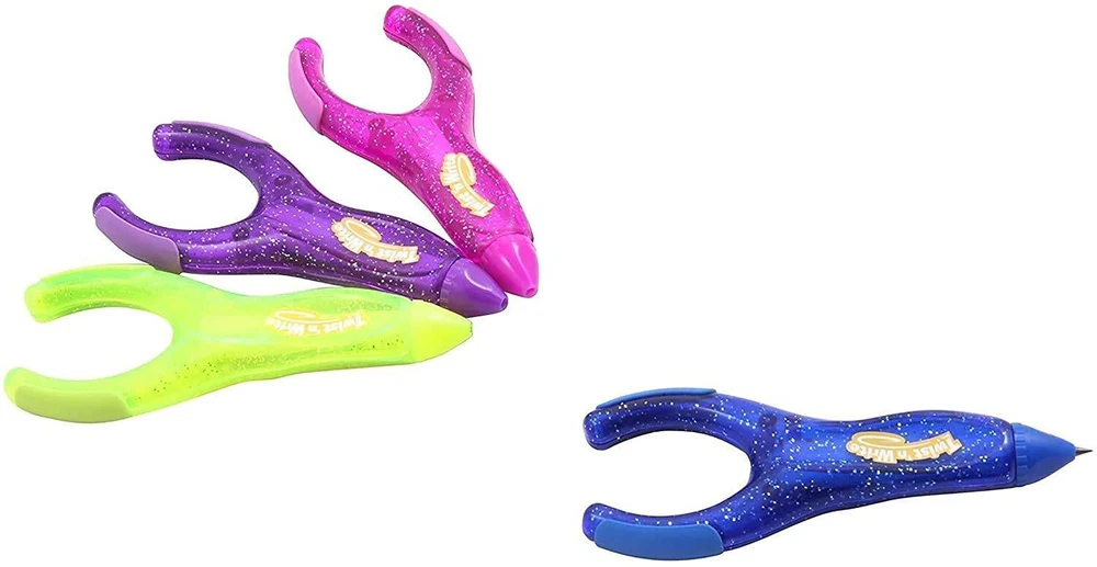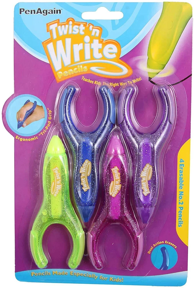 PenAgain Twist 'N Write Pencil Kids Learning Writing Assorted Colors 4 Count with 10 lead refills. Twist-n-Write Pencil is specially designed to fit smaller hands and make writing easier. The thick 2mm pencil lead never needs sharpening. Just twist the tip to expose more lead. Kids get excited about the Twist-n-Write because it puts the fun back into writing. The pen's wishbone shaped body naturally shapes the fingers into the school-taught "tripod" finger grasp. Whether your kids are doodling or practicing longhand, the soft rubber body and curvy shape are built for comfort. What Harry Potter books did to get kids reading again, Twist-n-Write will do to get them back to the joy of writing and help them focus on their content without worrying about their pencil grip or their writing speed. The Twist-n-Write 4-pack has pencils in green, pink, purple and blue. Set includes 4 Twist n Write Mechanical Pencils with additional 10 lead 2mm black lead refills. Unique wishbone shape develops and supports tripod grip Bright colors, 1 each of yellow, dark blue, magenta pink, purple and black refills Designed to fit small hands. Helps children learn to write with proper grip Refillable 2mm nontoxic lead. Erasers on each side of wishbone.