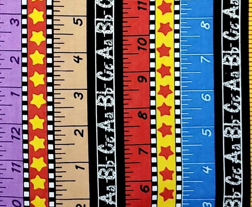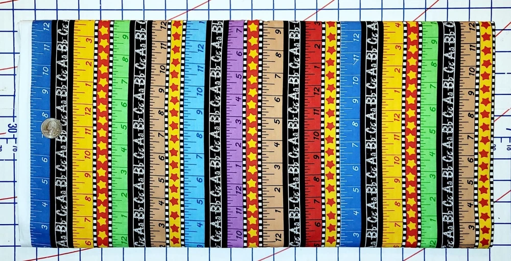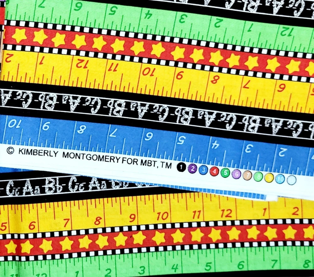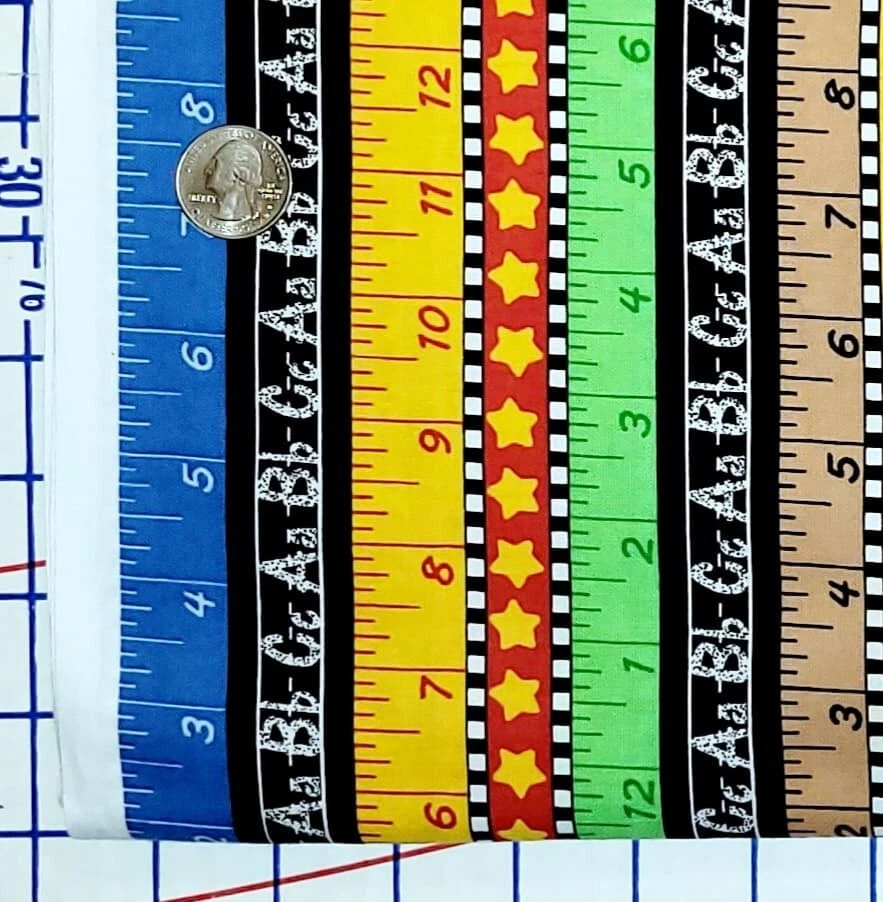 Welcome to Janey Lane Fabrics! Up for your consideration: A fabric by Kimberly Montgomery for MBT. This fabric has a ruler and chalkboard stripe in a multicolor stripe design. The stripes run lengthwise; parallel to the selvage. Condition: Laundered, pressed Fiber Content: 100% Width: Up to 45" Photos are taken with selvage edges of fabric to the left and right sides of the photo. Available for custom cuts for 1/2 yard or more? YES, please request a custom listing. Most requests will be considered. This fabric is being sold BY THE YARD (BTY). Purchases of more than ONE YARD will ship as a continuous length . Fabric orders less than 2 yards will be shipped first class via USPS. 2-5 yards $7.95 Priority Mail Flat rate envelope 6-20 yards $13.60 Priority Mail Medium Flat rate box To receive a shipping discount for two or more yards, add the items to your cart, then "request total from seller." You will be sent an invoice with the combined shipping cost. Smoke free / pet free home. Keep checking back as I will be listing more fabrics, notions, patterns, and trims. If you are looking for something you don't see here, let me know. I have a lot more inventory to list! Due to differences in computer monitors / screen resolution, actual colors may vary slightly from those shown. Please contact me for any questions before buying. Thank You!