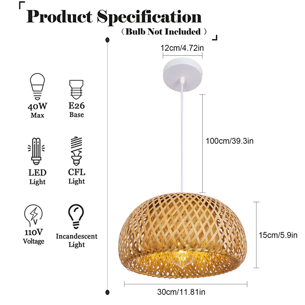 Details E26 Lamp Holder: The standard E26 lamp holder can be compatible with incandescent lamps, energy-saving lamps, LED lamps, halogen lamps, and other lamp types. Robust Base: The enlarged base(4.72in ) provides solid support for ceiling installation. Application It is suitable for residential and commercial applications such as cafes, restaurants, bars, offices, living rooms, bedrooms, corridors, entrances, libraries, clubs and kitchens to provide lighting and decorative functions with an illuminated area of about 32-53ft². Pendant Light Vintage Bamboo Wicker Rattan Shade Hanging Ceiling Lamp Fixture US Description The natural and antique bamboo chandelier has an excellent light transmission and can also project elegant and unique patterns to create an amazing lighting environment. Its simple yet stylish design ensures that it suits a wide range of interior styles and décor, making it an ideal choice for you to decorate your home or give to friends and relatives! Key Features High-quality Material: The natural bamboo and wood have excellent aging resistance, abrasion resistance and corrosion resistance , and are very healthy, providing a long service life. Good Decorative Effect: The hollow double-hemisphere appearance design highlights the comfortable and quiet pastoral style. It provides elegant decoration for any space and leaves a deep impression on guests. Custom Dimming : When used with dimmable bulbs and compatible dimming switches(not included), it can apply a dimming function. Soft &Warm Lighting: The hand-woven lampshade softens the light and protects your eyes from direct exposure. The light casts light shadows on the ceiling and surrounding walls through the hollow part, creating a comfortable and relaxed atmosphere. Easy to Install and Replace: Its simple structure and complete installation accessories allow you to complete the installation easily. Also, the open bottom facilitates the replacement of bulbs. Easy to Clean: It is dead space free for easy cleaning. All you need to do is sweep it gently with a chicken feather duster to remove the dust from it. Adjustable Chain: The light's chain length(39.3in) is adjustable to accommodate both high and low ceilings for better lighting and decorative effect. Customer Service: We aim to provide quality products and services. If you have any problems, please feel free to contact us. We will reply and solve the problem for you as soon as possible. Details E26 Lamp Holder: The standard E26 lamp holder can be compatible with incandescent lamps, energy-saving lamps, LED lamps, halogen lamps, and other lamp types. Robust Base : The enlarged base(4.72in ) provides solid support for ceiling installation. Application It is suitable for residential and commercial applications such as cafes, restaurants, bars, offices, living rooms, bedrooms, corridors, entrances, libraries, clubs and kitchens to provide lighting and decorative functions with an illuminated area of about 32-53ft². Notes 1. Before installation and cleaning, make sure that the power supply has been cut off. Before replacing the light bulb, please cut off the electricity supply and allow the bulb to cool. 2. Please use the lamp within the applicable voltage range and clean lamps regularly. 3. Please note that the bulb is not included in the package, you need to prepare an E26 bulb yourself. 4. Please do not be surprised by the original color of the bamboo pendant light when you receive it. Fresh bamboo material might look a little greenish at first, and it will become closer to beige wood color over time. 5. Please note that the lamp itself does not have a dimming function. 6. Please allow the slight color difference caused by the shooting light and 1-3cm error due to manual measurement, and make sure you do not mind before you order. Payment Delivery details Terms of sales About us Contact us Payment We accept ebay payment 。 Fees such as import duties, taxes are not included in the item price or shipping costs. These charges are the buyer's responsibility. Delivery details Shipping: 2-9 working days to: USA Terms of sales We maintain high standards of excellence and strive for hundred percent customer satisfaction. Feedback is very important to us. We hope that you contact us immediately before you give neutral or negative feedback, so that we can address your concerns. It is impossible to address issues if we do not know about them! About us Your satis faction is our ultimate goal. We work hard to earn your trust and future business. Our certified technicians have tested each item before shipping. The unit comes with 1 year limited warranty on all manufacturing defects. a) If you receive a defective item, you may return it or ask for a discount. Please contact us within 14 days after you receive the package. b) What you returned must be intact and in its original packaging as re? u. Customer is responsible for shipping costs of the returned item. c) We will cover the cost of shipping back t with the shipping rate indicated in the registration page. We will send you a new unit or refund the full payment you paid. Thank you. Contact us Business Hour Business Hour: Monday To Friday: 8:30 AM to 5:00 PM (Beijing China time) Due to time zones, our reply to your questions may not be immediately. But within above working time, we will reply your email within 24 hours. If it's non-workdays, please kindly be patient and wait till Monday. Please contact us with ebay message. Please feel free to contact us if you have any questions. Monday To Friday: 8:30 AM to 5:00 PM (Beijing China time) Due to time zones, our reply to your questions may not be immediately. But within above working time, we will reply your email within 24 hours. If it's non-workdays, please kindly be patient and wait till Monday. Please contact us with ebay message. Please feel free to contact us if you have any questions. Brand Unbranded Type Pendant Sensor Type / Style Antique Lighting Technology E26 Room Be