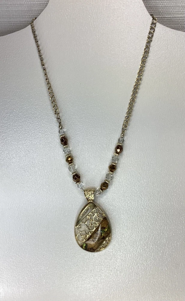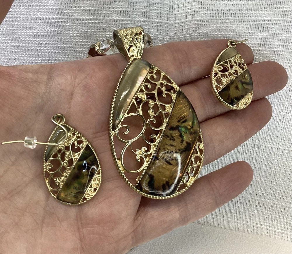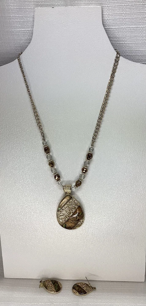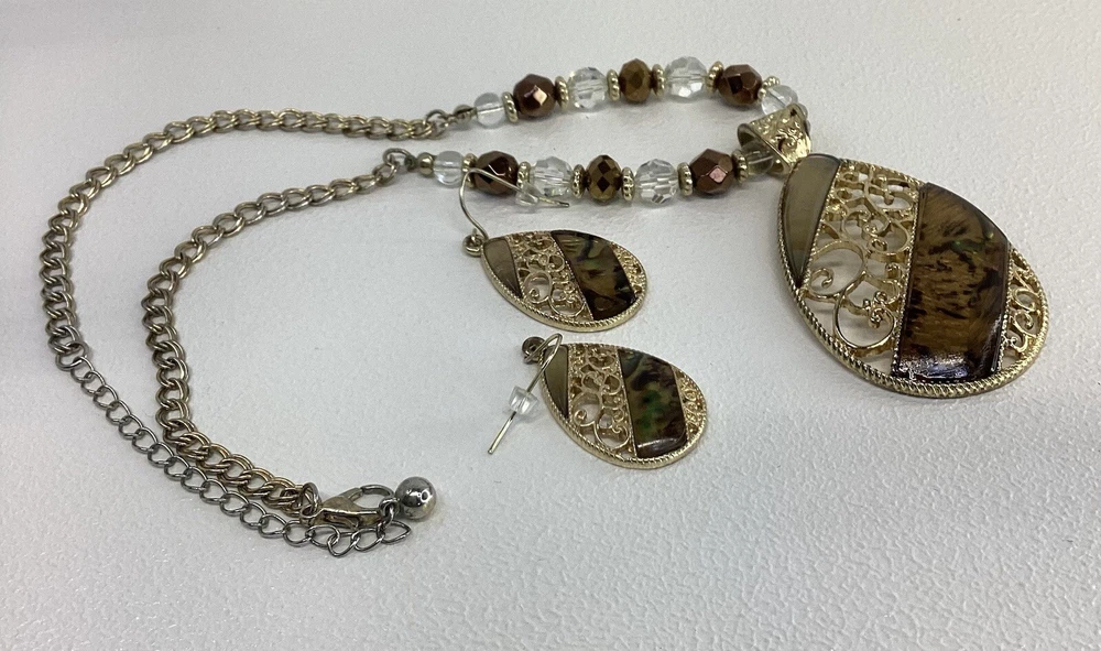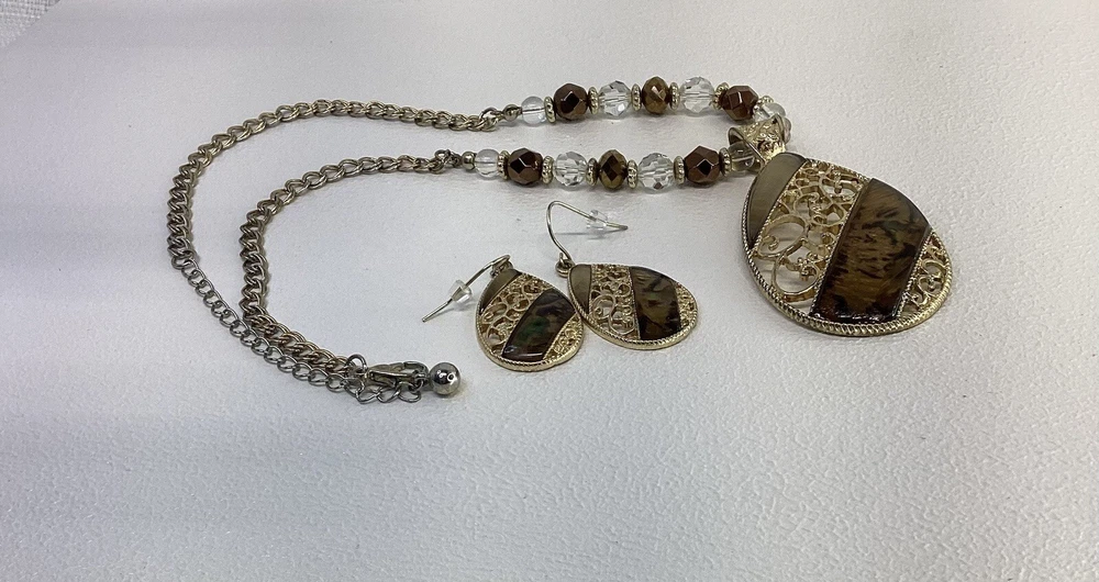 The necklace features a gold tone beaded chain with a beautiful resin teardrop pendant, adorned with intricate filigree detailing. The lobster closure ensures a secure fit, while the necklace length of 15 inches with 3” extension and adjustable features make it comfortable to wear for any occasion. The earrings complement the necklace perfectly, featuring the same resin teardrop design and gold tone beading. The set is perfect for those who love beauty and fashion and will make a great addition to any jewelry collection. The necklace and earrings are in excellent condition and are sure to impress. Pendant is approximately 2” tall/long Earrings are appropriately 1 1/2” tall/long