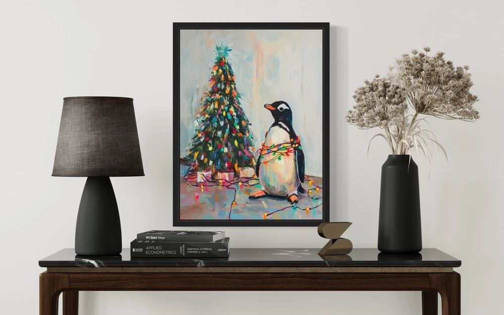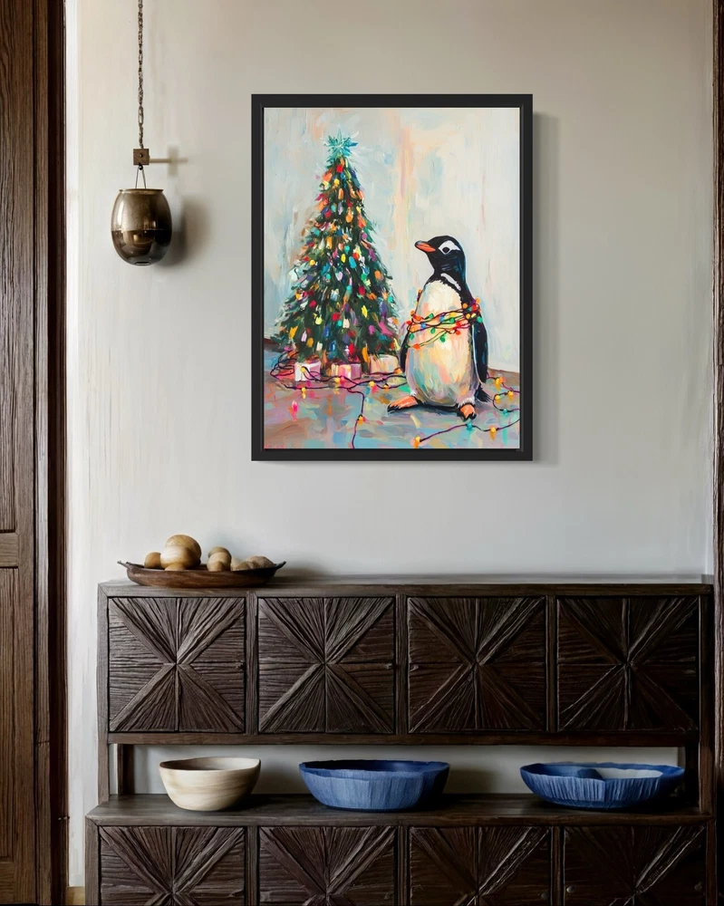 Penguin Tangled Christmas Lights Art Print Poster MATERIAL: 230 gsm Matte Paper SIZE INFORMATION 11x14 in - 27x35 cm 16x20 in - 40x50 cm 18x24 in - 45x60 cm 24x36 in - 60x90 cm HAVE IT FRAMED (BLACK FRAME OPTION AVAILABLE) 11x14 in - 27x35 cm 16x20 in - 40x50 cm 18x24 in - 44x60 cm SHIPPING & HANDLING All your orders will be carefully packaged in a hard tube box or standard USPS box if you buy it framed. Your order will be shipped within 1-3 business days and comes with a tracking number. All orders are made and shipped in the USA. WHAT WE VALUE We take pride in all our artwork and make sure all our customers are happy with their purchases. So if you have any questions or issues, please do contact us! We will respond to any questions and are happy to resolve any problems you may have. 30 DAYS MONEY BACK GUARANTEED! If for any reason you are not happy with your purchase, please send it back for a FULL REFUND.