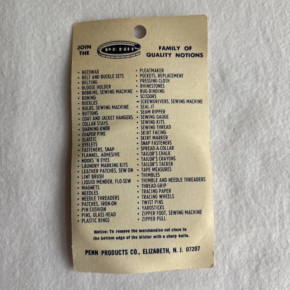 The Penn Assorted Sewing Needles in Select-O-Matic Case is a vintage set of 30 needles, with a mix of eye shape dependent upon needle size/purpose and sharp tip for precise stitching. Made by the trusted brand Penn and manufactured in Hong Kong, these hand sewing needles come in a convenient case for easy storage and organization. Perfect for crafters and seamstresses alike, this collection offers a variety of needles to suit different sewing needs. The unique Select-O-Matic Case allows storage of and easy access to individual needles, making it a practical addition to any sewing kit.