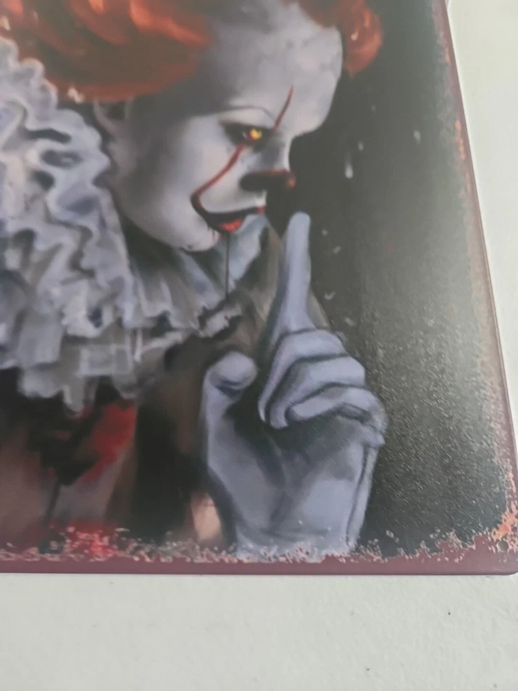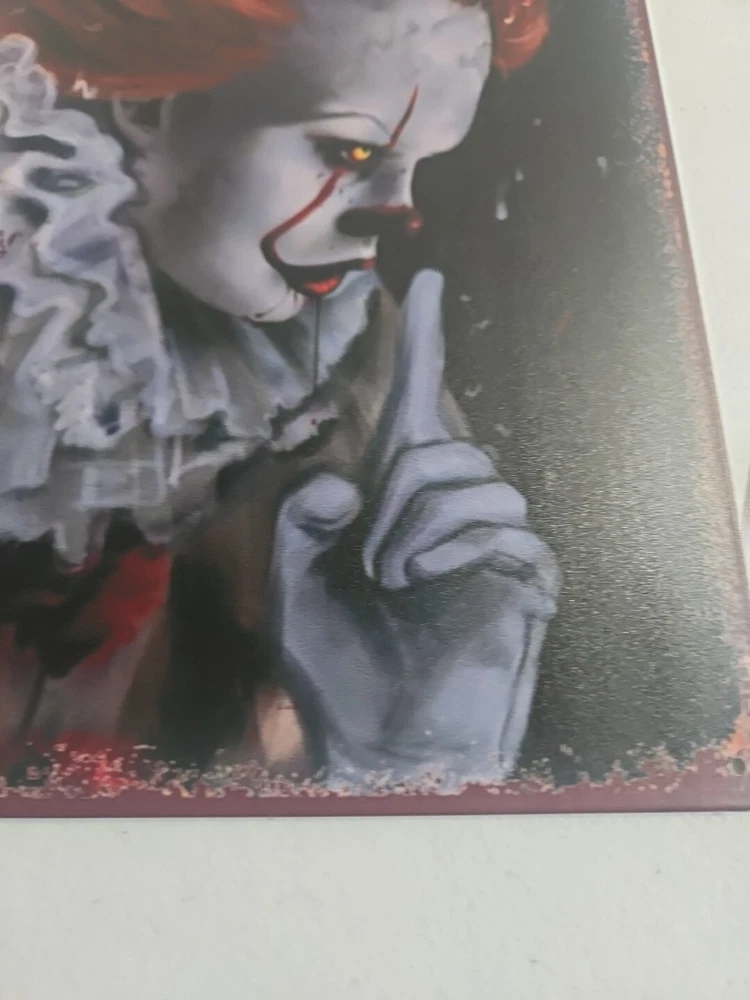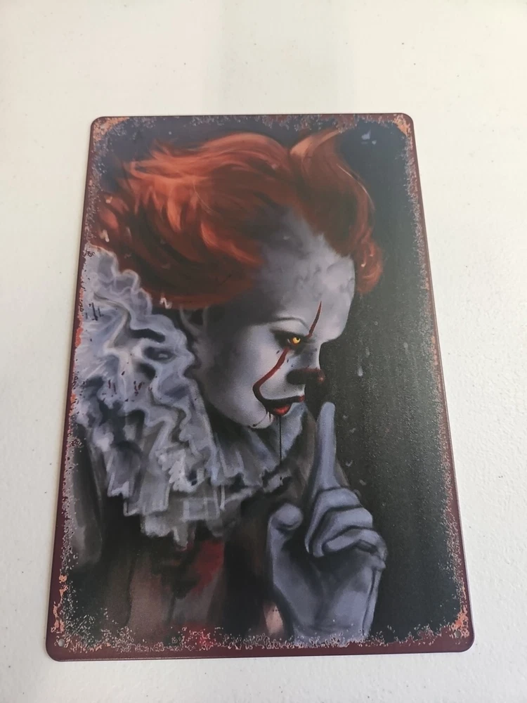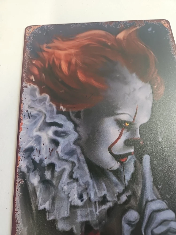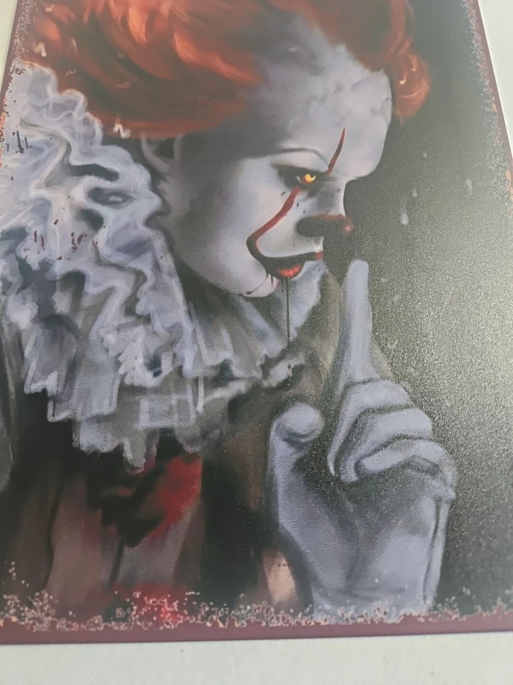 Add a touch of horror to your home décor with this rustic-looking 8x12 metal sign featuring the scary clown, Pennywise. The colorful and eye-catching design makes it the perfect addition to any room, whether it's your living room, bedroom, or even your garage. This sign is made of high-quality metal, ensuring that it will last for years to come. The sign is versatile and can be mounted on the wall, door or hung using the provided hanging features. It is ready to hang and comes with all the necessary accessories. The sign's size is perfect for indoor or outdoor decoration. Get ready to scare your guests with this unique and scary Pennywise sign.