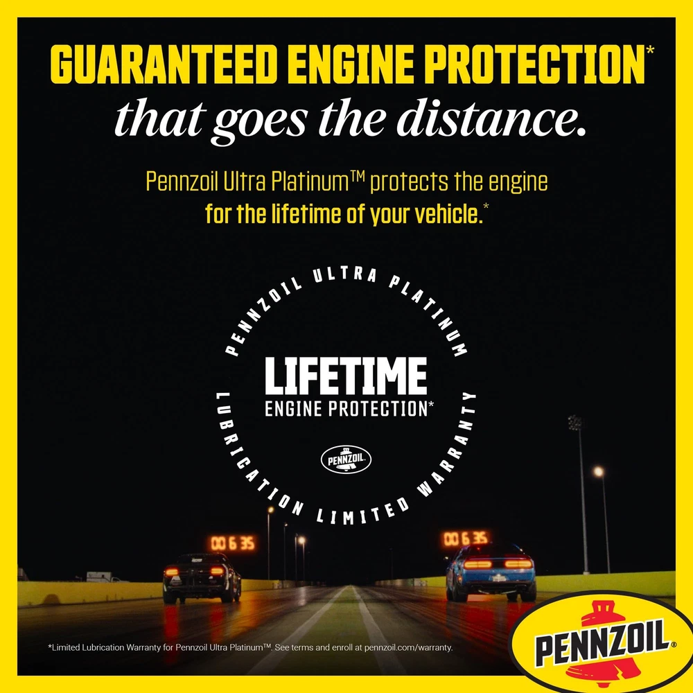 Pennzoil Ultra Platinum Full Synthetic 5W-20 Motor Oil, 5 Quart, Amber/Brown Product Details Our most advanced full synthetic 5W-20 engine oil, designed for unbeatable engine protection* Made with natural gas Outstanding performance in extreme temperatures Designed for high-performance engines, it helps protect engines from loss of power Provides unsurpassed wear protection for your engine (based on Sequence IVA wear test using SAE 5W-30) Provides better fuel economy (based on the latest industry standard) Exceeds the requirements of the following industry specifications: API SP, API SP-Resource Conserving, and all previous categories; ILSAC GF-6A; ACEA A1/B1 Meets or exceeds the following OEM requirements: Chrysler MS-6395; WSS-M2C960-A1 For a full list of equipment approvals and recommendations, please consult your local Shell Technical Help Desk and always consult your owner’s manual Pennzoil Ultra Platinum Full Synthetic 5W-20 motor oil is our most advanced formulation with unbeatable wear and sludge protection, as well as unbeatable cleanliness. When it comes to torturous driving conditions, trust the unbeatable engine protection* of Pennzoil Ultra Platinum. It far exceeds the most stringent car manufacturer requirements for cleanliness and protection (based on ILSAC GF-6); it offers outstanding performance in extreme temperatures and better fuel economy (based on the latest industry standard). Pennzoil Ultra Platinum helps extend the life of your engine and protects for up to 20 years or 750,000 miles, whichever comes first**, to give you peace of mind to drive every mile as hard as you can, from your daily commute to sand dunes and mountain terrain (*Based on Sequence IVA wear test; Sequence IIIH oxidation and deposit test; and the Sequence VH sludge test. **Pennzoil Ultra Platinum Lubrication Limited Warranty: Up to 20 years or 750,000 miles, whichever comes first, if you exclusively use Pennzoil Ultra Platinum Full Synthetic motor oil. Your engine must have fewer than 125,000 miles and have been manufactured in the past 72 months. To maintain your warranty, change your vehicle’s oil and oil filter at least as often as recommended by the vehicle manufacturer. Enrollment required. Keep your receipts. Other conditions apply. See to enroll and for full details and terms.)