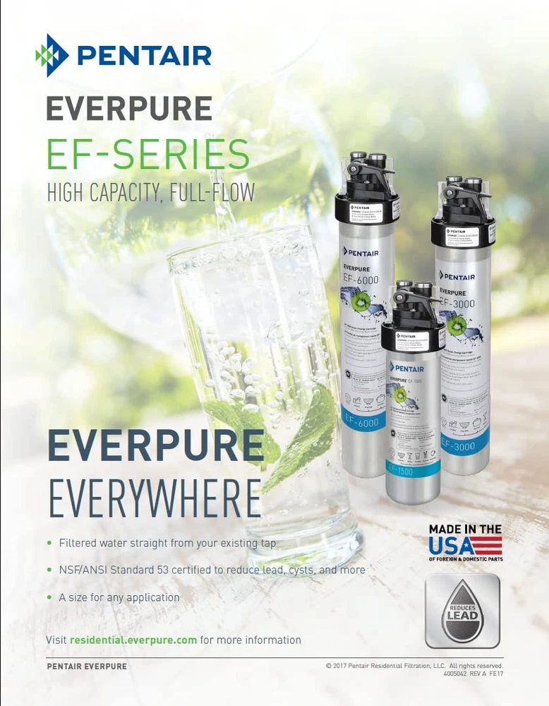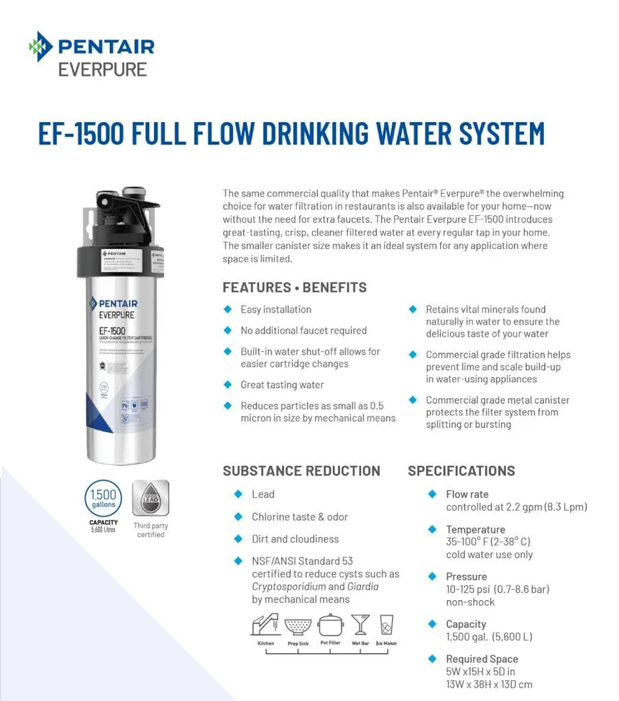 The same commercial quality that makes Pentair the overwhelming choice for water filtration in restaurants is also available for your home - now without the need for extra faucets. The Pentair EF-1500 introduces great-tasting, crisp, clean filtered water at every regular tap in your home. The smaller canister size makes it an ideal system for any application where space is limited. INTRODUCES GREAT-TASTING, CRISP, CLEAN FILTERED WATER at every regular tap in your home. Smaller canister size is ideal system for use in the bathroom or where space is limited (Installation space required: 5W x 15H x 5D inch) COMMERCIAL GRADE WATER FOR YOUR HOME - Reduces Lead, Chlorine Taste & Odor, Dirt, Cloudiness and particles as small as 0.5 micron. NSF/ANSI Standard 53 & 401 certified to reduce Microplastics and cysts (such as Cryptosporidium and Giardia). EASY INSTALLATION AND MAINTENANCE - No separate faucet required! Bulit-in water shut-off allows for easier cartridge change. System includes filter head, filter cartridge, all hardware and connectors FILTERS 1,500 GALLONS equivalent to 11,300 bottles of water (at 2.2 gpm flow) MADE IN THE USA - Pentair EF series products are made in the USA and use commercial grade metal containers that protect the filter system from splitting or bursting