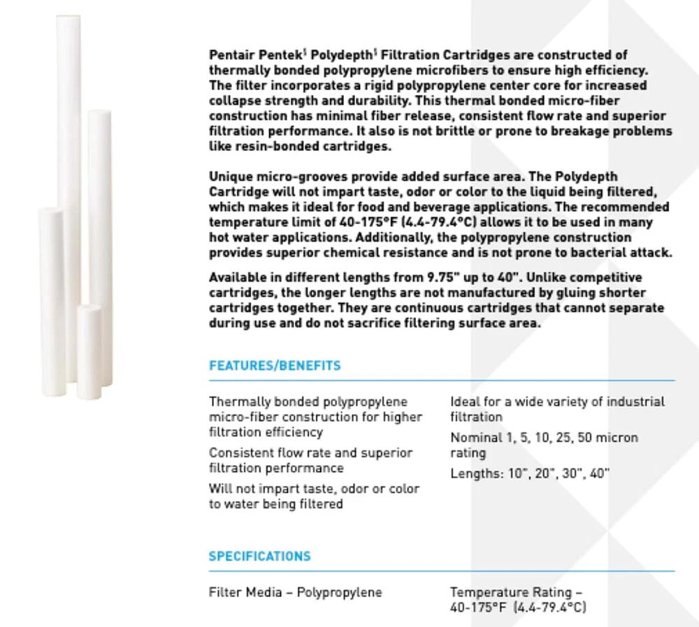 Store New Arrivals Add to Favorite View Feedback Contact Pentair PD-5-934 Sediment Water Filter, 10-Inch, under Sink Polydepth Polypropylene Cartridge, 10" X 2.5", 5 Micron Description Item model number PD-5-934 Style 5 micron External Testing Certification ANSI, NSF Product Dimensions 2.5"D x 2.5"W x 10"H Material Polypropylene (PP) Country of Origin China Product Benefits Removes Dust Department Water Filter Cartridge Is Discontinued By Manufacturer No KEEP YOUR WATER CLEAN and protect your appliances by removing dirt, sand, silt and particles FITS ALL 10" Standard Housing and can replace any 10" x 2.5" sediment filter THERMALLY BONDED POLYPROPYLENE MICRO-FIBER CONSTRUCTION provides high filtration efficiency, consistent flow rate and superior filtration performance WILL NOT IMPART taste, odor or color to liquid being filtered making these cartridges ideal for food and beverage applications NSF INTERNATIONAL tested and certified for your peace of mind Pentair Pentek Polydepth Filtration Cartridges are constructed of thermally bonded polypropylene microfibers to ensure high efficiency. The filter incorporates a rigid polypropylene center core for increased collapse strength and durability. This thermal bonded micro-fiber construction has minimal fiber release, consistent flow rate and superior filtration performance. It also is not brittle or prone to breakage problems like resin-bonded cartridges. Unique micro-grooves provide added surface area. The Polydepth Cartridge will not impart taste, odor or color to the liquid being filtered, which makes it ideal for food and beverage applications. The recommended temperature limit of 40-175°F (4.4-79.4°C) allows it to be used in many hot water applications. Additionally, the polypropylene construction provides superior chemical resistance. ABOUT US We offer the best prices around on high quality products. Our E-store includes media such as books, movies, music and games while offering electronics, toys, sporting apparel, clothing, tools, general home, garden items and more. SHIPPING We are always working hard to ensure your package arrives as soon as possible. Please understand that some factors like weather, high postal traffic, and the performance of shipping companies are outside of our control. We offer free shipping to the lower 48 states and ship within 2 business days of payment, usually sooner. We do not accept P.O. Boxes. Please provide a physical address. For shipping outside of the continental USA, we only use eBay's Global Shipping Program.The item is shipped to KY and then sent to the rest of the world. International customers are responsible for all duties and taxes. Continue to check out in order to calculate costs for shipping the item to your country. Messages regarding eBay's Global Shipping Program MUST be directed at eBay EXCLUSIVELY. RETURNS We offer a 30-Day Return Policy on items which you are not completely satisfied with. You have the option for a full-refund or an exchange of the item. No returns are available on items shipped outside of the USA. PAYMENT We accept PayPal. CONTACT US This page content is yet to come Please ad us to your favorite seller and visit again later Thank You CUSTOMER SATISFACTION We try our very best to make sure every customer is completely satisfied. If there's a problem, message us! We're happy to help. WE ACCEPT Copyright © 2021 AutoDS. | All Rights Reserved