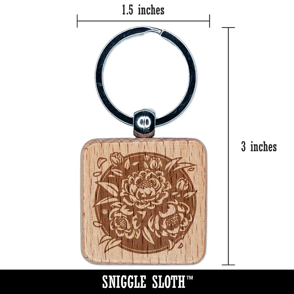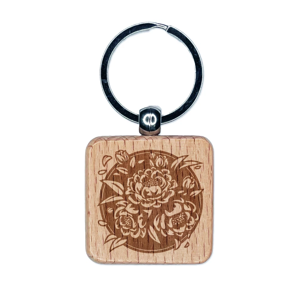 Peony Flowers in Circle Engraved Wood Square Keychain Tag Charm