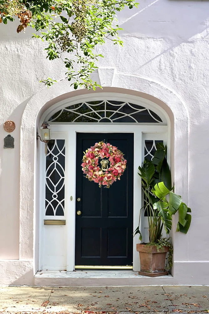 Spec: Material: Silk, fabric and rattan Size: Outside diameter: about 24"+/-0.5" Inner diameter: about 6" Large flower diameter: about 3” Small flower diameter: about 1” Thickness: 8 cm / 3" Package : 1 * Peony Wreaths 【Material】This front door wreath is a fluffy and full of vitality wreath for front door,by many different sizes of pink,little pink,dark pink,red and other colors of peony,hydrangea,eucalyptus leaves and thick grapevine base composition,inner and outer are a lot of flowers embellishment,flowers lush and beautiful,the flowers are all very securely attached,and the grapvine base is also secure and does not shed.The craftmanship very good. 【Beautify】This Large spring wreath for front door makes for an attractive entrance way.These flowers are lush and realistic.The wreath is well made and impressive.This wreath is gorgeous, It truly is chock full of peony flowers which is awesome. 【FullHand】This peony wreath is an exquisite hand-made wreath.The details and quality are our first guarantee.The quality is excellent,the shape is realistic,just like natrue.The wreath will need to be reshaped, and can be easily bent for reshaping - please separate and loosen flowering stems to achieve the desired fullness. 【Occusion】This full season wreath can be used indoors and outdoor, hant it over the fireplace and put it on your front door,wall,window.It also can be used as a candle wreath for table decoration.This wreath creates a pleasant atmosphere all year round.It is also suitable for Venlentine's day,Easter,Mother's day,Christmas day etc. 【EasyUse】The wreath is easy to use for a long time, hang it on your front door.If it is dirty, you can wipe it with a soft wet cloth to make the wreath as bright as new. No maintenance required.No watering is required.Looks plump and fresh every day.