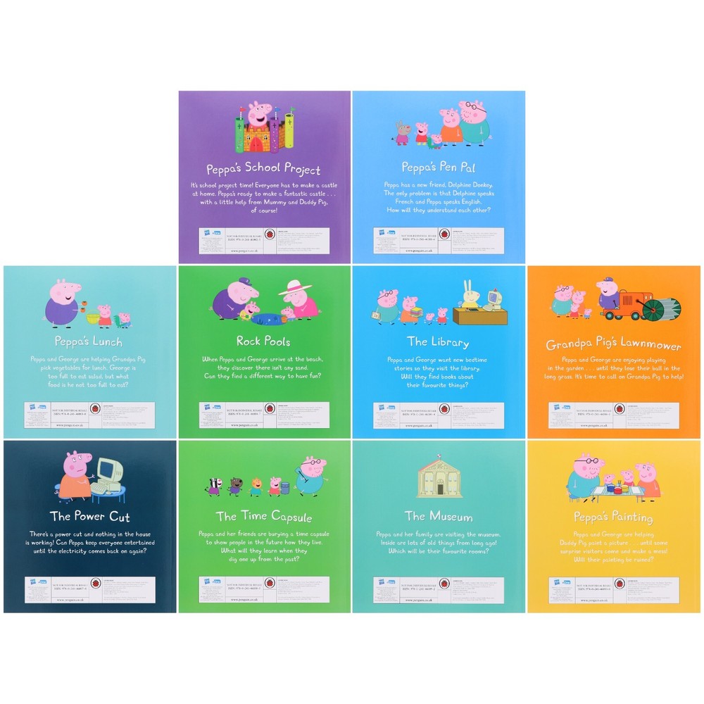 Powered by Frooition Home About Feedback Newsletter Contact Children's Ages (0 - 5) Other Children's Ages (5 - 7) Children's Ages (7 - 9) Children's Ages (9 - 14) Young Adult Fiction Non-Fiction Clearance Sale Welcome to books2door ebay shop We want to encourage a love of reading in all children. That's why we have been offering exceptional books at affordable prices since 2004. We look forward to being a part of your next story. Peppa Pig Collection 10 Books Set in a Purple Bag Set with a Audio - Ages 0-5-PB Item Description Join Peppa Pig, George, and all their friends in this fun-filled 10-book collection, packed in a vibrant purple gift bag! Perfect for Peppa Pig fans, this set features engaging stories that capture Peppa?s exciting adventures at school, home, and beyond. With easy-to-read text and colourful illustrations, it?s ideal for young readers just beginning their reading journey. Titles in this Set: 1. Peppa?s Pen Pal 2. Peppa?s School Project 3. Peppa?s Lunch 4. Rock Pools 5. The Library 6. Grandpa Pigs Lawnmower 7. The Power Cut 8. The Time Capsule 9. The Museum 10. Peppa?s Painting Description Peppa?s Pen Pal Peppa has a new friend, Delphine Donkey. The Only problem is that Delphine speaks French and Peppa speaks English. How will they understand each other? Peppa?s School Project It's School project time! Everyone has to make a castle at home. Peppa's ready to make a fantastic castle..with a little help from Mummy and Daddy Pig, Of course Peppa's Lunch Peppa and George are helping Grandpa Pig pick vegetables for lunch. George is too full to eat salad, but what food is he not too full to eat? Rock Pools When Peppa and George arrive at the beach, they discover there isn't any sand. Can they find a different way to have fun? The Library Peppa and George want new bedtime stories so they visit the library. Will they find books about their favourite things? Grandpa Pig's Lawnmower Peppa and George are enjoying playing in the garden... until they lose their ball in the long grass. It's time to call on Grandpa Pig to help! The Power Cut There's a power cut and nothing in the house is working! Can Peppa keep everyone entertained until the electricity comes back on again? The Time Capsule Peppa and her friends are burying a time capsule to show people in the future how they live. What will they learn when they dig one up from the past? The Museum Peppa and her family are visiting the museum. Inside are lots of old things from long ago! Which will be their favourite rooms? Peppa's Painting Peppa and George are helping Daddy Pig paints a picture... until some surprise visitors come and make a mess! Will their painting be ruined? More Items! View more great items Convertible Train - Fun Storybook By Amy Johnson - Ages 2+ - Board Book £14.99 Convertible Police Car By Belinda Gallagher Fun Storybook - Ages 2+ - Board Book £14.99 Convertible Dinosaur By Claire Philip Fun Storybook - Ages 2+ - Board Book £14.99 Convertible Fire Engine - Fun Storybook By Amy Johnson - Ages 2+ - Board Book £14.99 Shop by category Children's ages 0-5 Children's ages 5-7 Children's ages 7-9 Children's ages 9-14 Young Adult Fiction non-fiction Clearance Sale Other Home About Feedback Newsletter Contact Powered by Frooition Frooition | No-js Template | eBay design, eBay store design, eBay shop design, eBay template design, eBay listing design (ver:froo_no_js) This listing is currently undergoing maintenance, we apologise for any inconvenience caused.