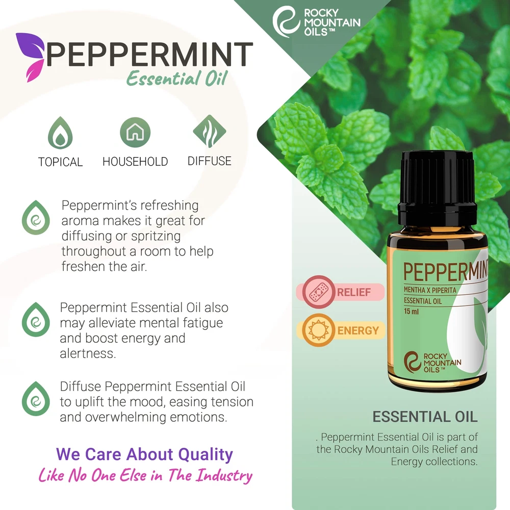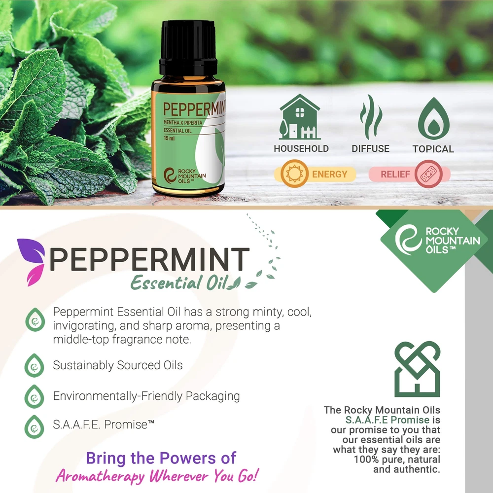 Peppermint Essential Oil (Mentha x piperita) is part of the Lamiaceae family. Peppermint Essential Oil has a strong minty, cool, invigorating, and sharp aroma presenting a middle-top fragrance note. Peppermint Essential Oil is part of the and Energy collections. When properly diluted, Peppermint Essential Oil has an icy-hot effect on the skin, also soothing muscles due to overexertion or overuse. Peppermint's refreshing aroma makes it great for diffusing or spritzing throughout a room to help purify the home. Peppermint Essential Oil also may alleviate fatigue and boost energy and alertness. The oil promotes a fresh perspective, while inspiring creativity and self-confidence. Diffuse Peppermint Essential Oil to uplift the mood, easing tension and overwhelming emotions. essential oils are the highest quality available in the industry. We provide GC/MS test results from a verified independent third-party on all of our essential oils. GC/MS tests verify purity and quality of the oils sold so customers can know we mean it when we say our oils are 100% pure and authentic. Customers can look at the bottom of their bottle to find their individual batch code and then input that number into our site to pull up the GC/MS test results. (RMO) was created by a collection of wellness enthusiasts who were determined to provide essential oils that are pure and safe to use at a cost-effective price. As of the leading direct-to-consumer essential oil companies in the world, RMO formulates expertly crafted blends and the purest single essential oils available. Continuing with innovation, RMO continues to expand its line with new oils and purposely-built products to satisfy the most experienced consumer and to help introduce new consumers to the benefits of essential oils. The company strives to provide products that improve the lives of people worldwide. 100% Pure Peppermint essential oil: Our pure and undiluted Peppermint Essential Oil has a strong minty, cool, invigorating, and sharp aroma, presenting a middle-top fragrance note; Peppermint Essential Oil is part of the and Energy collections Diffuse: Add a few drops of peppermint to any diffusers for essential oils or aromatherapy diffuser and experience its refreshing aroma; Peppermint oil promotes a fresh perspective while inspiring creativity and self-confidence; Diffuse Peppermint Essential Oil to uplift the mood, ease tension, and overwhelming emotions Topical: Peppermint Essential Oil is of the essential oils for skin use with an icy-hot effect, also soothing muscles due to overexertion or overuse; Blend Peppermint oil with your favorite carrier oil to create an excellent massage oil for massage therapy; Massage the diluted oil into the temples to soothe tension headaches Household: Peppermint’s refreshing aroma makes it great for diffusing or spritzing throughout a room to help freshen the air; If you are looking to improve your focus and alertness, diffuse Peppermint Essential Oil in your home or office; You can also get fired up for a workout or exam by inhaling the scent with a few deep breaths Our promise: Through our S.A.A.F.E. Promise, we have created an exceptionally high standard of quality built on a culture of caring that’s unrivaled in the essential oils industry today