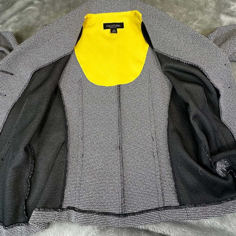 Perceptions Women's Size 10 Black White Long Sleeve Button Front Blazer Jacket Gender: Womens Size: 10 Brand: Perceptions Color: Black and White with Yellow accent Long Sleeves 4 Button Front V-Neck Collared Decorative X's on Front and Back Yellow Accent on Neck and Cuffs 100% Polyester Machine Washable Made in Vietnam Approximate Measurements Not Exact: Underarm to Underarm Approx. - 18” Length Approx. - 24" Pre-Owned in Excellent Condition (EUC) *Colors may vary depending on lighting and individual viewing devices Offers Welcomed Bundle Discounts Available Fast Shipping 5 Star Seller Thank you for shopping my closet! Location 19 - 0007 Professional, Business, WorkWear, Office Wear, Jacket, Blazer, Coat, Lightweight, Sophisticated, Suit, CorpCore, Classic, ClassicCore, Basic, Mature, Sophisticated