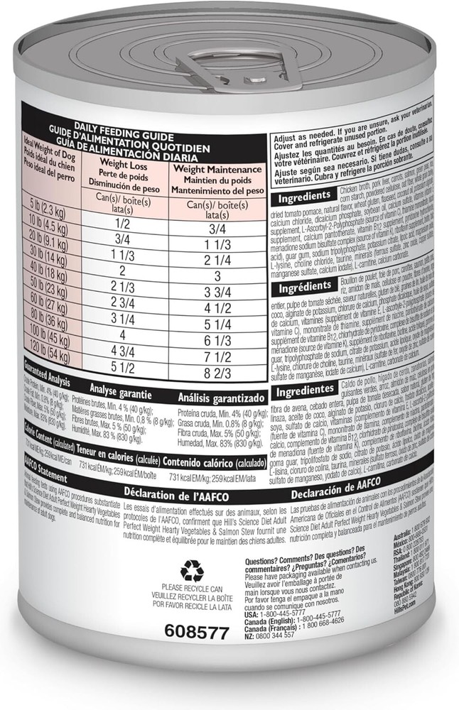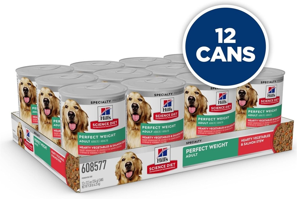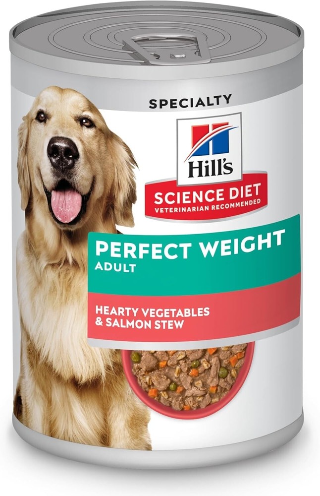 Perfect Weight, Adult 1-6, Weight Management Support, Wet Dog Food, Salmon & Vegetables Stew, oz Can, Case of 12 Safe & effective weight loss with visible results within 10 weeks Healthy weight maintenance & long lasting weight support Lean muscle support Made in the USA with global ingredients you can trust #1 Veterinarian Recommended Helping your grown dog keep a healthy weight doesn't have to be difficult. Adult Perfect Weight Salmon & Vegetable Stew is breakthrough weight management nutrition with clinically proven technology for healthy weight maintenance and long-lasting weight support in your adult dog. Over 70% of dogs lost weight within 10 weeks when fed this dog food made with natural ingredients. This premium canine recipe is also a great source of high-quality protein to support lean muscle in your dog.