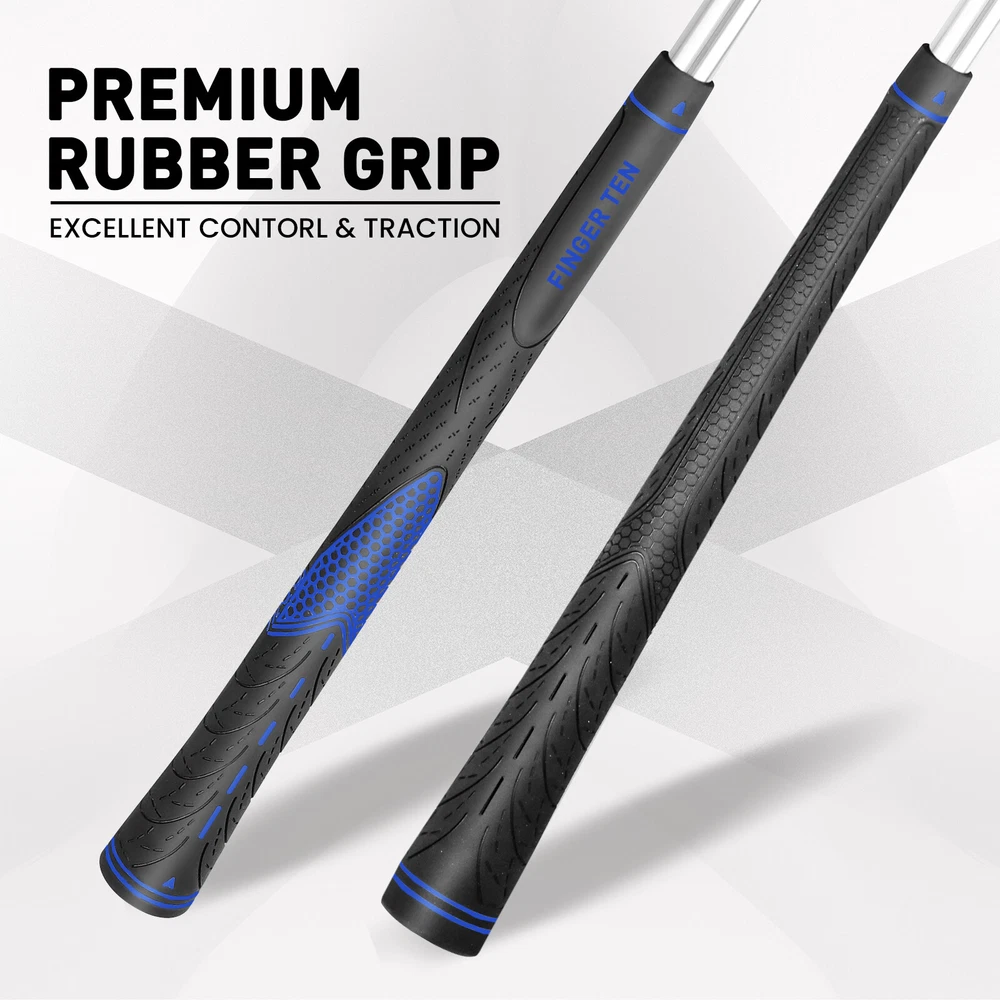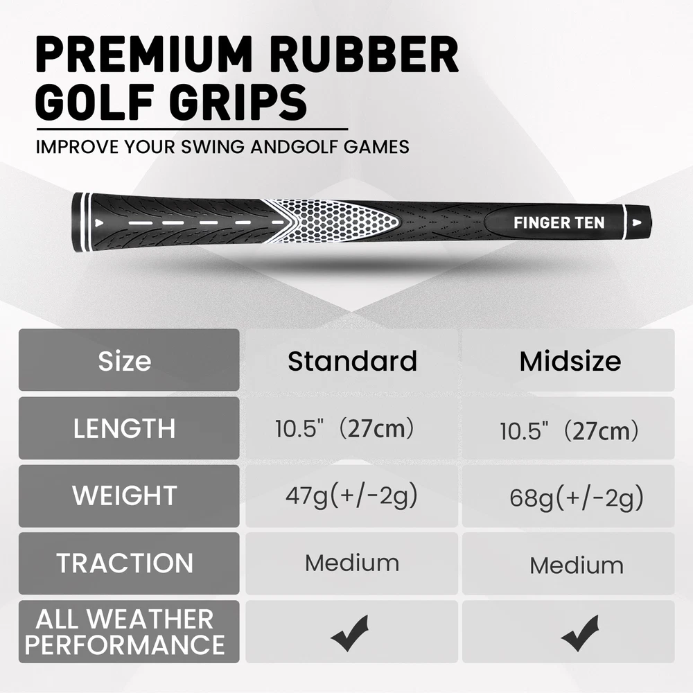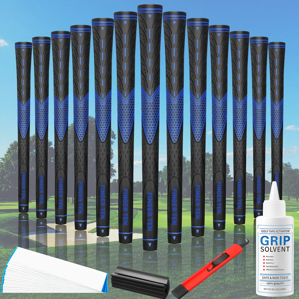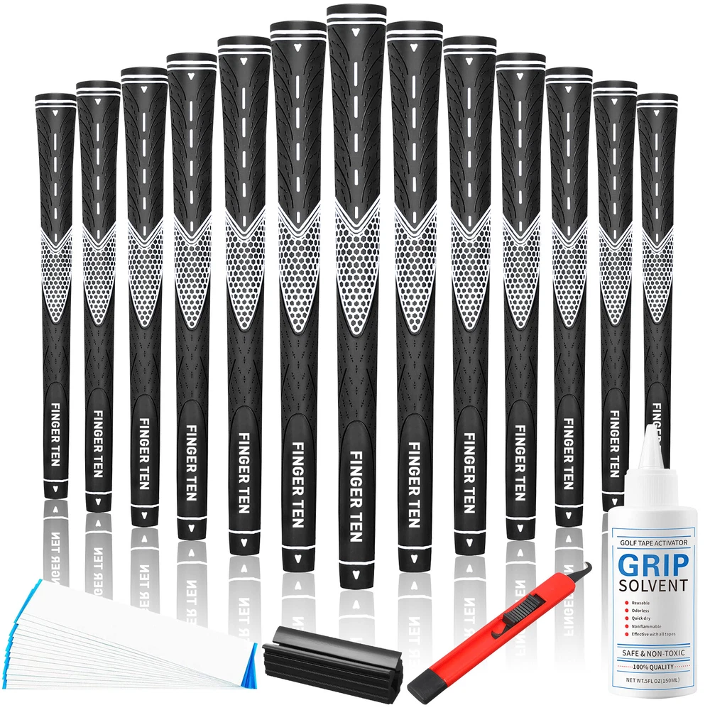 Package Includes : 13 * golf grips , 15* golf tapes ,1 * grip tape spray solution,1*rubber vise clamp,1* grip blade. Proprietary Rubber Material : Exclusive high-feedback rubber material used to providing precise ball feedback and comfortable feel all time. Texture Control : 3 kinds of micro texture used to improve traction & control and provide comfortable feel in any conditions. Taper Profile : Traditional taper profile encourages lighter grip pressure, promoting less tension in the hands and creating more fluidity and power throughout the swing. On Jan 11, 2025 at 21:06:31 PST, seller added the following information: