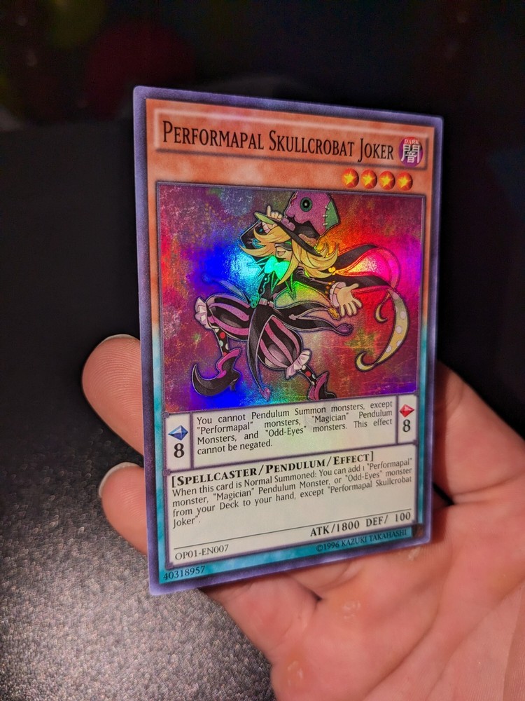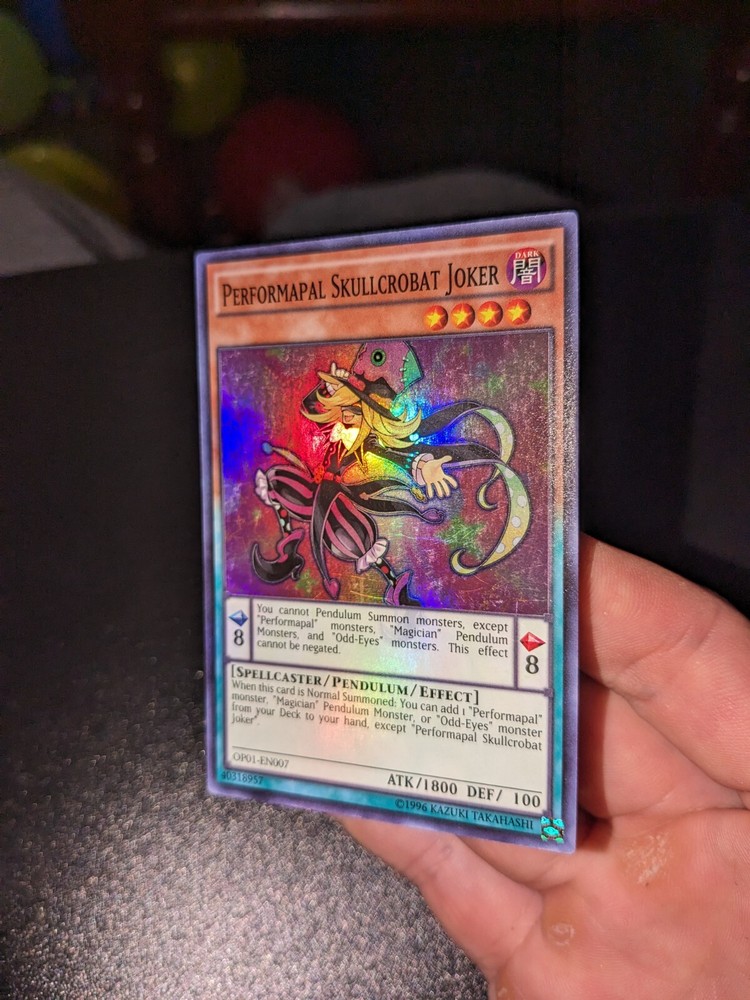 Card Number:PEVO-EN022Defense/Toughness:100Attribute/MTG:Color:DarkLanguage:EnglishAdditional Description:Performapal Skullcrobat JokerCard Name:Performapal Skullcrobat JokerSet:Pendulum EvolutionLevel:4Manufacturer:Konamibrand:KonamiAttack/Power:1800Game:Yu-Gi-Oh! TCGFeatures:1st EditionCard Text:Pendulum Effect : You cannot Pendulum Summon monsters, except "Performapal" monsters, "Magician" Pendulum Monsters, and "Odd-Eyes" monsters. This effect cannot be negated.