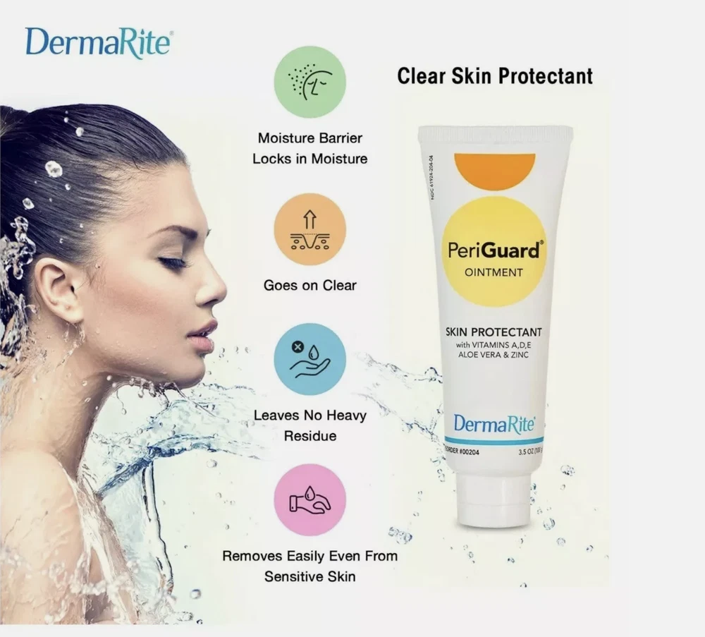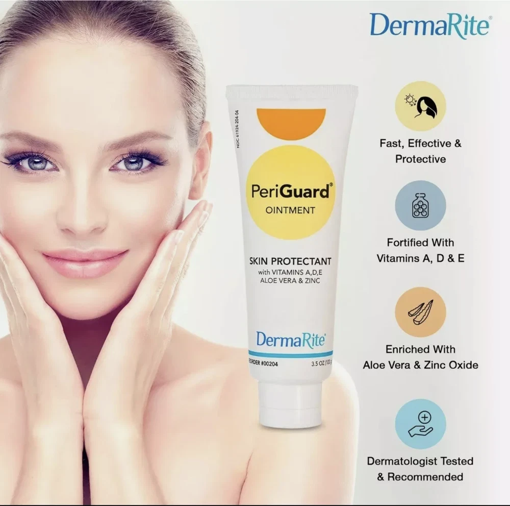 Choose the quantity that fits you! Free and We are shipping the same day you order! About this item; DermaRite's PeriGuard Ointment Skin Protectant is a versatile skincare solution enriched with Vitamins A, D, and E, as well as soothing Aloe Vera and zinc. This petrolatum-based barrier ointment is designed to provide superior protection while maintaining skin hydration. The clear, lightweight formula ensures no heavy residue, making it easy to apply and remove even from sensitive skin. PeriGuard is ideal for addressing skin irritations associated with incontinence, diaper rash, eczema as well as for general skincare needs. Its rich blend of nutrients helps to keep the skin soft, supple, and well-nourished. The inclusion of zinc oxide offers additional benefits, promoting a healthy skin barrier. Whether you are looking to alleviate dry skin, protect against daily irritants, or integrate it into a comprehensive skincare routine, PeriGuard delivers gentle yet effective care. Not made with natural rubber latex. Trust DermaRite, a leading provider of premium wound care products, for superior performance and optimal wound healing. Enriched with Vitamins A, D, and E: Promotes healthy skin hydration and nourishment Clear, Lightweight Formula: No heavy residue, easy application and removal Zinc Oxide Barrier: Provides effective protection while promoting a healthy skin barrier Soothes Sensitive Skin: Ideal for skin irritations related to incontinence and other conditions Multipurpose Use: Suitable for dry skin care and part of a comprehensive skincare routine. Made without natural rubber latex