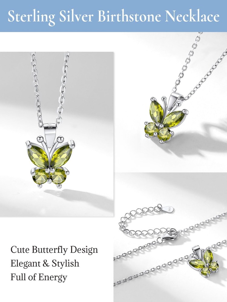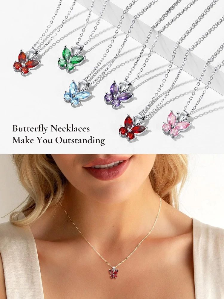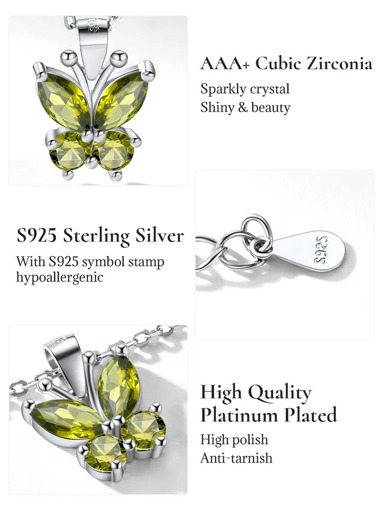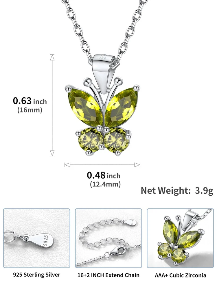 Gorgeous butterfly jewelry for women Metal: 925 Sterling Silver (Real) Material : AAA+ Cubic Zirconia 12 Color Choice: Blue/Pink/Red/Purple/Deep Purple/White/Yellow/Olive Green/Ruby/Sapphire Blue/Light Blue Butterfly. Women 925 Sterling Silver Butterflies Birthstone Pendant Necklace/Earrings/Rings Wedding Gift Jewelry style you can choose: ear cuffs for non pierced ears, surgical stud earrings, stackable rings, pendant necklace. Stamp: S925 The butterfly jewelry design features the love of flying with each other, and staying with your partner for a lifetime. Wearing a butterfly jewelry set expresses the yearning for freedom and also entrusts the hope for the future. Perfect Gift: gift for your LOVER, family or friends on days like birthday, anniversary, Party, Valentine's day, Thanksgiving Day, graduation. Hypoallergenic, lead free, nickel free and hypoallergenic, the stone is lasting and sparkling. Butterfly Necklace is made of Real 925 Sterling Silver and cubic zirconia stone, it's strong and durable,doesn't turn your neck green at all.If you want to have a necklace suitable for matching,this necklace is your ideal choice. Design concept : cute butterfly flying, birthstone made butterfly body, gorgeous shiny and lovely vivid look, butterfly is a symbol of joy and happiness, send this necklace to loved ones on her birthstone, it will bring her luck and she will feel your care from heart. Necklace size : pendant 0.63 Inch height and 0.48 inch wide ; dainty rolo chain length 16" with 2 inches extender ; whole necklace weight 3.9 grams. Simple necklace is simple in design and has its own unique charm.It is suitable for birthdays, vacations, beach parties, festivals and other occasions.It is the dainty accessory that adds atmosphere to daily life. Necklace comes with a gift box and a black velvet bag.