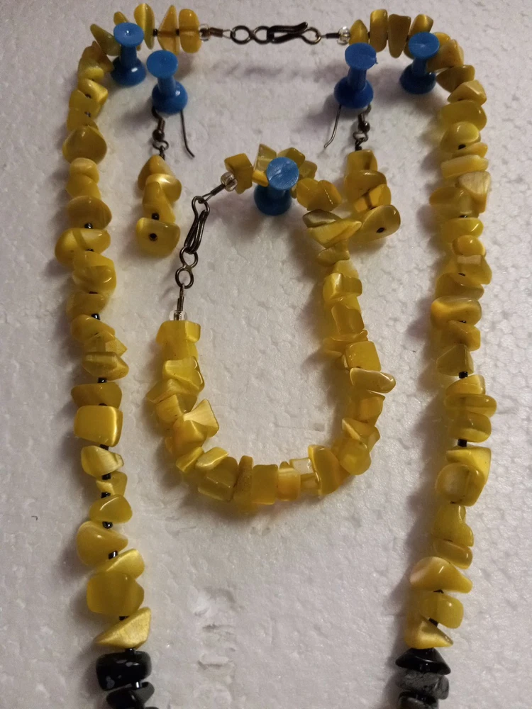 This Peridot Gemstone Bear Necklace Set features a charming design with polar bear-shaped main stones in a vibrant yellow color. The set includes earrings, a necklace, and a bracelet, all adorned with peridot gemstones. The main stone color and shape, as well as the overall theme of the set, create a unique and eye-catching jewelry ensemble perfect for adding a touch of whimsy to any outfit. Neaklace 17 inches Bracelet 6 inches Earrings 1.5 inches
