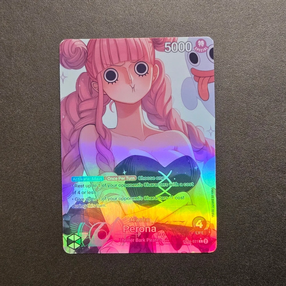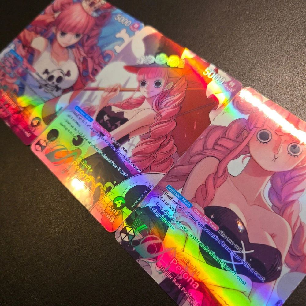 Holographic Foil Perona Leader Card One Piece Card Game Proxies Set: OP06-021 Variant: X Card size: Standard (2.5 x 3.5 inches) Materials: Glossy Vinyl, One Piece Playing Card --------------------------------------------------------------------------- Are you a cultured and distinguished gentleman that enjoys waifus? If so, then you are in the right place! Each card is handmade, and made to order. I have experimented and choose the best materials to replicate the quality of the original card. Each card is laminated with protective vinyl (waterproof), and applied on an official One Piece Card Game leader card. I inspected every card before shipping to ensure each card is up to standard. I love each card I create and I hope you do too 💖. View my store for see all the proxies! Please contact me for any questions or concerns. Thank you! --------------------------------------------------------------------------- This is a fan-made custom card that is a parody of the actual card game. AI and Photoshop was used in the help of this art.