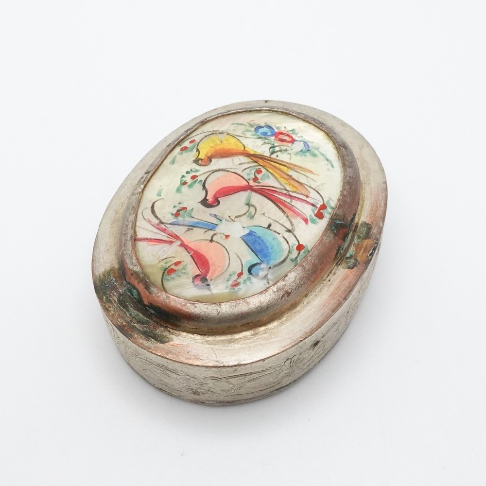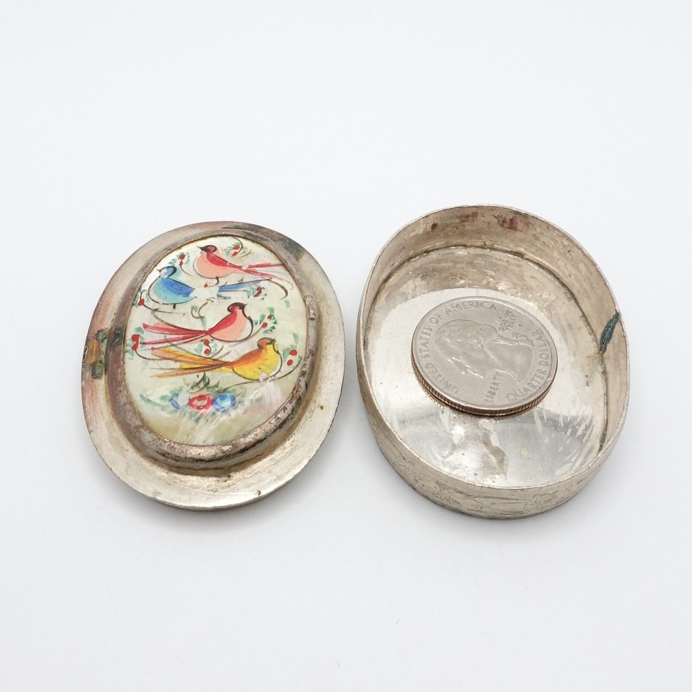 Welcome to my e B a y Store Vintage Persian Hand Painted Mother of Pearl Oval Trinket Pill Box Length - 2.25" Height - 0.70" Width - 1.5" Total Weight - 52.3 Grams Bid With Confidence Feel Free to ask any questions before bidding please If you would like additional pictures please send me a message Check out my other listings for more great deals! 100% Authentic or your Money Back Guarantee!! Free Shipping on All Items!