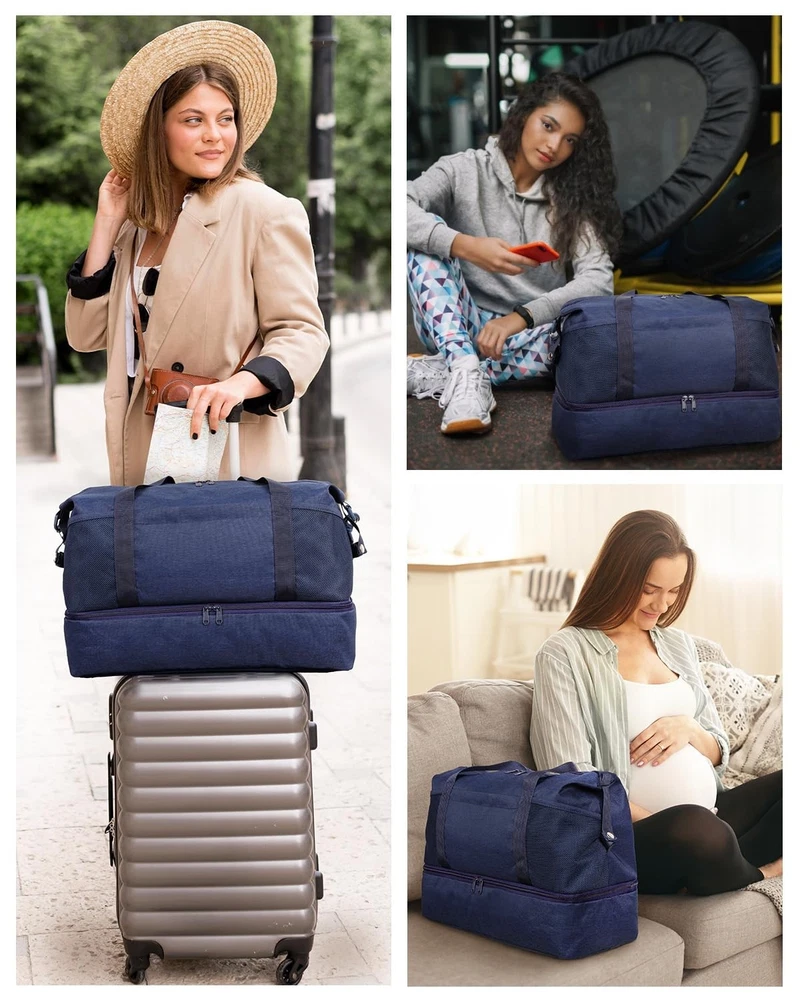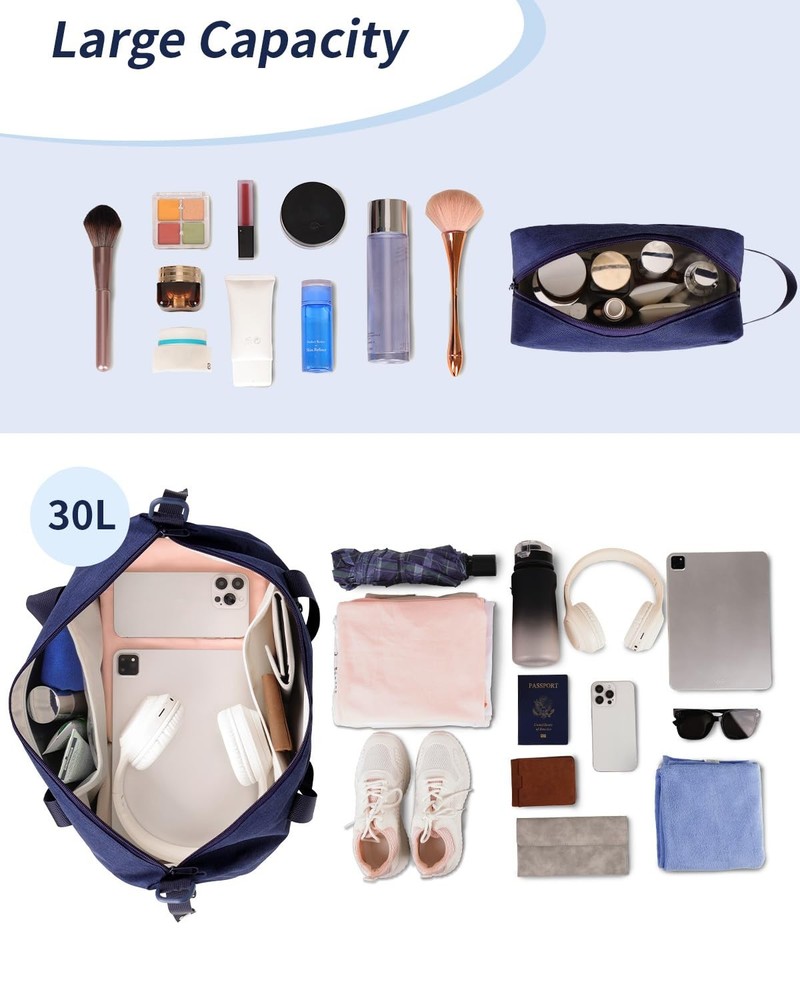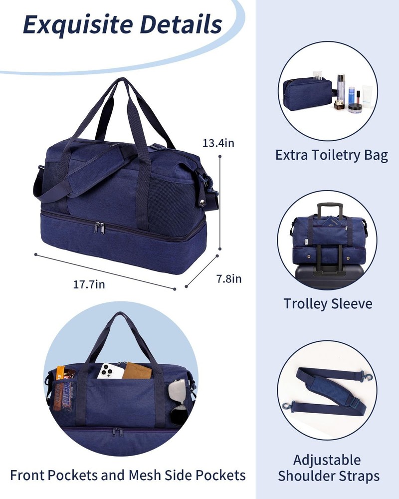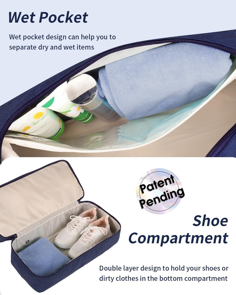 Personal Item Bag 18x14x8 Travel Duffel Bag with Shoe Compartment & Wet Pocke Underseat Carry on Weekender Overnight Bag with Toiletry Bag Gym Bag for Women Men 【Save Your Carry On Charges】The personal item bag measures 17.7x13.4x7.8 inches, fitting within the 18x14x8-inch personal item size limits of Airlines, you can put it under your seat or the overhead compartment without paying carry-on luggage fees 【Wet Pocket and Shoe Compartment】This travel duffel bag has a wet and dry separation design . There is a waterproof PVC lined pocket to separate dry and wet items, making it ideal for holding towel and toiletries. The personal item bag has a double-layer design. The shoe compartment on the lower layer with breathable vents, accommodating your shoes or dirty clothes for easy separation from clean clothes when traveling 【Travel Friendly】Our personal item bag has 30L capacity, it not only has 2 large compartments, but also 6 pockets to hold your 3-5 days travel essentials, it is a perfect companion for airplane travel. The trolley sleeve on the back fits rolling suitcases of various sizes. Equipped with adjustable and detachable shoulder strap and shoulder pad, it provides you with multiple carrying options 【Extra Toiletry Bag】This travel duffle bag comes with a matching toiletry bag that can hold your essentials like shampoo, toothbrush, makeup and more. It has a zipper closure for easy access. It is lightweight and portable, ideal for travel or daily use 【Multipurpose Duffel Bag】: This duffel bag fits all your essentials and is perfect for travel, weekends, yoga, gym, beach, business trips, and sports. Use it as a carry-on bag, overnight bag, gym bag, weekender bag or hospital bag (Patent Pending)