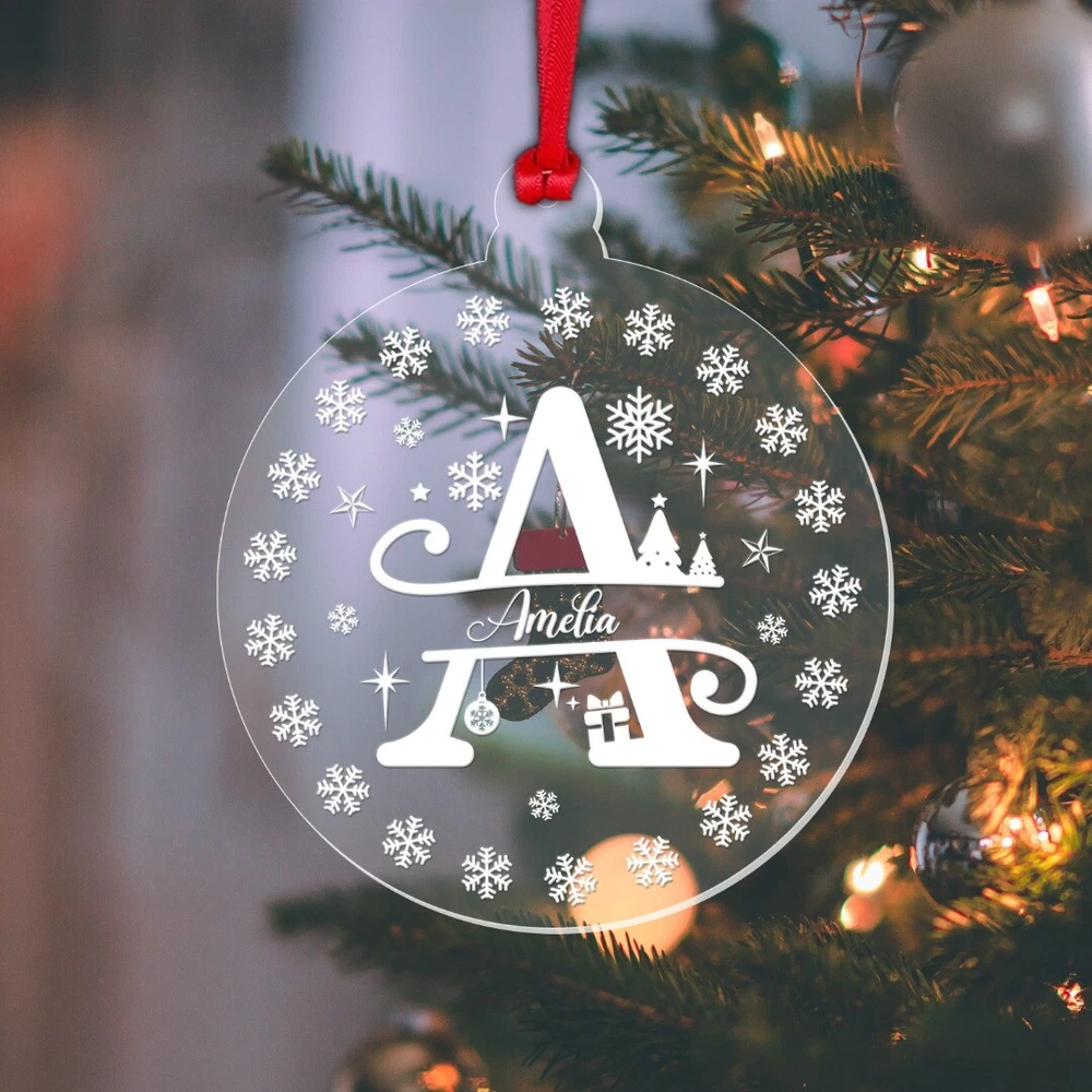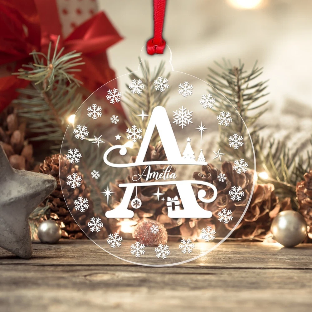 Decorate your Christmas Tree or Home with this Beautiful Personalised Clear Acrylic Christmas Bauble! Ideal as a Christmas Gift and will become a Treasured Keepsake! Personalise with any name! Bauble Size: 8cm wide x 9.3cm height Thickness: 3mm Acrylic Please note: This is a flat bauble shaped acrylic hanging decoration (not a sphere) Please note: The design on the bauble will vary depending on the Monogram Letter required – please see the image showing all the letters to get an idea of how the letter required will look Comes complete with Double Sided Red Satin Hanging Ribbon as standard, and supplied in a Beautiful Organza Gift Bag Made from Clear Laser Cut Acrylic. The design is Laser Engraved into the acrylic to give a white/frosted appearance to the engraving. Personalisation: Please enter your required text into the Personalisation Box or in the "Notes to Seller" Box during checkout. Please enter your text exactly as you would like it to appear. All text will be centrally aligned and text will be formatted as entered. If you require any upper case letters, please enter it this way when ordering. Text will be sized to best fill the space. The more characters/letters you enter, the smaller the font will become. Be sure to double check names, spellings, punctuation and capitalisation before sending your text as these cannot be changed once the manufacturing begins. Designed and Manufactured in the UK. Thank you for supporting our small business.