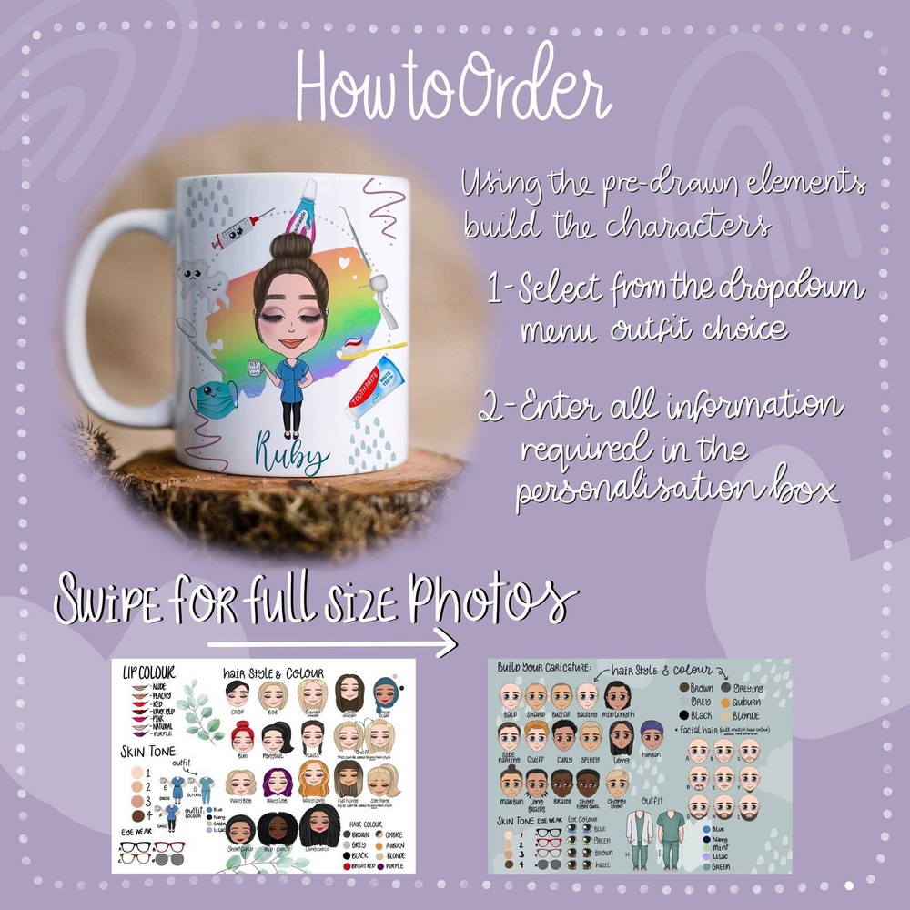 Personalised Caricature Dentist Mug Personalised Dental Nurse Mug Newly Qualified Dentist Mug Product Details.. This high quality 11oz. ceramic white mug has a premium hard coat that provides crisp and vibrant color reproduction sure to last for years. Perfect for all hot & cold beverages. The highest quality printing possible is used. It will never fade no matter how many times you wash it. Material: 100% Ceramic. Print both sides. Dishwasher and Microwave Safe. High Gloss + Premium White Finish. Printed in the U.S.A. Personalized & Custom. We support personalized and custom mug to add custom, when placing an order, you can add notes to the "order note" in shipping address section. Also you can contact us directly via message. Shipping Info. Ready to ship in 1 to 2 business days, All products are made-to-order and proudly printed in the United States. Shipped by USPS and DHL, You will receive your order in 5-7 days. Replace & Refund. All products are defective during shipping broken, chipped will be replaced free of charge. You are not satisfied with the product, we will refund 100% money to you. If any other issues arise, please do not hesitate to message, we would be more than happy to assist you.