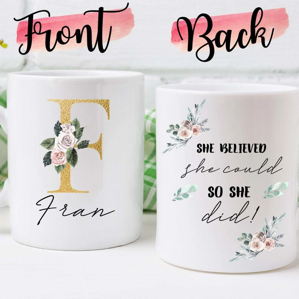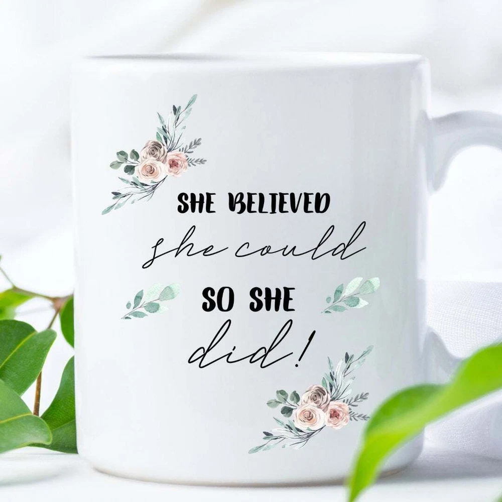 Personalised Monogrammed Mug She Believed She Could House Warming Gift Grad Gift Product Details.. This high quality 11oz. ceramic white mug has a premium hard coat that provides crisp and vibrant color reproduction sure to last for years. Perfect for all hot & cold beverages. The highest quality printing possible is used. It will never fade no matter how many times you wash it. Material: 100% Ceramic. Print both sides. Dishwasher and Microwave Safe. High Gloss + Premium White Finish. Printed in the U.S.A. Personalized & Custom. We support personalized and custom mug to add custom, when placing an order, you can add notes to the "order note" in shipping address section. Also you can contact us directly via message. Shipping Info. Ready to ship in 1 to 2 business days, All products are made-to-order and proudly printed in the United States. Shipped by USPS and DHL, You will receive your order in 5-7 days. Replace & Refund. All products are defective during shipping broken, chipped will be replaced free of charge. You are not satisfied with the product, we will refund 100% money to you. If any other issues arise, please do not hesitate to message, we would be more than happy to assist you.