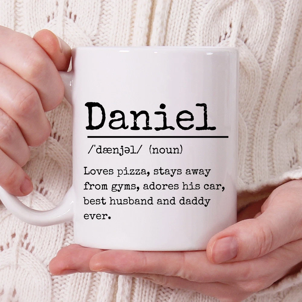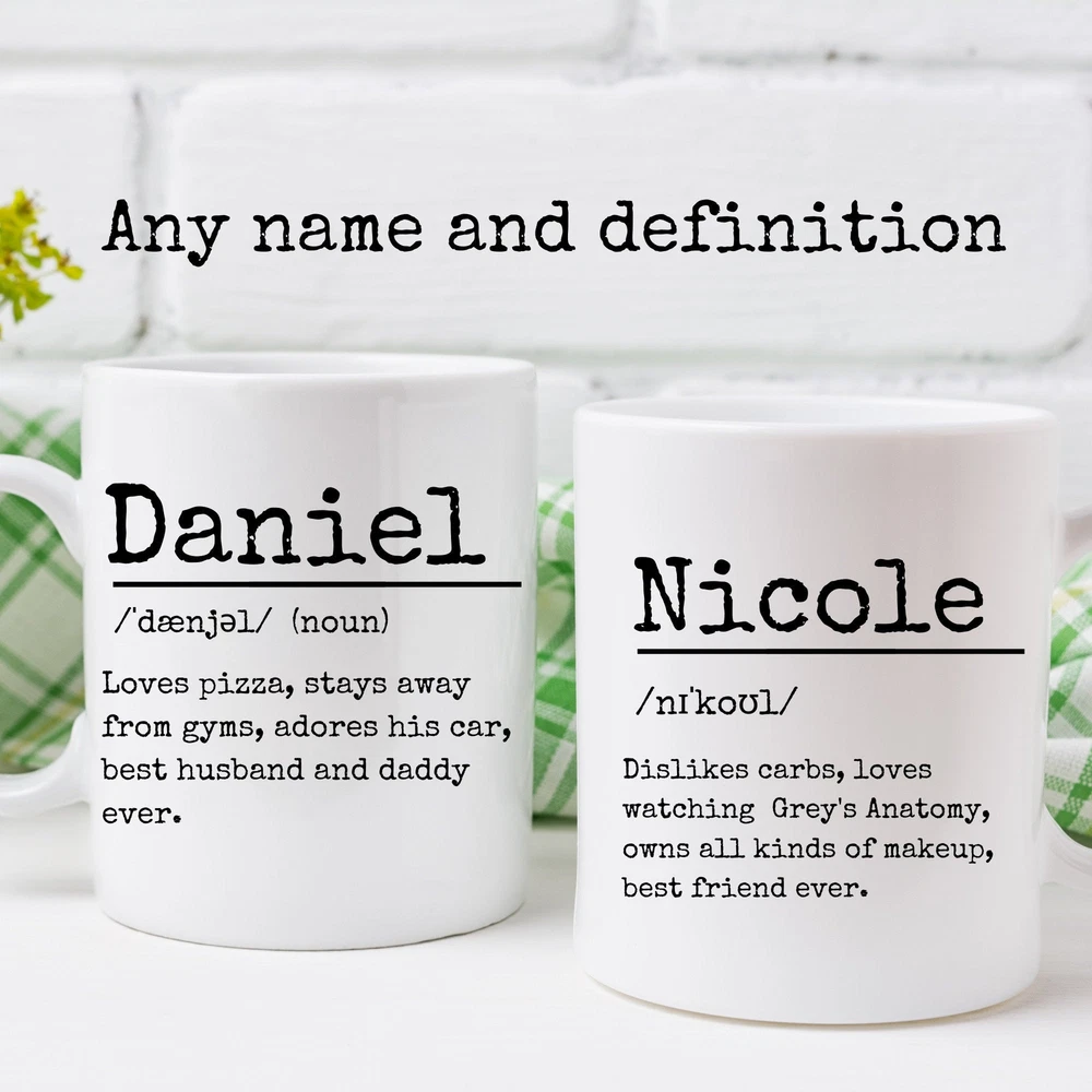 Personalised Mug Name Definition Double Sided Funny Gift For Dad Or Mum Gift For Product Details.. This high quality 11oz. ceramic white mug has a premium hard coat that provides crisp and vibrant color reproduction sure to last for years. Perfect for all hot & cold beverages. The highest quality printing possible is used. It will never fade no matter how many times you wash it. Material: 100% Ceramic. Print both sides. Dishwasher and Microwave Safe. High Gloss + Premium White Finish. Printed in the U.S.A. Personalized & Custom. We support personalized and custom mug to add custom, when placing an order, you can add notes to the "order note" in shipping address section. Also you can contact us directly via message. Shipping Info. Ready to ship in 1 to 2 business days, All products are made-to-order and proudly printed in the United States. Shipped by USPS and DHL, You will receive your order in 5-7 days. Replace & Refund. All products are defective during shipping broken, chipped will be replaced free of charge. You are not satisfied with the product, we will refund 100% money to you. If any other issues arise, please do not hesitate to message, we would be more than happy to assist you.