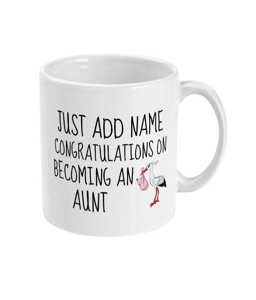 Personalised New Aunt Gift New Aunt Mug Become An Aunt Personalized Aunt To Be Product Details.. This high quality 11oz. ceramic white mug has a premium hard coat that provides crisp and vibrant color reproduction sure to last for years. Perfect for all hot & cold beverages. The highest quality printing possible is used. It will never fade no matter how many times you wash it. Material: 100% Ceramic. Print both sides. Dishwasher and Microwave Safe. High Gloss + Premium White Finish. Printed in the U.S.A. Personalized & Custom. We support personalized and custom mug to add custom, when placing an order, you can add notes to the "order note" in shipping address section. Also you can contact us directly via message. Shipping Info. Ready to ship in 1 to 2 business days, All products are made-to-order and proudly printed in the United States. Shipped by USPS and DHL, You will receive your order in 5-7 days. Replace & Refund. All products are defective during shipping broken, chipped will be replaced free of charge. You are not satisfied with the product, we will refund 100% money to you. If any other issues arise, please do not hesitate to message, we would be more than happy to assist you.
