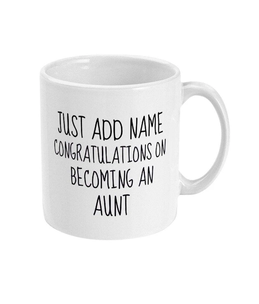 Personalised New Aunt Gift New Aunt Mug Become An Aunt Personalized Aunt To Be Product Details.. This high quality 11oz. ceramic white mug has a premium hard coat that provides crisp and vibrant color reproduction sure to last for years. Perfect for all hot & cold beverages. The highest quality printing possible is used. It will never fade no matter how many times you wash it. Material: 100% Ceramic. Print both sides. Dishwasher and Microwave Safe. High Gloss + Premium White Finish. Printed in the U.S.A. Personalized & Custom. We support personalized and custom mug to add custom, when placing an order, you can add notes to the "order note" in shipping address section. Also you can contact us directly via message. Shipping Info. Ready to ship in 1 to 2 business days, All products are made-to-order and proudly printed in the United States. Shipped by USPS and DHL, You will receive your order in 5-7 days. Replace & Refund. All products are defective during shipping broken, chipped will be replaced free of charge. You are not satisfied with the product, we will refund 100% money to you. If any other issues arise, please do not hesitate to message, we would be more than happy to assist you.