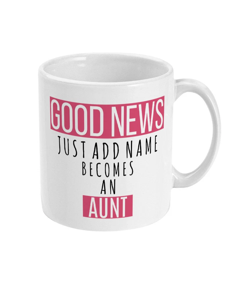 Personalised New Aunt Gift New Aunt Mug Become An Aunt Personalized Aunt To Be Product Details.. This high quality 11oz. ceramic white mug has a premium hard coat that provides crisp and vibrant color reproduction sure to last for years. Perfect for all hot & cold beverages. The highest quality printing possible is used. It will never fade no matter how many times you wash it. Material: 100% Ceramic. Print both sides. Dishwasher and Microwave Safe. High Gloss + Premium White Finish. Printed in the U.S.A. Personalized & Custom. We support personalized and custom mug to add custom, when placing an order, you can add notes to the "order note" in shipping address section. Also you can contact us directly via message. Shipping Info. Ready to ship in 1 to 2 business days, All products are made-to-order and proudly printed in the United States. Shipped by USPS and DHL, You will receive your order in 5-7 days. Replace & Refund. All products are defective during shipping broken, chipped will be replaced free of charge. You are not satisfied with the product, we will refund 100% money to you. If any other issues arise, please do not hesitate to message, we would be more than happy to assist you.