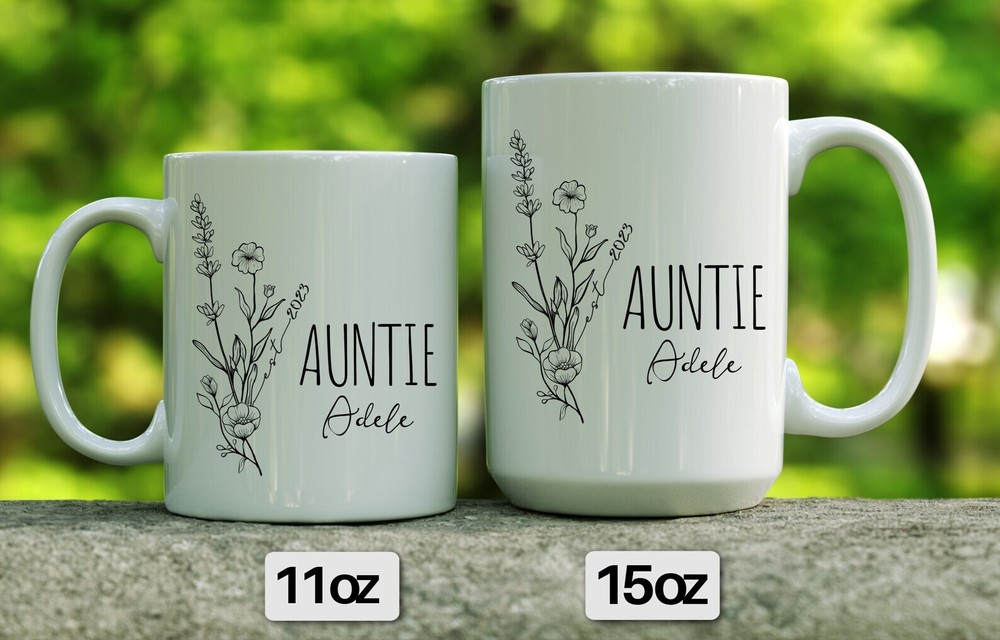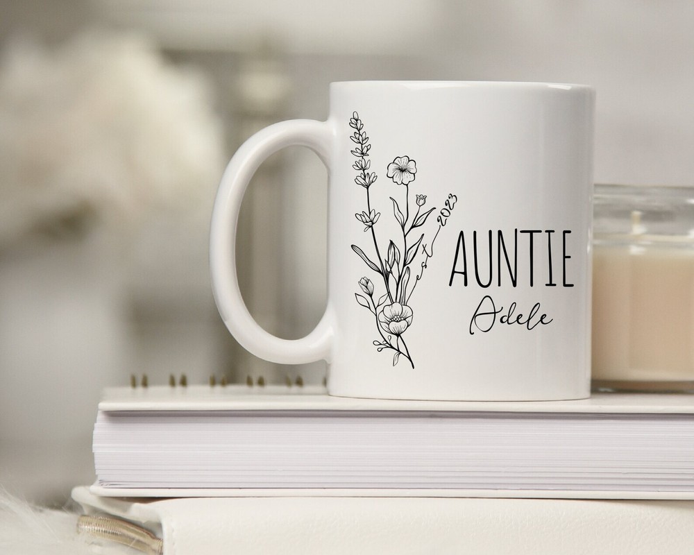 Aunt Mug Personalized Pregnancy Reveal To Sister Auntie Est. 2024 Promoted To Auntie Surprise Baby Announcement For Bestie New Aunt Gift Product Details.. This high quality 11oz. ceramic white mug has a premium hard coat that provides crisp and vibrant color reproduction sure to last for years. Perfect for all hot & cold beverages. The highest quality printing possible is used. It will never fade no matter how many times you wash it. Material: 100% Ceramic. Print both sides. Dishwasher and Microwave Safe. High Gloss + Premium White Finish. Printed in the U.S.A. Personalized & Custom. We support personalized and custom mug to add custom, when placing an order, you can add notes to the "order note" in shipping address section. Also you can contact us directly via message. Shipping Info. Ready to ship in 1 to 2 business days, All products are made-to-order and proudly printed in the United States. Shipped by USPS and DHL, You will receive your order in 5-7 days. Replace & Refund. All products are defective during shipping broken, chipped will be replaced free of charge. You are not satisfied with the product, we will refund 100% money to you. If any other issues arise, please do not hesitate to message, we would be more than happy to assist you.