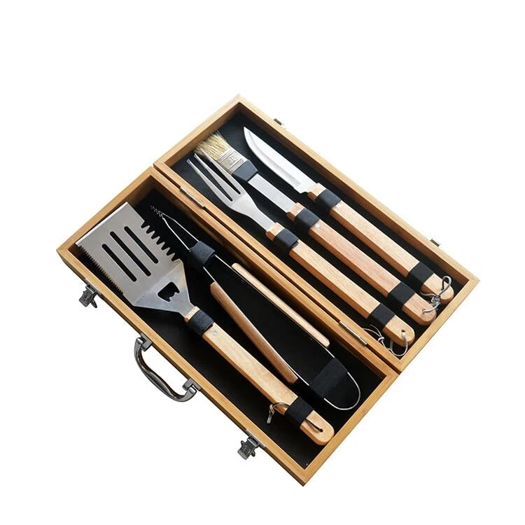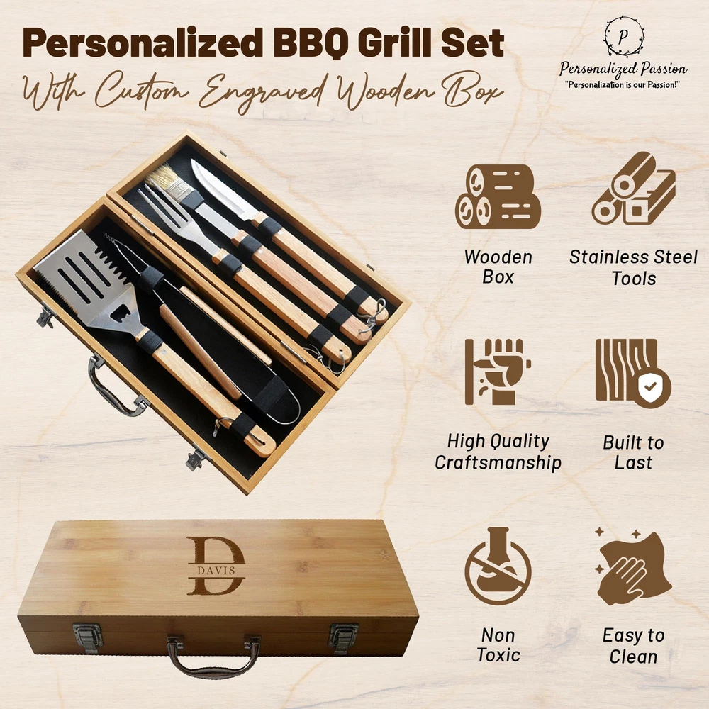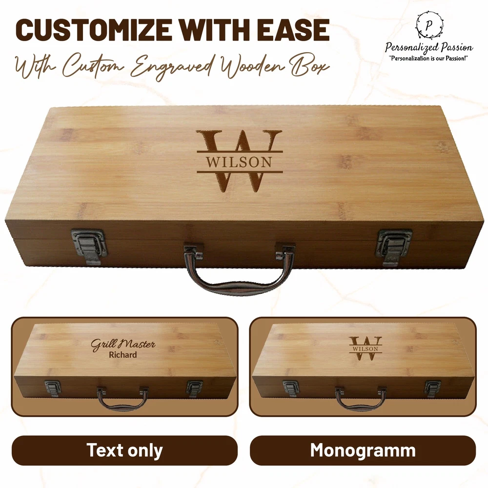 Personalized BBQ Grill Set with Wooden Box - Custom Engraved BBQ Grill Access...