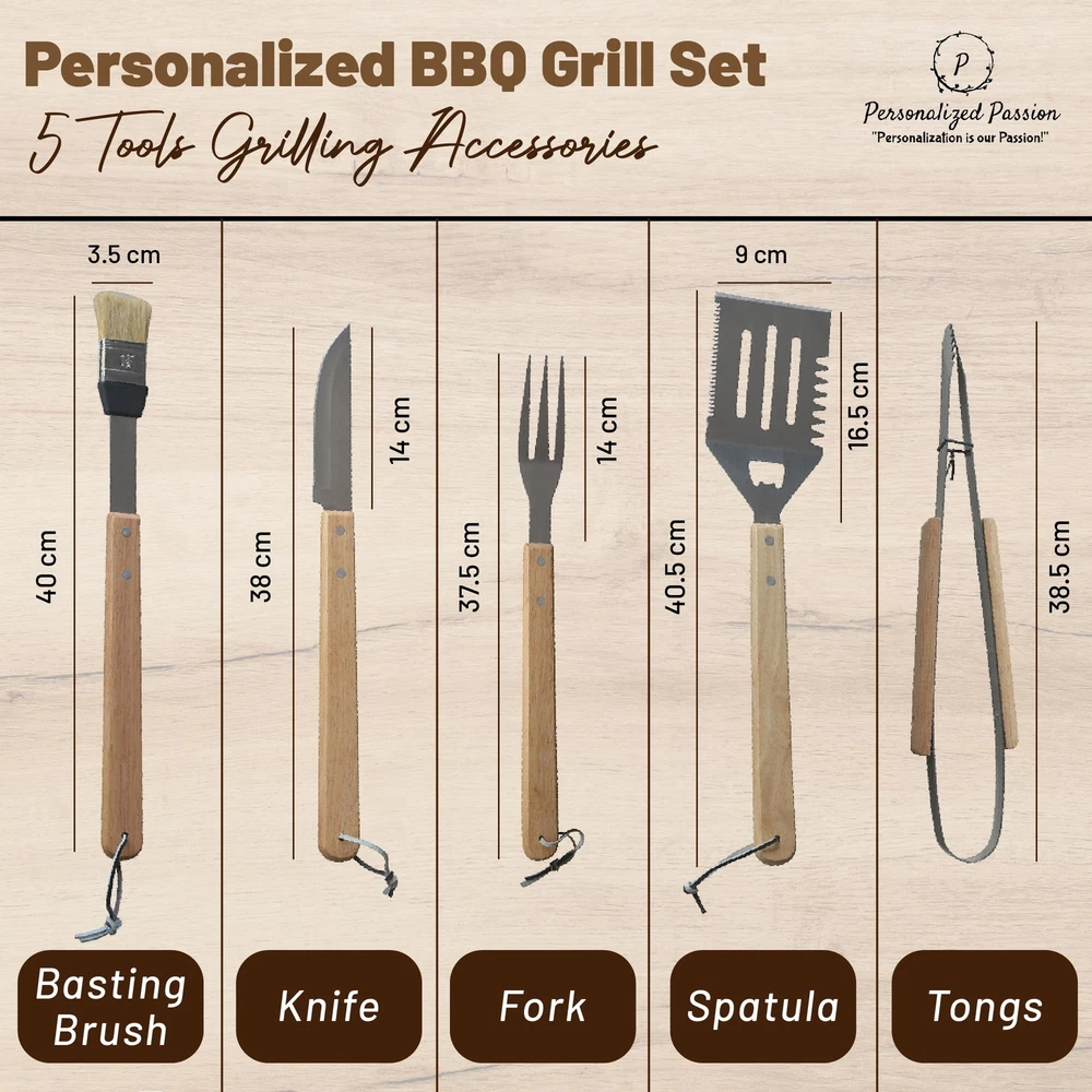 Personalized Grill Set with Wooden Box Seeking Effortless Elegance in Grilling? Tired of ordinary grilling tools? Get ready to dive into the world of grilling perfection with our personalized BBQ grill set. This set isn't just about grilling; it's a statement of individuality. With your name or initials elegantly engraved on the wooden case, this set becomes an extension of your identity, turning every barbecue session into a personal culinary journey. It includes everything you need to get started grilling like a pro. The perfect gift for any grill lover in your life, it will make them the envy of everyone at the next cookout. User-friendly, Safe Design Grilling should be a joy, not a hassle. Our grill utensils set is designed with your comfort and safety in mind. From the ergonomic handles that ensure a secure grip to the precision engineering that guarantees smooth operation, each tool is a testament to user-centric design. Experience the confidence of well-made tools that enhance your grilling prowess! Easy to Clean, Dishwasher Safe After the sizzle comes the cleanup but don’t worry; our grill set's elegance extends beyond the grill. With barbecue tools, crafted from high-quality stainless steel, cleaning becomes a breeze. Simply toss them in the dishwasher without worry. Package Includes Our set of BBQ accessories includes everything you would need for a barbeque session like a spatula, tongs, knife and a basting brush. All of the tools are made out of durable stainless steel and high-quality wood that is meant to last for a long time. Even the bristles on the brush are made from fine-quality plastic. ✅ Unique laser engraved grilling tools set for any BBQ lover ✅ Comes with an easy-to-organize box to carry on the go ✅ Customize the Wooden case with name or any other text ✅ Perfect for gifting or indulging in your own grilling experience ELEVATE YOUR GRILLING EXPERIENCE – Whether you're grilling up steak, chicken, or veggies, our personalized barbeque grill accessories set has everything you need to make tasty meals while adding a touch of class to your outdoor cooking. CUSTOMIZE WITH EASE – Make this grill kit uniquely yours by personalizing the wooden box. Simply click on "Customize now", provide the text you want to add and we will get it done for you. A COMPLETE GRILLING SET – Our thoughtfully curated BBQ set includes a grill spatula, grill tongs, fork, knife and a basting brush in a rustic wooden case. Each tool is a masterpiece, designed to make your grilling experience flawless. CRAFTED FOR EXCELLENCE – Made from high-quality stainless steel and wood, our BBQ accessories guarantee robustness and longevity. No need to worry about rust or cracks, each tool is built to withstand the test of time. A UNIQUE GIFT FOR ANY BBQ LOVER – Whether it's for your dad, husband, uncle, or anyone who loves grilling, our personalized grill tool set makes an exceptional gift. With its custom engraving and user-friendly design, it's a must-have for any BBQ lover.