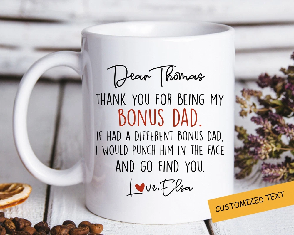 Personalized Bous Dad Mug Best Gift For Bonus Dad Fathers Day Gift Birthday Mug Product Details.. This high quality 11oz. ceramic white mug has a premium hard coat that provides crisp and vibrant color reproduction sure to last for years. Perfect for all hot & cold beverages. The highest quality printing possible is used. It will never fade no matter how many times you wash it. Material: 100% Ceramic. Print both sides. Dishwasher and Microwave Safe. High Gloss + Premium White Finish. Printed in the U.S.A. Personalized & Custom. We support personalized and custom mug to add custom, when placing an order, you can add notes to the "order note" in shipping address section. Also you can contact us directly via message. Shipping Info. Ready to ship in 1 to 2 business days, All products are made-to-order and proudly printed in the United States. Shipped by USPS and DHL, You will receive your order in 5-7 days. Replace & Refund. All products are defective during shipping broken, chipped will be replaced free of charge. You are not satisfied with the product, we will refund 100% money to you. If any other issues arise, please do not hesitate to message, we would be more than happy to assist you.