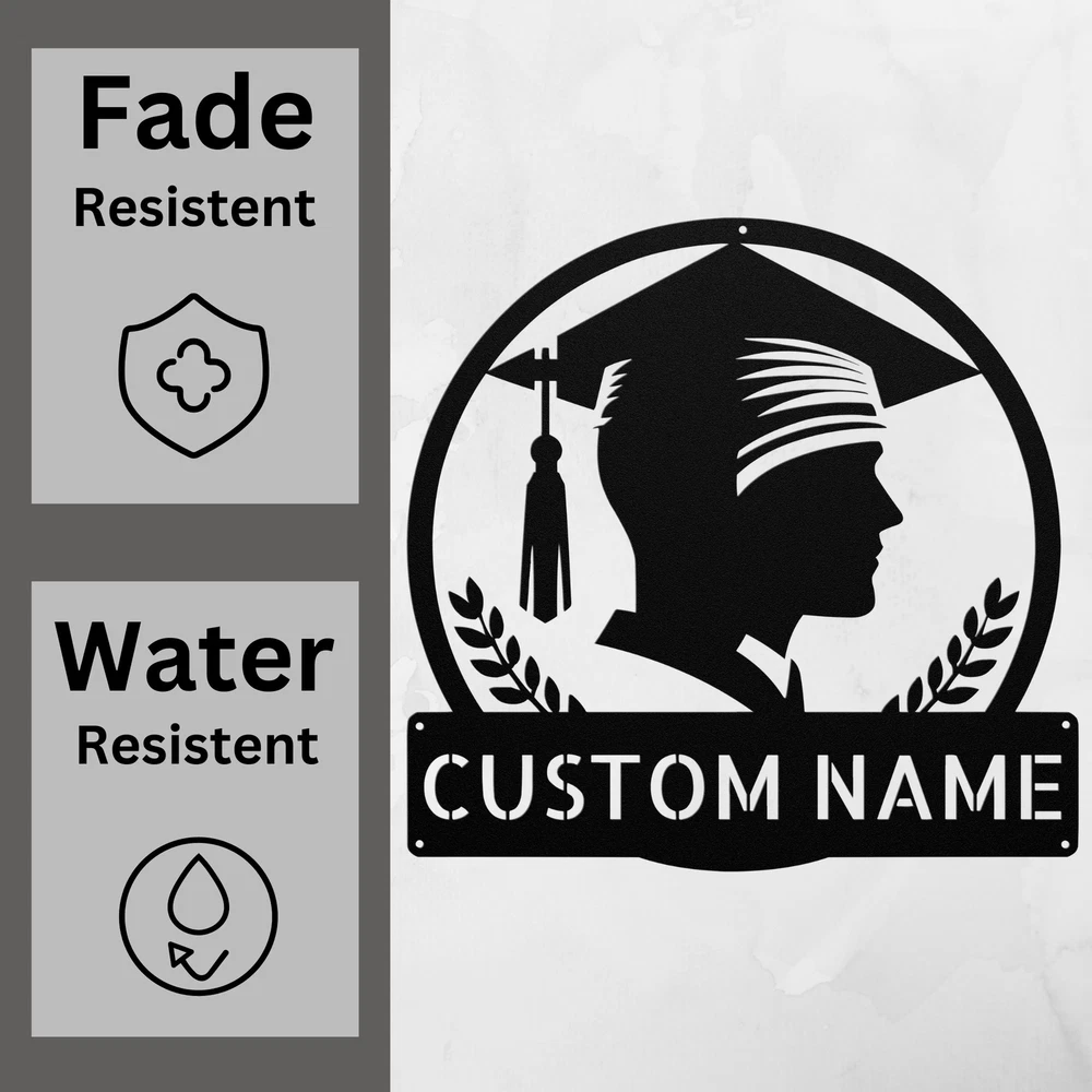 Product Description Personalized Boy Grad Cap Metal Sign Custom Graduation Decor Unique Gift Idea Celebrate a milestone achievement with the Personalized Boy Grad Cap Metal Sign ! This charming sign is a fantastic way to recognize a graduate and add a personal touch to any space. Crafted from 16 gauge high-quality metal , this sign is built to last. The powder coating provides excellent protection, making it dust, weather, and water-resistant for both indoor and outdoor display. Key features include: Customizable Design: Personalize with the graduate’s name and graduation year. Durable Construction: Made from high-quality metal for long-lasting use. Ideal Gift: Perfect for graduations, birthdays, or any special occasion. Stylish Decor: Great addition to home, office, or dorm room decoration. Honor the achievements of a special graduate with the Personalized Boy Grad Cap Metal Sign . It’s not just a decoration; it’s a treasured keepsake celebrating success! Service and Color Choice Our metal signs are designed to be personalized just for you, making them the perfect addition to any space! The default color for our signs is Black , but we also offer a variety of beautiful options including Copper, Gold, White, and Silver . After placing your order, simply contact us with your preferred color choice, and we'll ensure your sign is exactly how you envision it. Let’s create something special together!