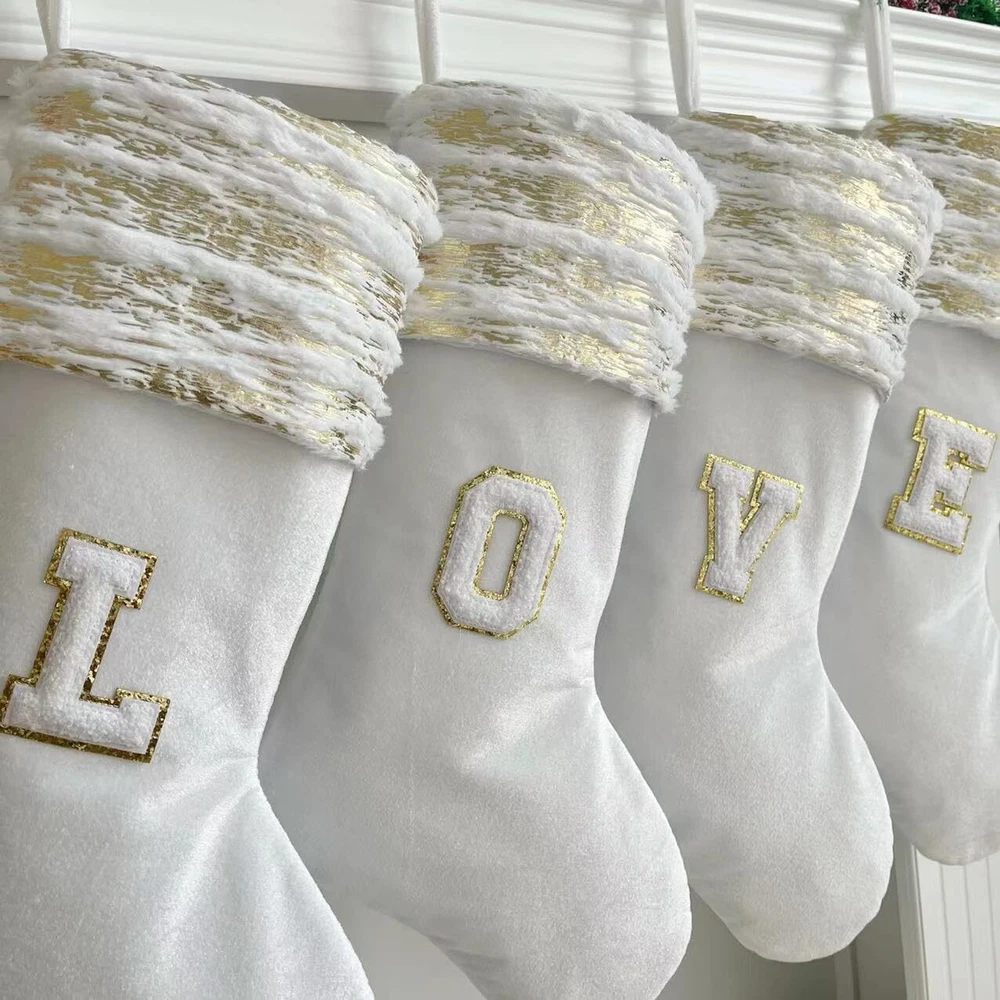 Personalized Cable Knitted Christmas Hanging Stocking Decorations with Name Tags Everyone loves Christmas. Every expect to get the gifts from Santa. Share the best wishes to your dear family, friends and others. Just start with choosing a nice Christmas stocking. Color: White Overall Height: 20 inches Feature: Everyone can enjoy a Christmas stocking with wooden name tags. Personalize the name or any text to capture the warmth of Christmas, you can freely write down anything you want to customize gifts for your children, family and friends, and pets Material: Christmas stockings are made of high quality Polyester and are strong and durable. White and gold fuzzy cable knit stockings with wooden tags, classic and innovative. Add traditional elements to your Christmas decorations .Get ready for the incoming XMAS Size: 20 inches Christmas stockings are large enough to hold many small toys, candy, gadgets and gifts for children, Imagine the screams, happiness and excitement of your lovely children when they find their Christmas-only presents with their names on them on Christmas morning Style: After you've stuffed your stocking with lots of Christmas presents, you can hang it up safely. Hook accessories can be selected in the customization information. Christmas stockings also bring warmth to children and adults, especially families Application: christmas white stockings are suitable for hanging fireplaces mantel, windows, wall, doors,banister,Christmas Tree, hotel, club, bar and so on. Christmas Stockings are large enough for small gift, candies or cookies, watch, folding wallet, ties, gift cards, small toy cars, etc