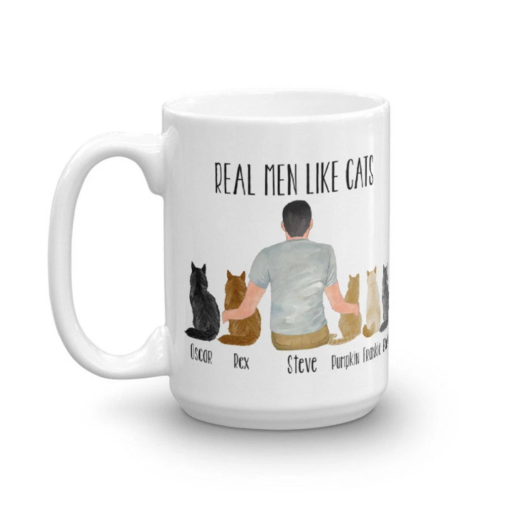 Personalized Cat Dad Gift Real Men Like Cats Mug Custom Cat Mug Gift For Cat Product Details.. This high quality 11oz. ceramic white mug has a premium hard coat that provides crisp and vibrant color reproduction sure to last for years. Perfect for all hot & cold beverages. The highest quality printing possible is used. It will never fade no matter how many times you wash it. Material: 100% Ceramic. Print both sides. Dishwasher and Microwave Safe. High Gloss + Premium White Finish. Printed in the U.S.A. Personalized & Custom. We support personalized and custom mug to add custom, when placing an order, you can add notes to the "order note" in shipping address section. Also you can contact us directly via message. Shipping Info. Ready to ship in 1 to 2 business days, All products are made-to-order and proudly printed in the United States. Shipped by USPS and DHL, You will receive your order in 5-7 days. Replace & Refund. All products are defective during shipping broken, chipped will be replaced free of charge. You are not satisfied with the product, we will refund 100% money to you. If any other issues arise, please do not hesitate to message, we would be more than happy to assist you.