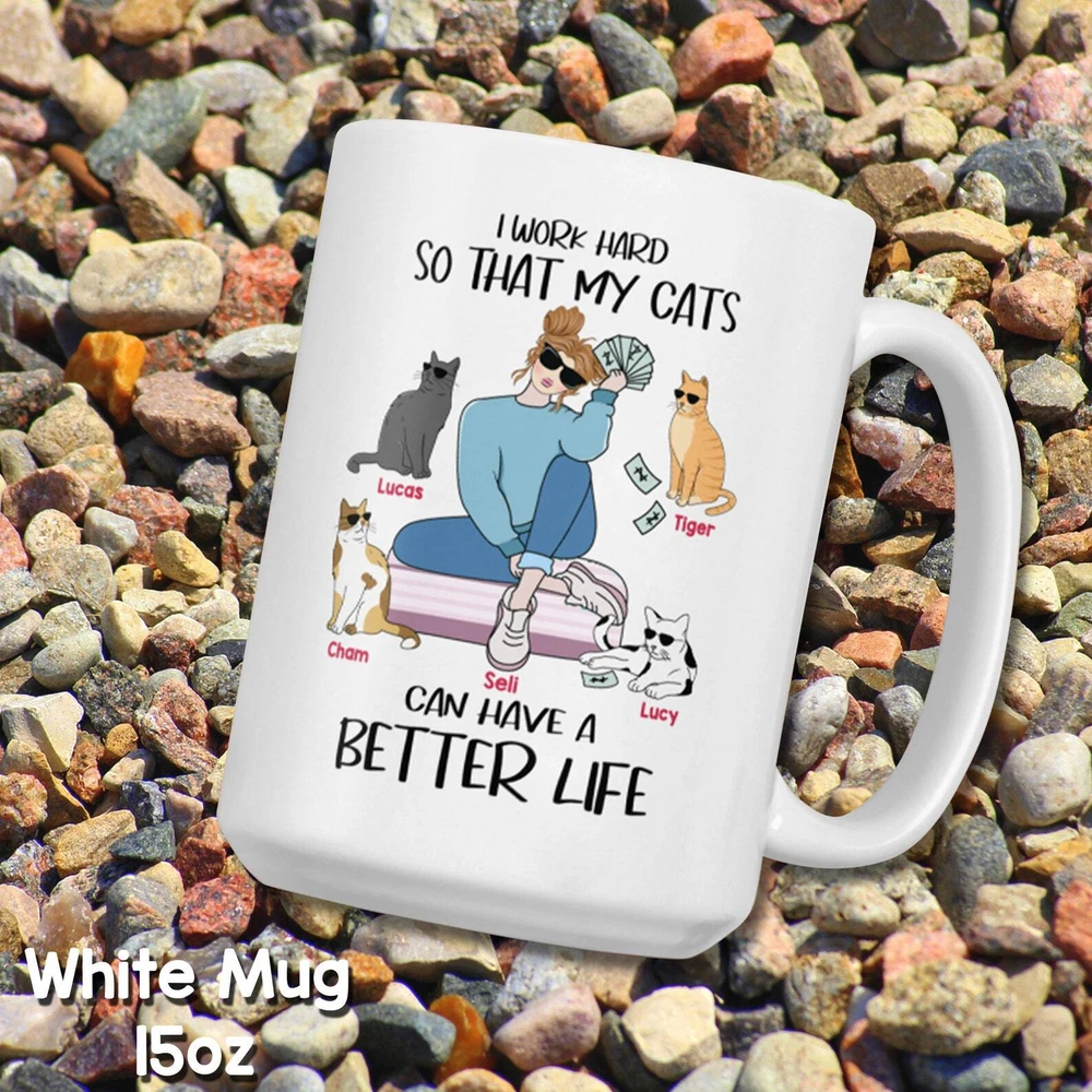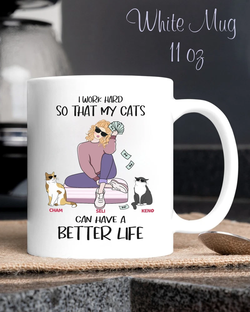 Personalized Cat Gifts I Work Hard So That My Cats Can Have A Better Life Crayzy Cat Lady Mugs Custom Cat Gifts Gifts For Cat Lovers Product Details.. This high quality 11oz. ceramic white mug has a premium hard coat that provides crisp and vibrant color reproduction sure to last for years. Perfect for all hot & cold beverages. The highest quality printing possible is used. It will never fade no matter how many times you wash it. Material: 100% Ceramic. Print both sides. Dishwasher and Microwave Safe. High Gloss + Premium White Finish. Printed in the U.S.A. Personalized & Custom. We support personalized and custom mug to add custom, when placing an order, you can add notes to the "order note" in shipping address section. Also you can contact us directly via message. Shipping Info. Ready to ship in 1 to 2 business days, All products are made-to-order and proudly printed in the United States. Shipped by USPS and DHL, You will receive your order in 5-7 days. Replace & Refund. All products are defective during shipping broken, chipped will be replaced free of charge. You are not satisfied with the product, we will refund 100% money to you. If any other issues arise, please do not hesitate to message, we would be more than happy to assist you.